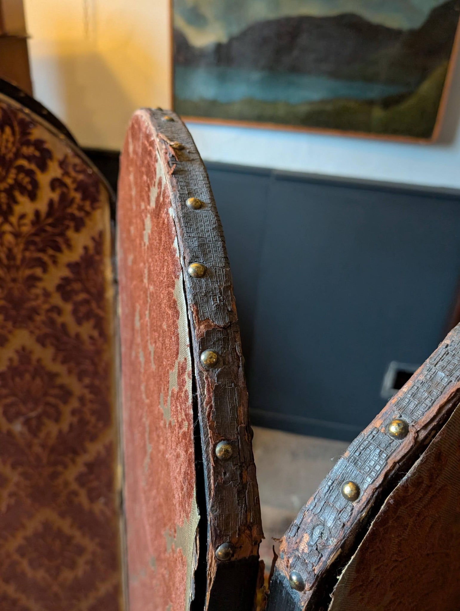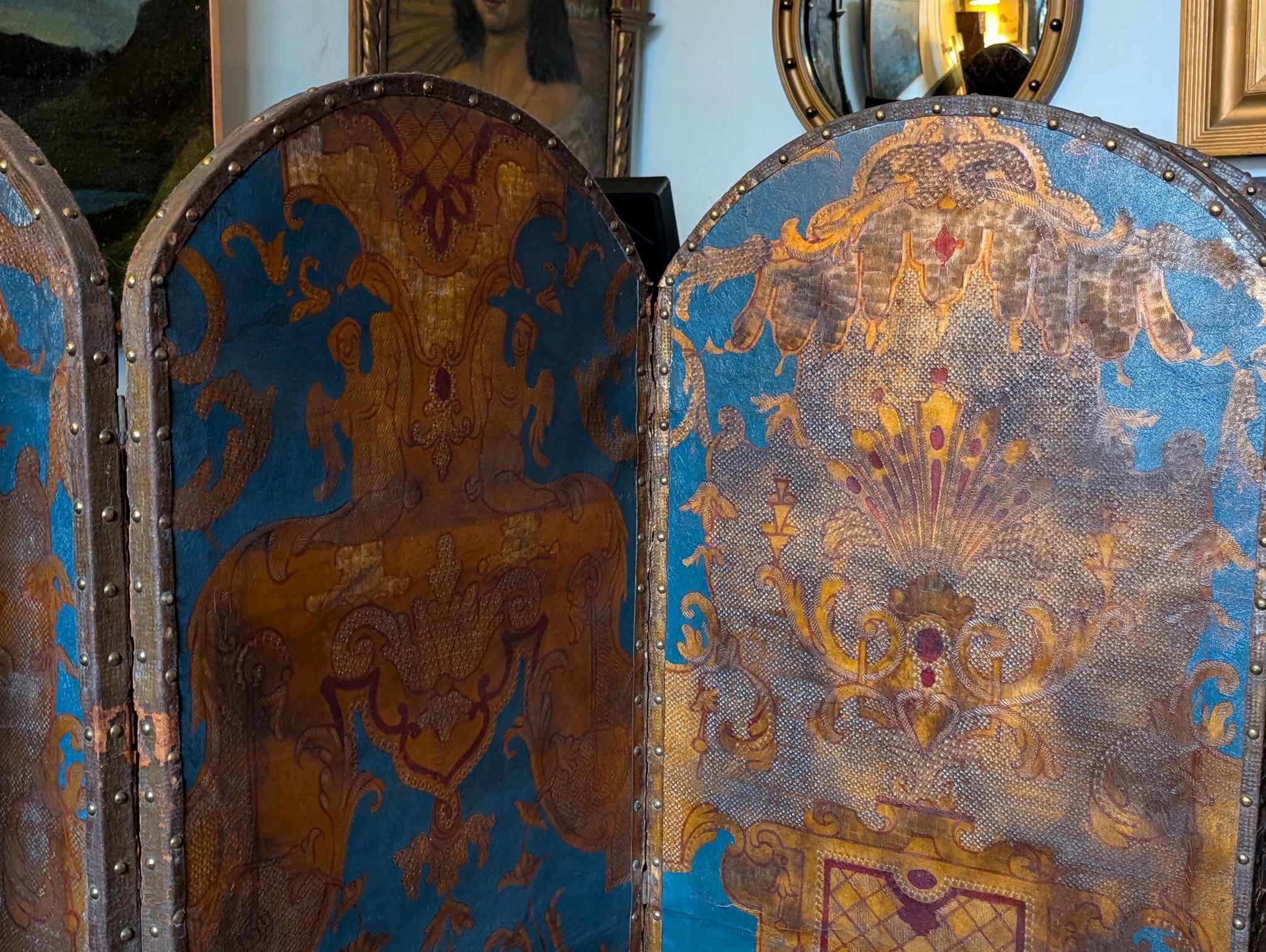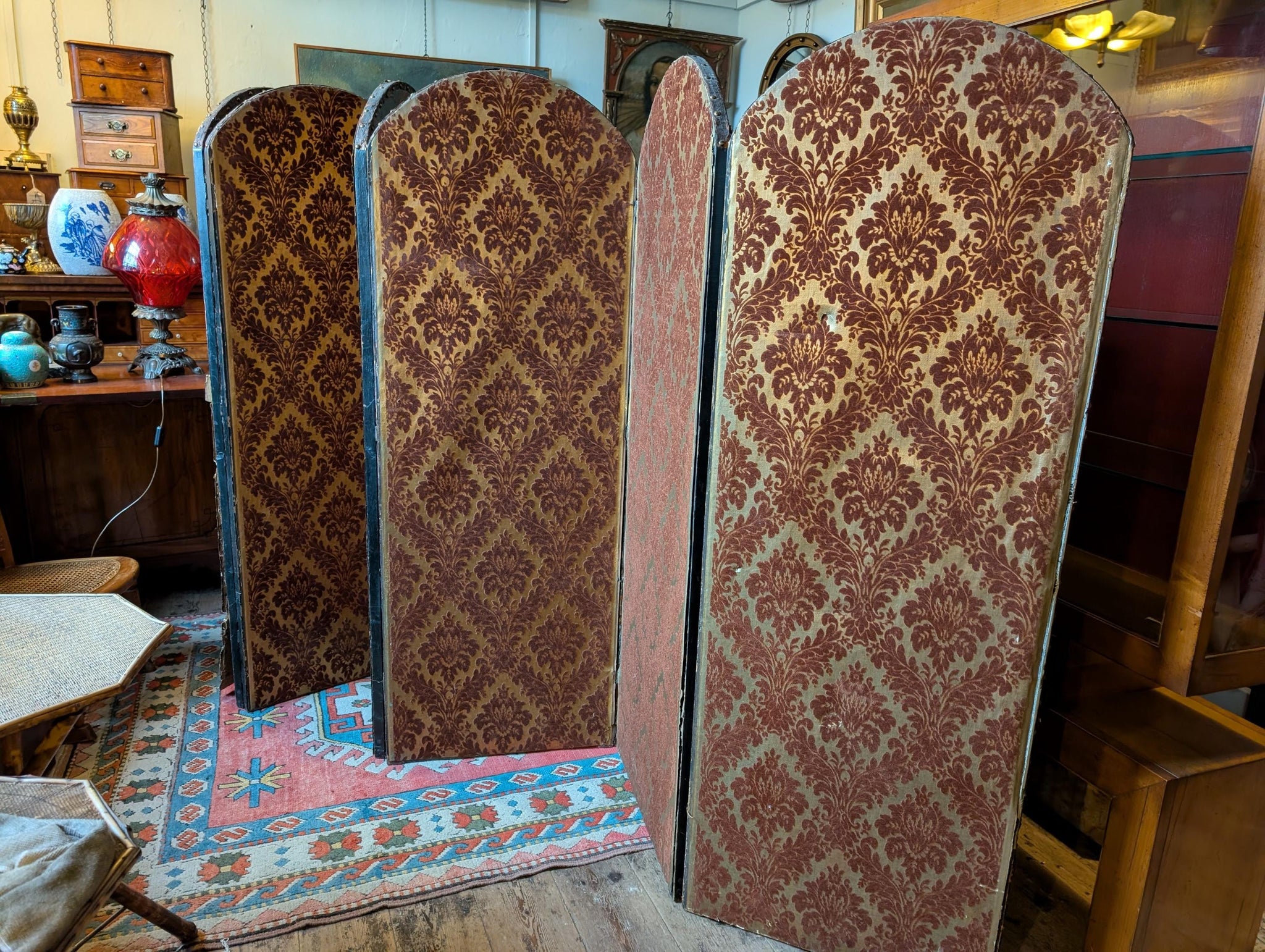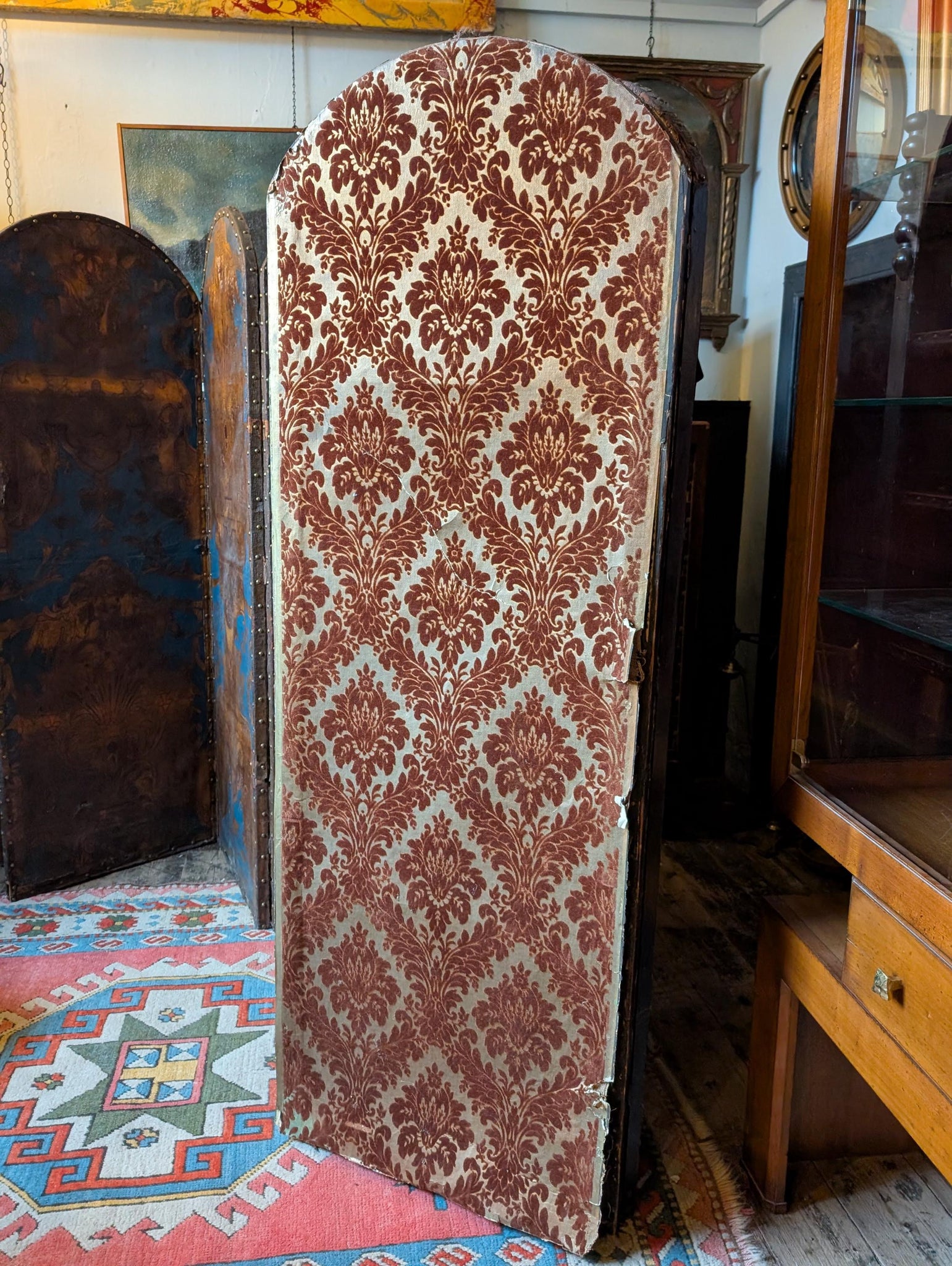 A seriously atmospheric antique folding screen with six arched panels, perfect as a room divider, backdrop, or statement corner piece. One side features a richly aged blue-and-gilt Baroque-style decorative scheme with wonderful patina and timeworn texture; the reverse is upholstered in a deep burgundy damask fabric for a softer, “old money” look. It’s the kind of piece that instantly gives a room that château / castlecore drama—brilliant for maximalist interiors, studios, boutiques, or as a theatrical prop.