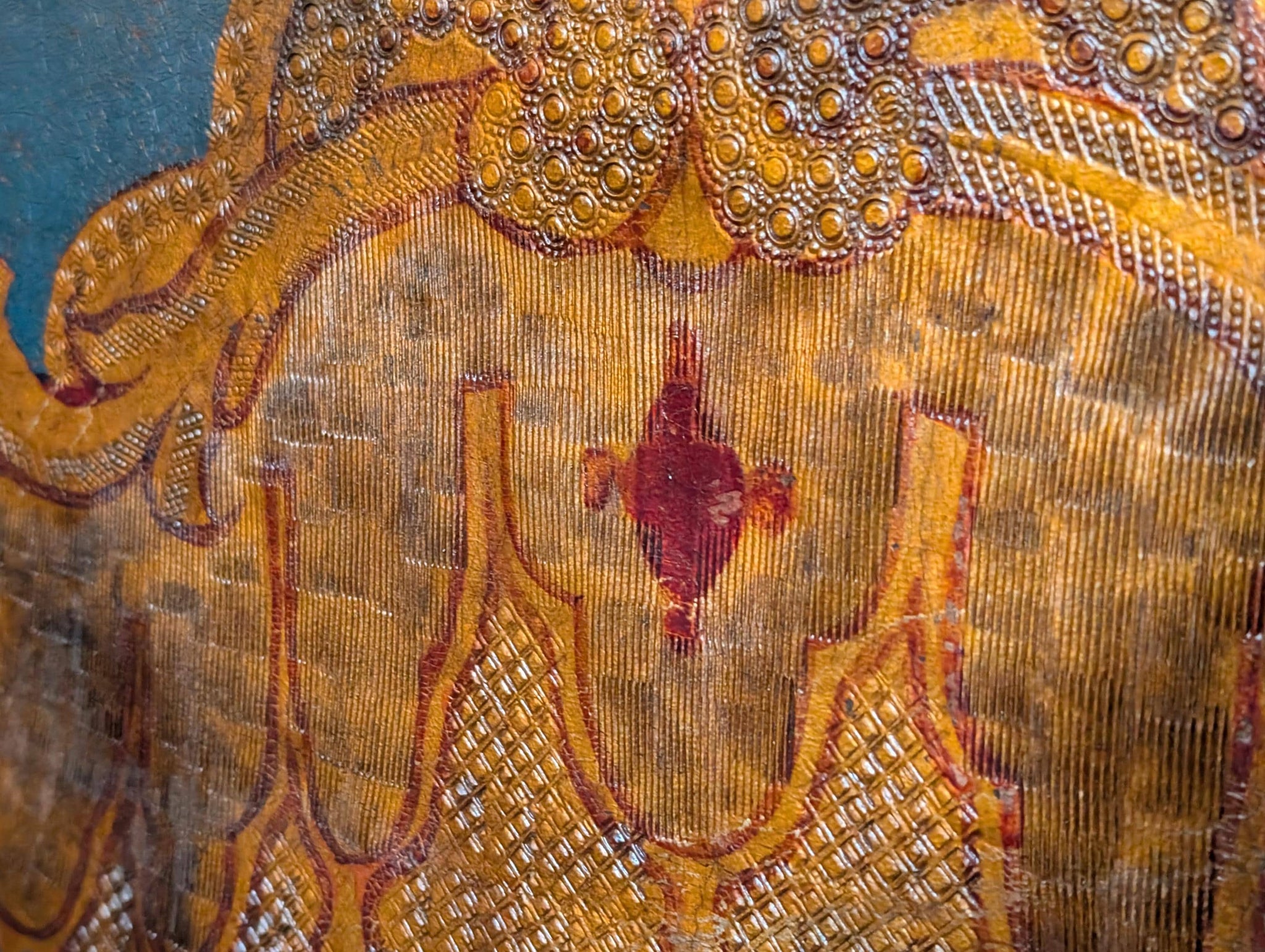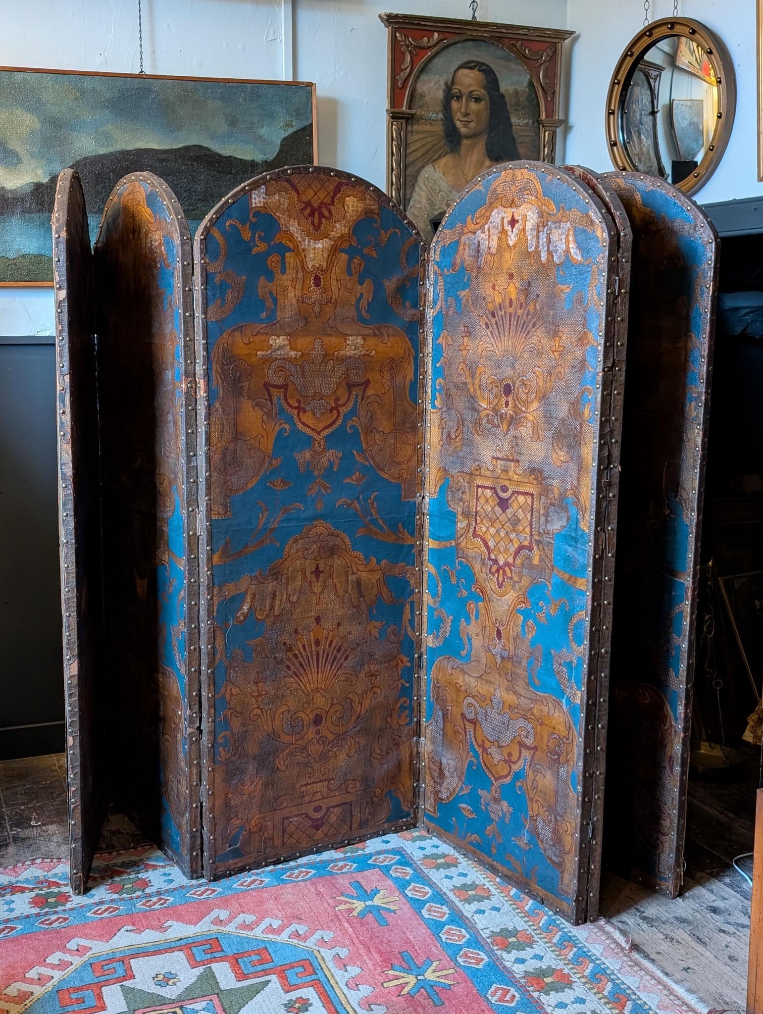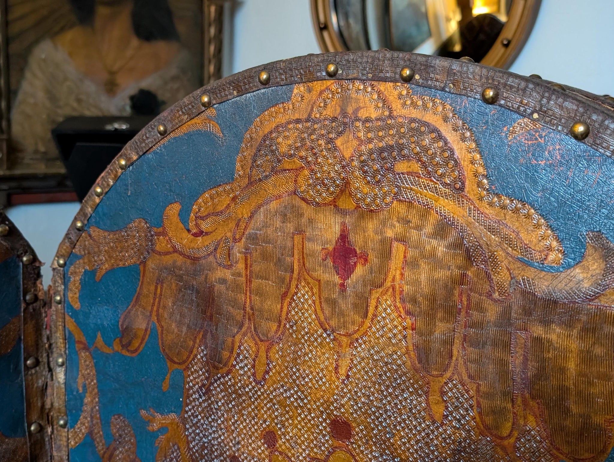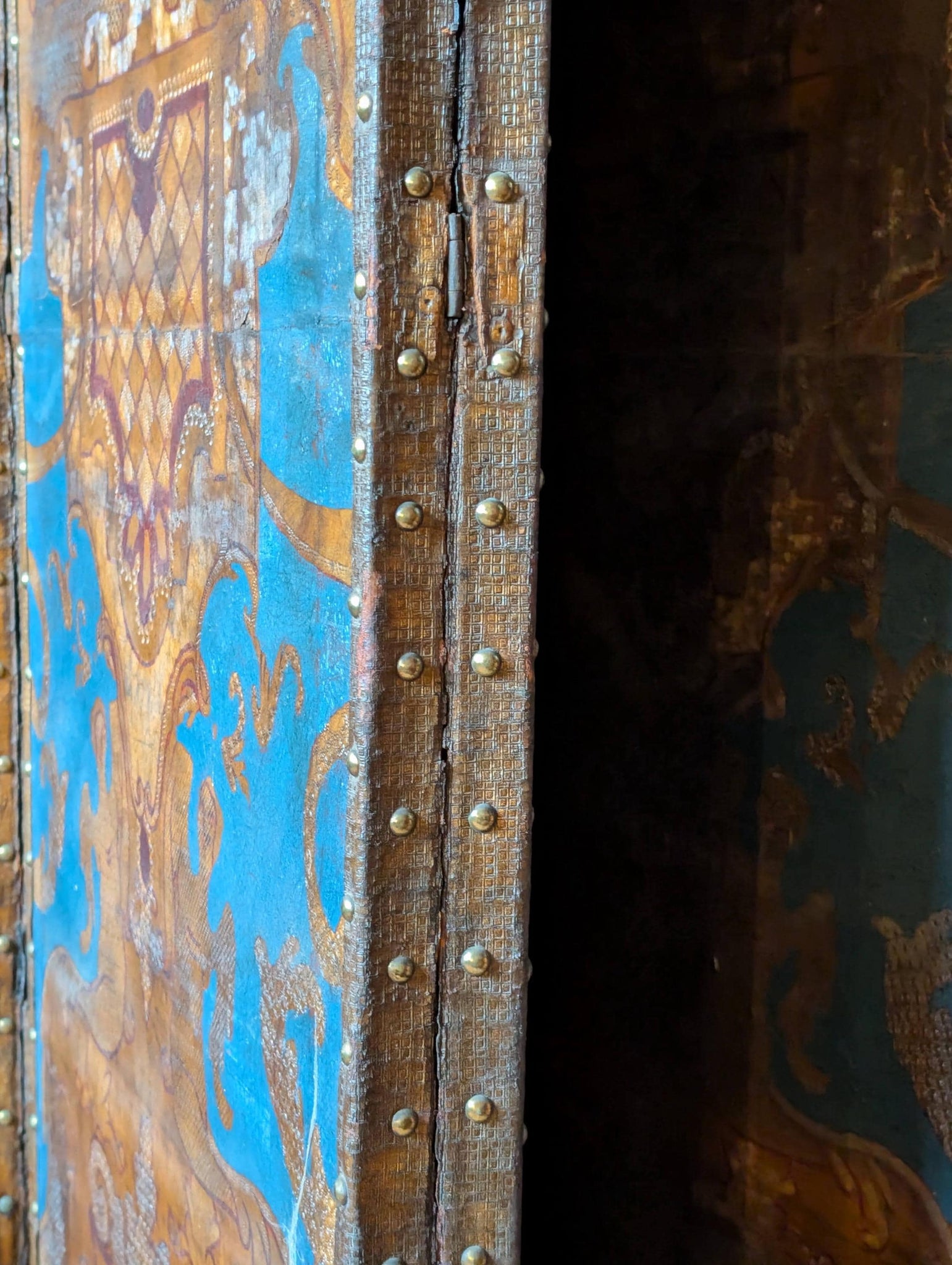 Condition is authentically aged with wear throughout, including surface rubbing and losses to the painted finish, edge wear around the studded borders, a few small tears on the fabric side. Structurally it presents well and folds as it should.