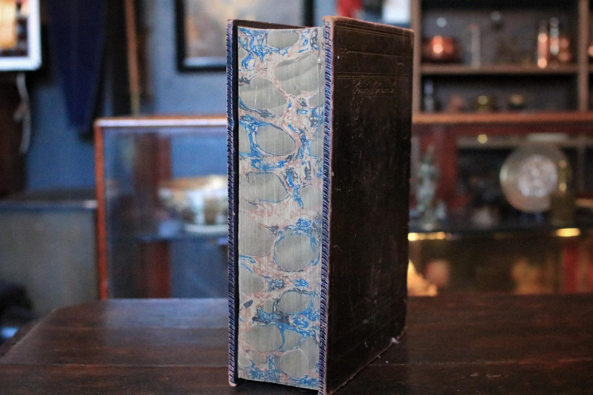 Solid antique condition with visible age wear—rubbing and scuffing to the leather, edge and corner wear, and handling marks to the boards and spine (as shown). Pages show typical age toning; overall a great display copy with tons of presence.