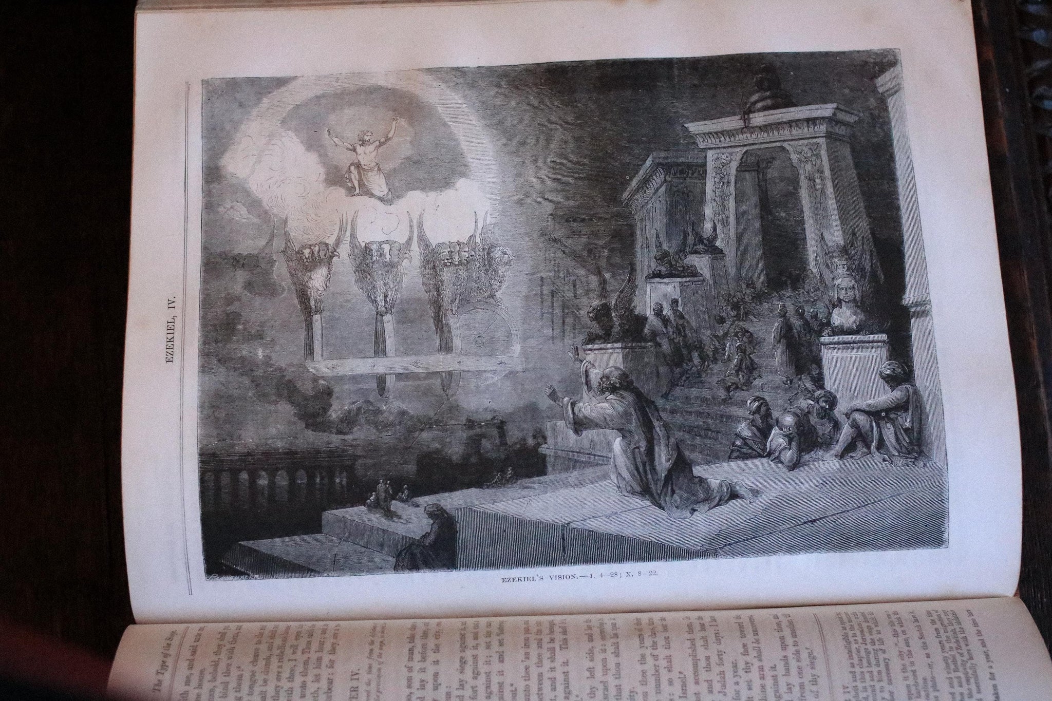 A handsome antique illustrated “family” Bible in a deep blue leather binding with gilt titling to the spine and decorative blind-stamped boards. Published by Cassell, Petter, and Galpin (London and New York), this edition includes the Old and New Testaments with references, critical/explanatory notes, a condensed concordance, and is famously illustrated with more than nine hundred engraved images throughout. It’s a brilliant piece for Dark Academia / Old Money library styling—the kind of statement book that instantly elevates a shelf, study, or console display.