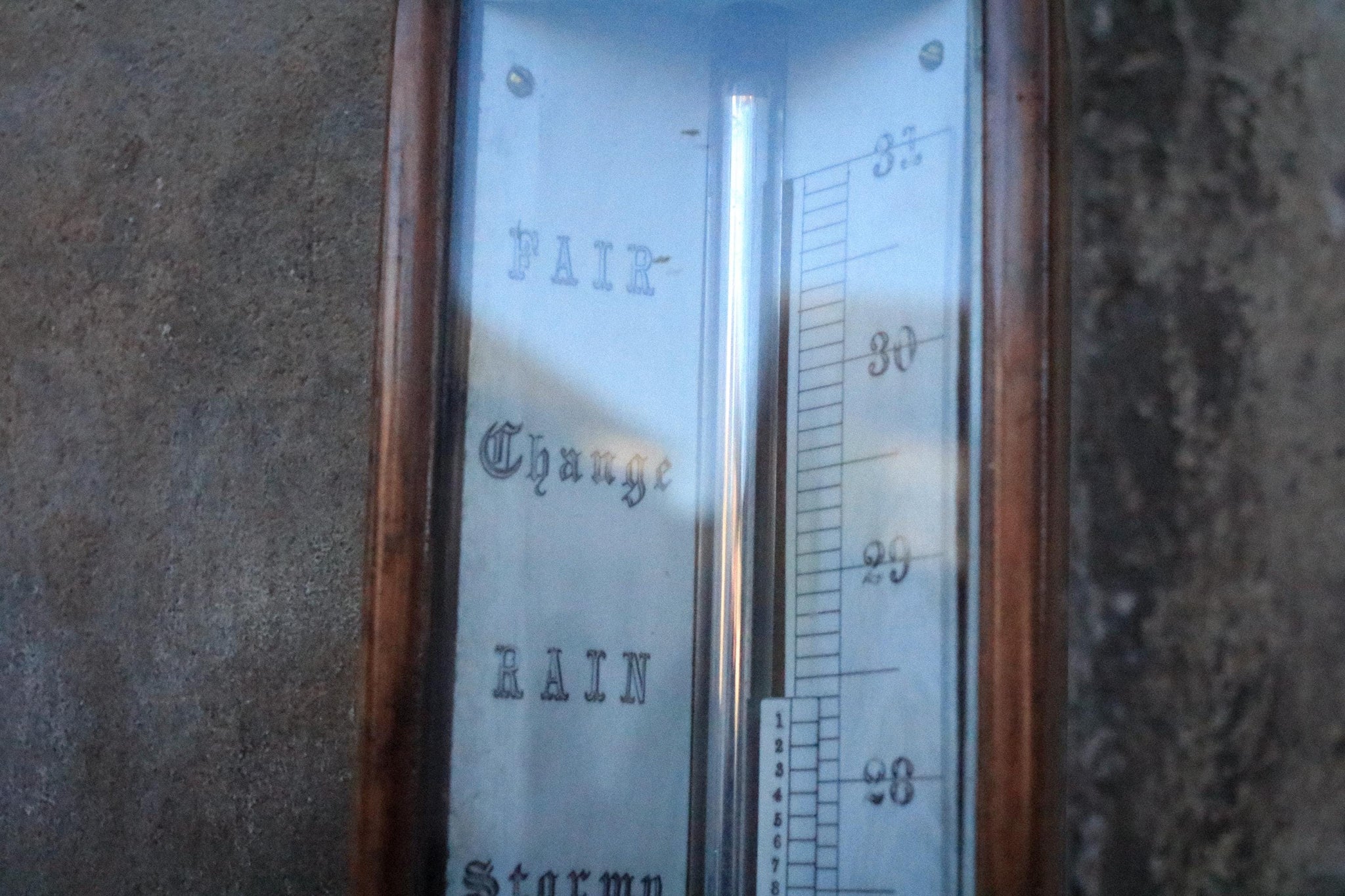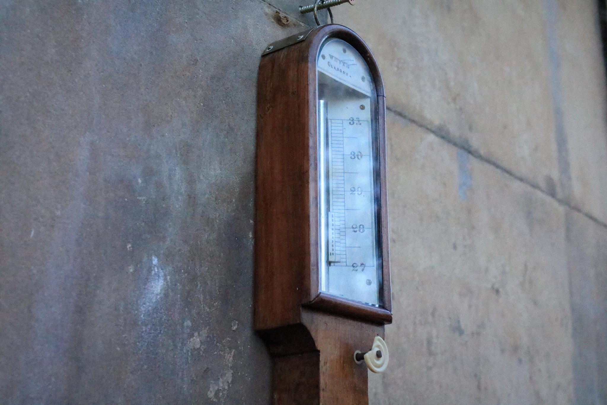 A handsome Victorian wall-mounted weather station with a tall hardwood backboard, arched glazed top case and brass cistern detail to the base. The dial is in the classic “Fair / Change / Rain / Stormy” format and it’s got that proper old-library, country-house look that works beautifully in Dark Academia / Old Money / Heritage interiors—perfect in a hallway, study, boot room or beside a fireplace.