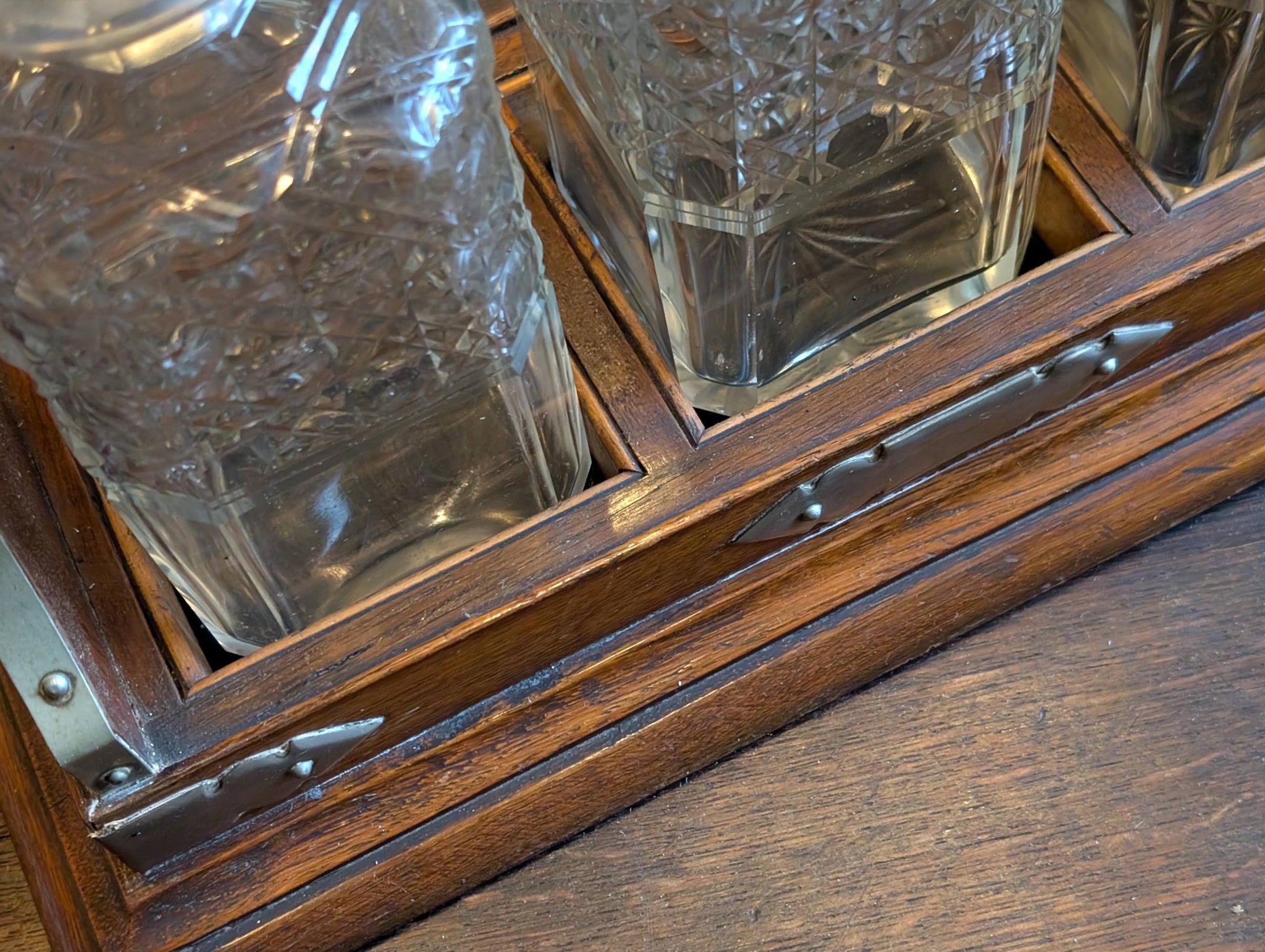 In good antique condition overall. The glass is bright with no cracks or clouding, just the usual tiny nibble or two to high points and stopper rims you would expect from age and use. Brass and oak show gentle patina, light surface marks and minor wear, all adding to the character. A lovely, usable set for a drinks trolley, cocktail cabinet or gentleman’s study.