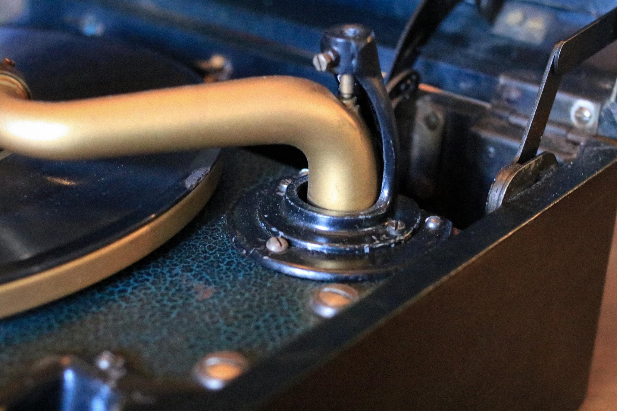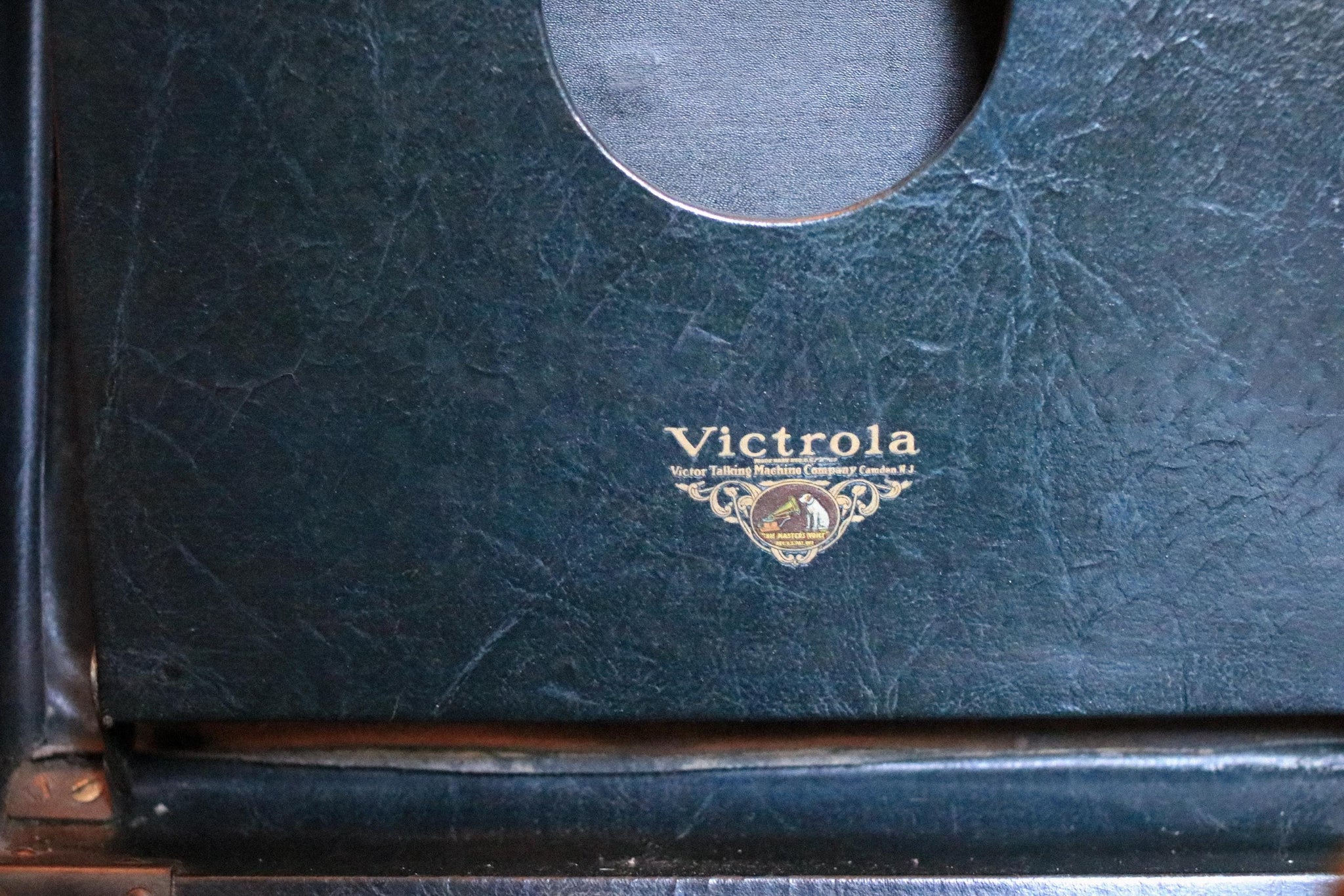 A fantastic authentic Victrola portable wind-up gramophone in its original case, complete with brass tonearm and Victrola soundbox, and supplied with 3 records. This is a wonderfully atmospheric piece with real presence, equally good as a usable talking machine and as display in a music room, study, bar or library. The dark case, gilt branding and warm metal fittings give it that strong old-world look that works brilliantly with dark academia, old money and collected interiors.