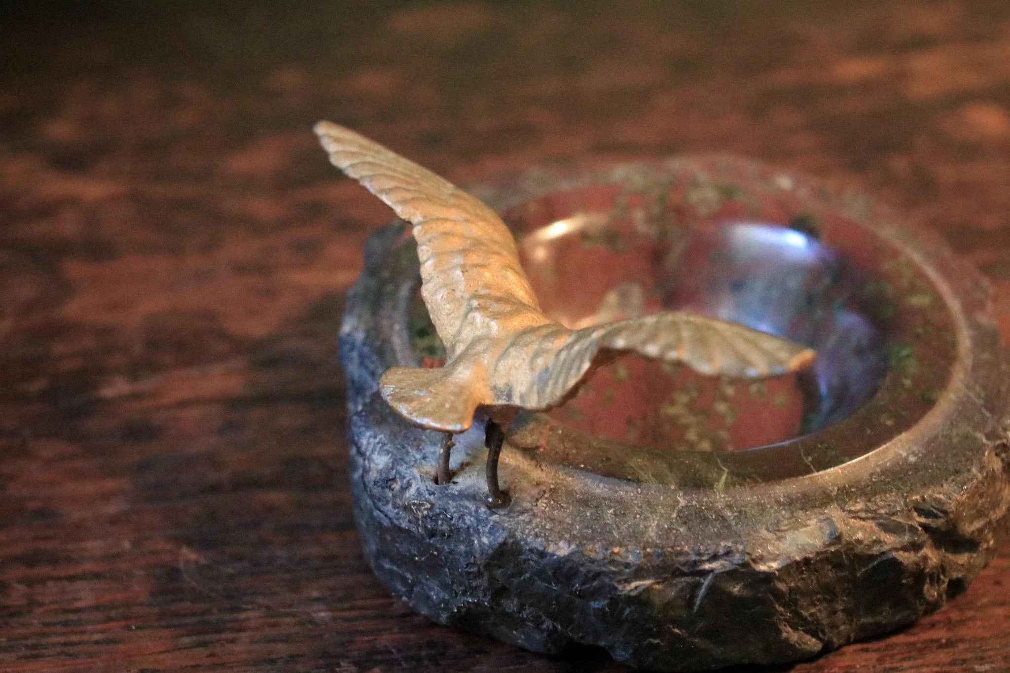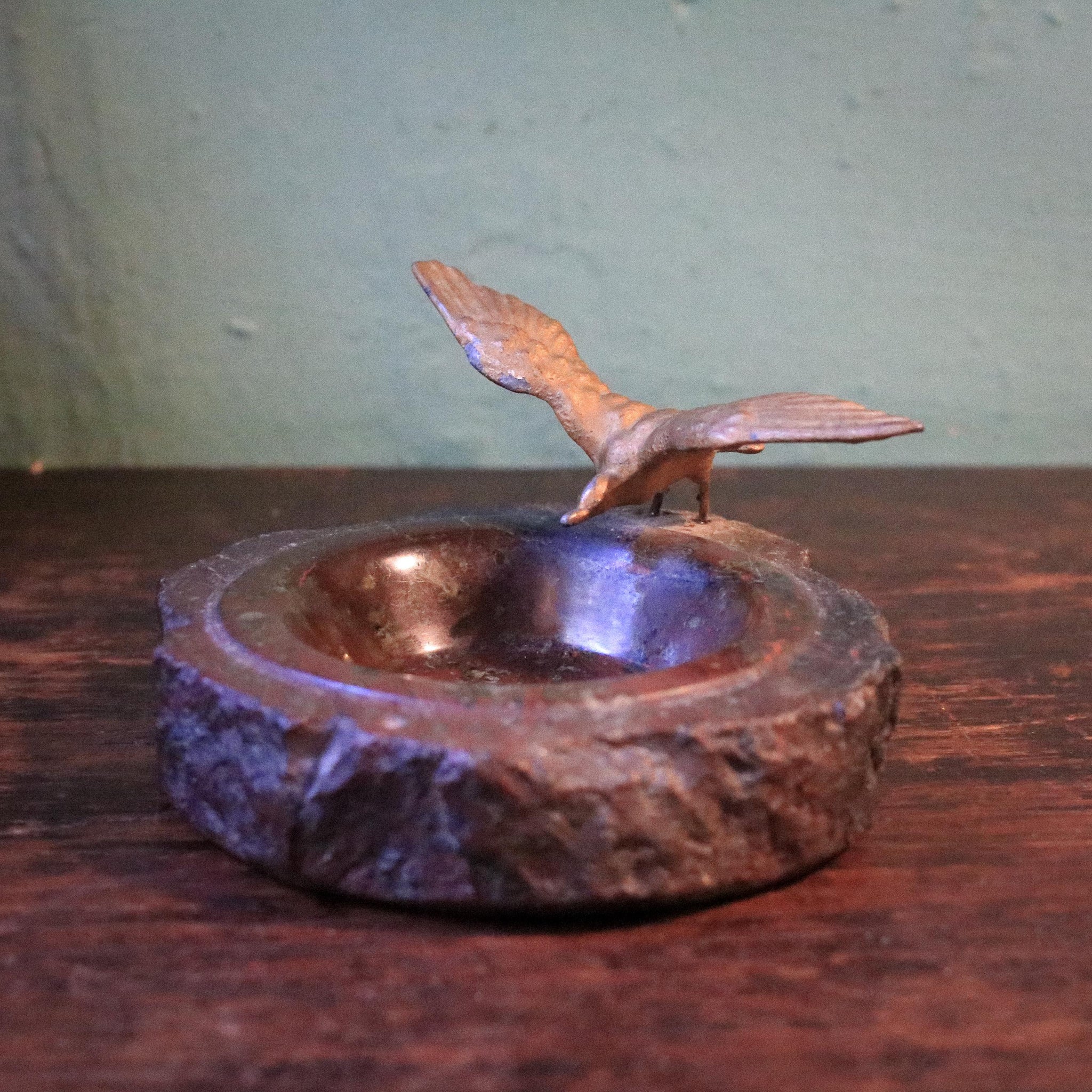 A characterful small desk piece: a hand-cast bronze seabird poised on a rough-hewn stone dish with a smooth, cupped well. The stone has a naturally rugged edge and mottled surface; the bird shows lovely hammering and timeworn patina.