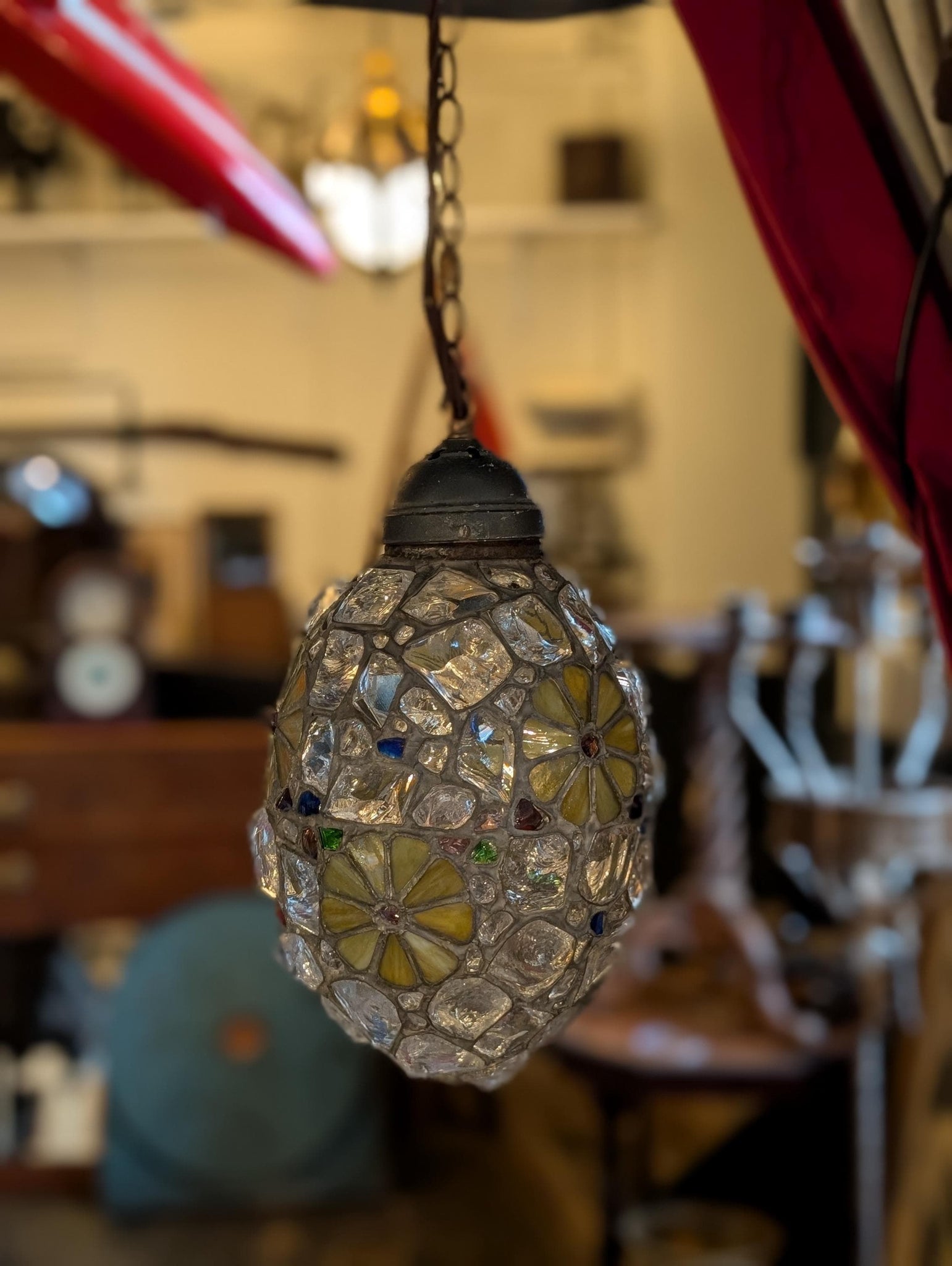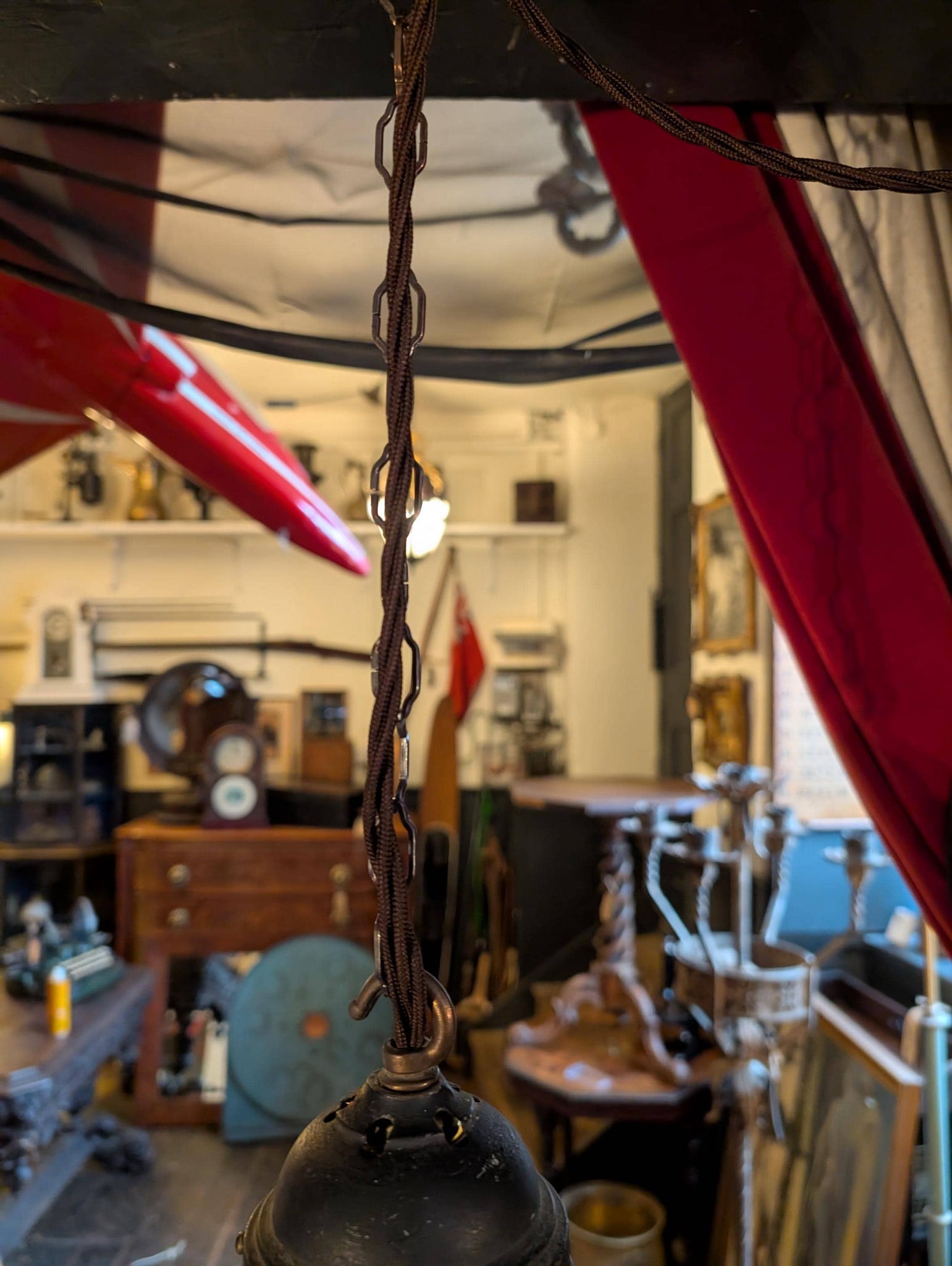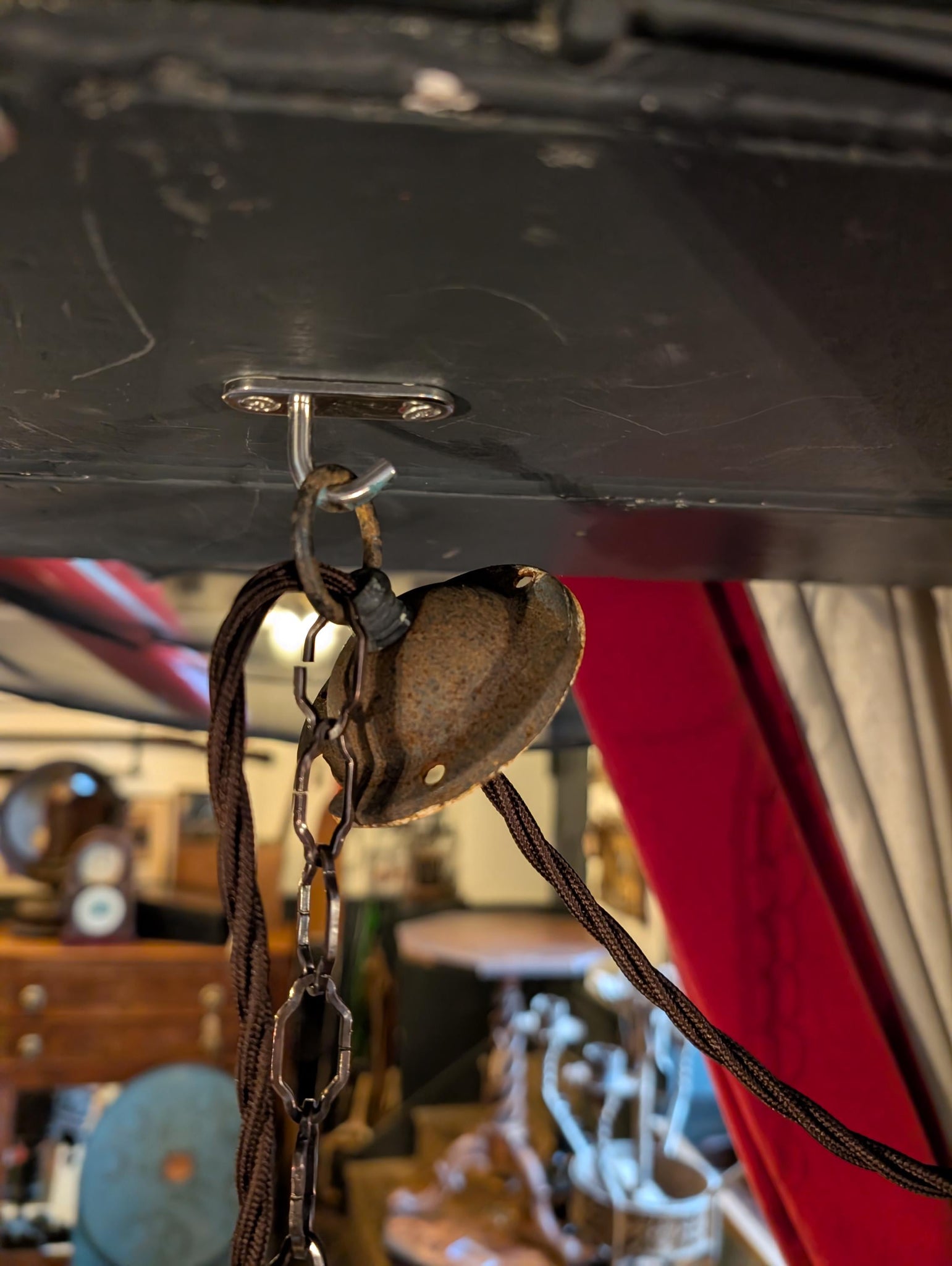 Recently rewired with modern braided flex and a new bulb holder for safe everyday use. The light itself measures approximately 30 cm from the gallery hook to the bottom of the shade. Shown hanging on a shop hook/chain; supplied exactly as pictured. Drop can be adjusted as required. let me know. There’s a small bit of damage that you can see in one of the photos —present but not attention-grabbing once hung.