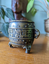 A small crisply cast golden colored bronze censer with elephant handles and archaic design. The heavy golden colored bronze has been cast with three elephant feet and a pair of matching elephant handles. The casting is deep and precise. There is a band in the middle of the body with an archaic design of a dragon surrounded by a key fret ground. Above and below this band are round cast studs. These round studs are not the same pattern and show a front and back. The base is flat and has a deeply cast reign mark in the center. There is a band at the mouth and a wide band at the base with the elephant feet. There is a Xuande reign mark cast into the base.