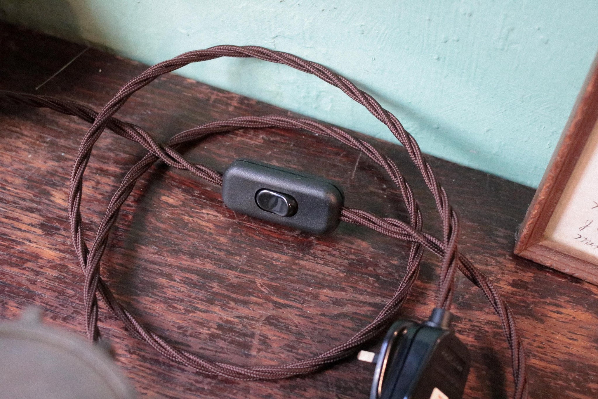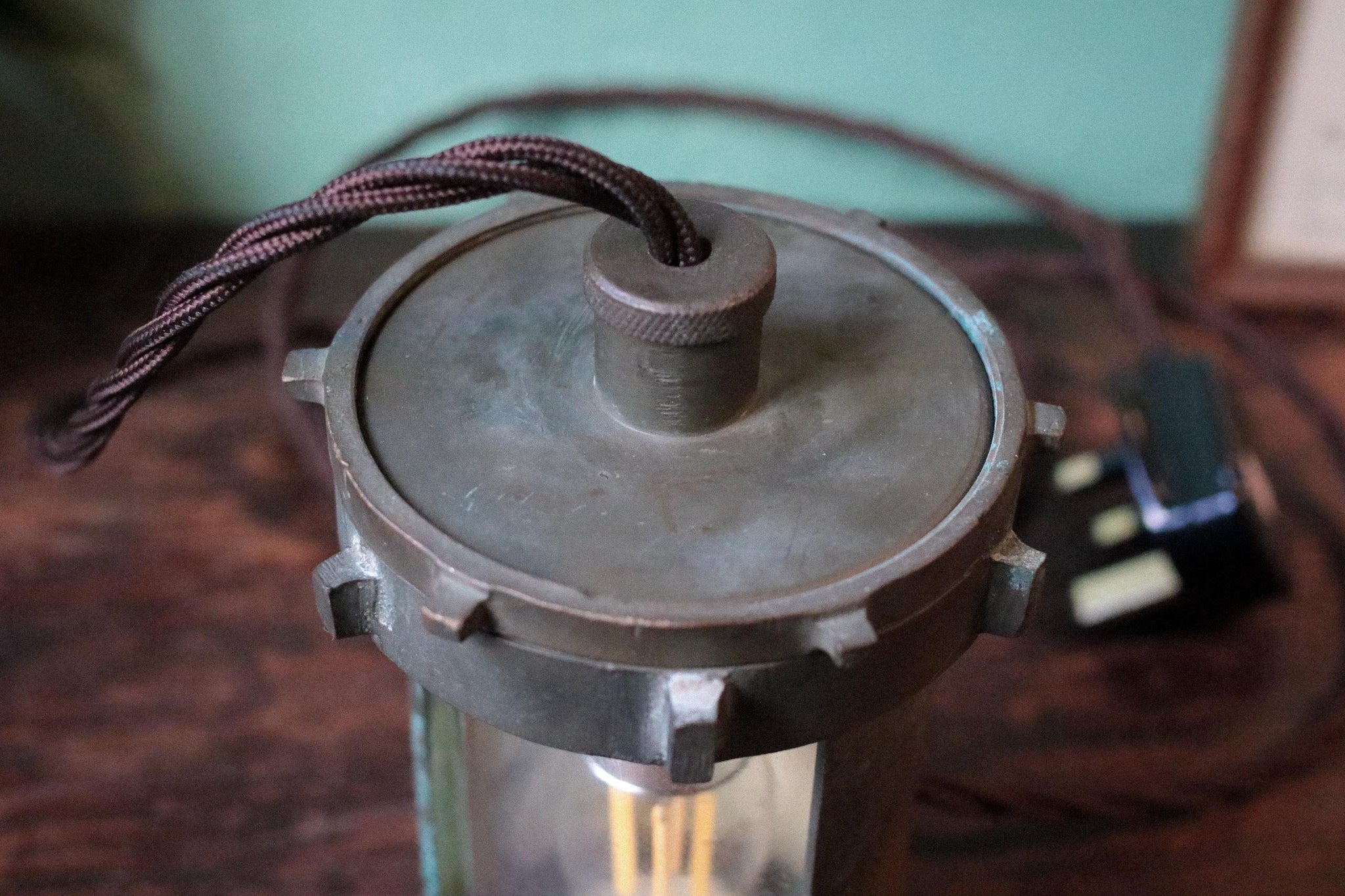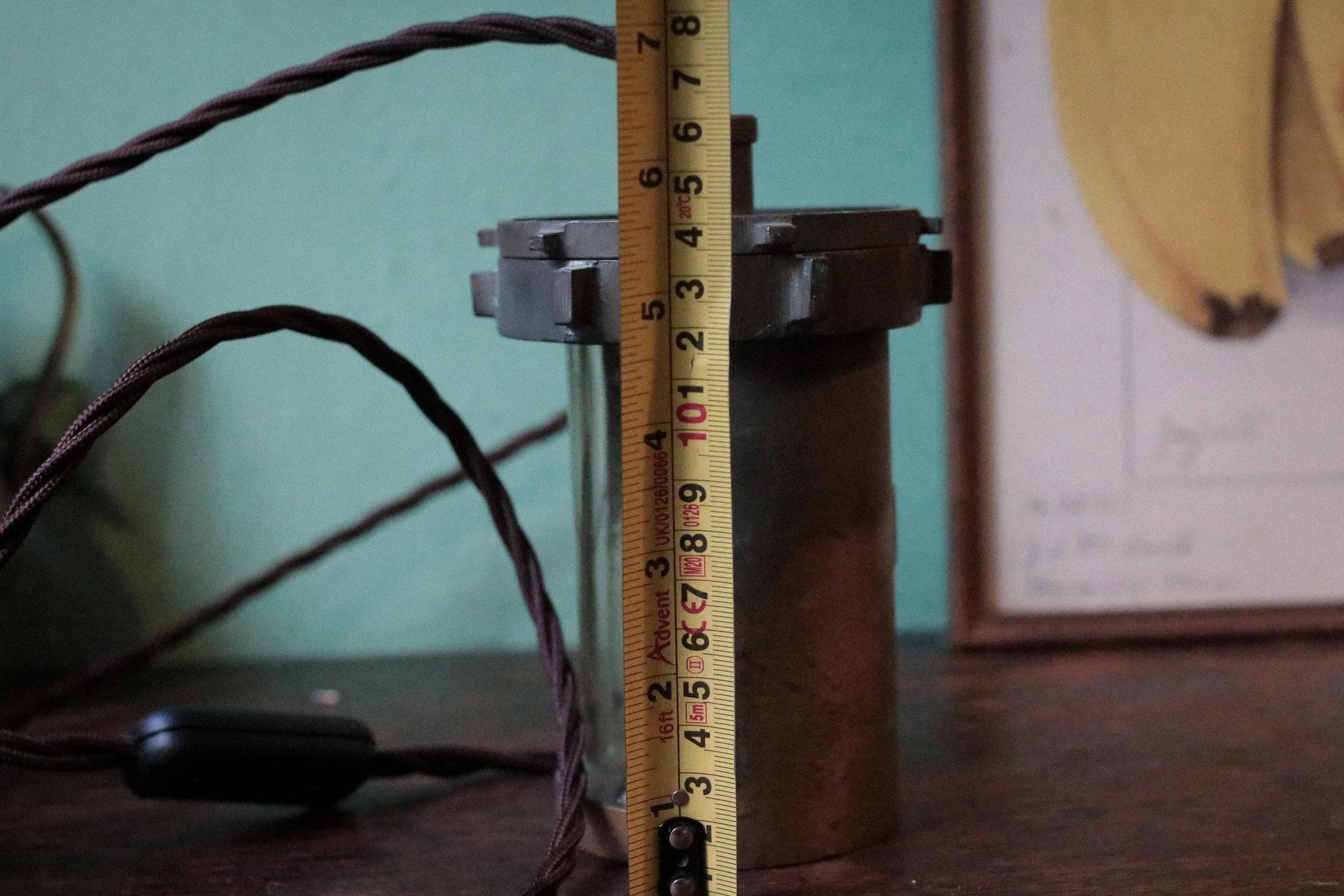 Compact naval passage light salvaged from a ship and newly converted for domestic use. The heavy cylindrical brass body with castellated lid and side mounting lug retains a great sea-worn patina and a curved glass viewing slot that throws a dramatic vertical beam when lit. It’s been professionally rewired with braided flex, an inline switch, a new bulb holder and UK plug.