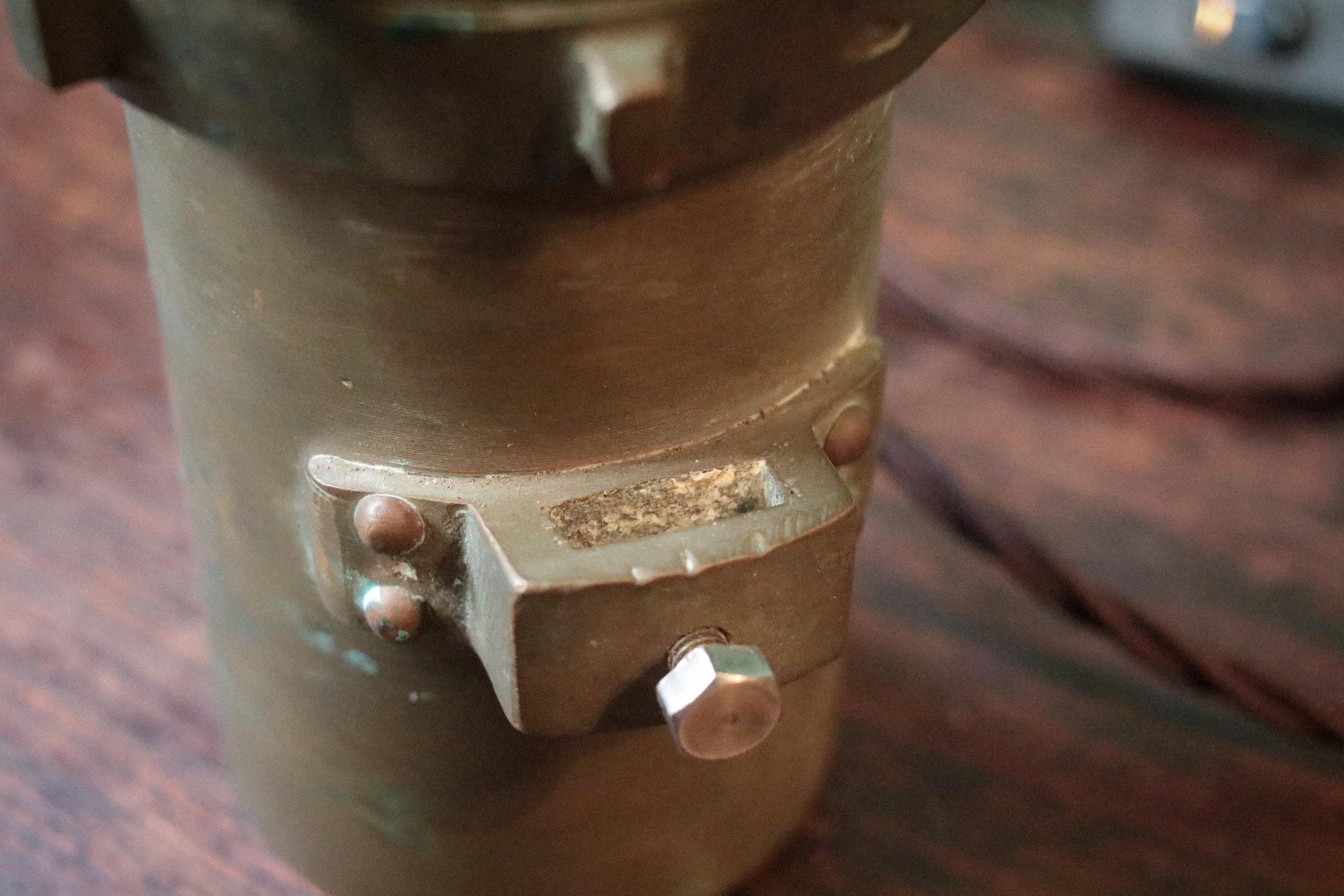 Stands approximately 16 cm high and about 8.5 cm diameter. Honest signs of service with dings, verdigris and surface marks as expected; displays superbly on a desk, shelf or bedside and brings authentic ship-room mood to any space.