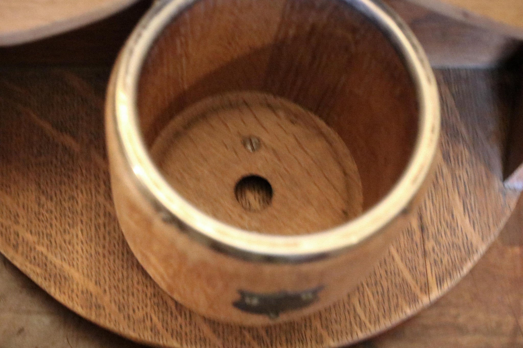 A handsome late Victorian or Edwardian oak smoker’s cabinet with brass shield mounts, pipe rack, and a revolving interior base. The cabinet opens to reveal its original wooden lidded tobacco jar, sitting on a rotating base flanked by curved slots for pipe storage. The upper compartment lifts to reveal further storage, likely for matches or accessories, and retains its original black metal hinge mechanism.