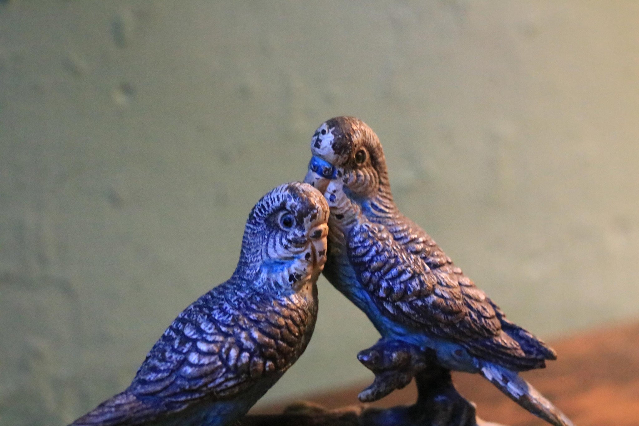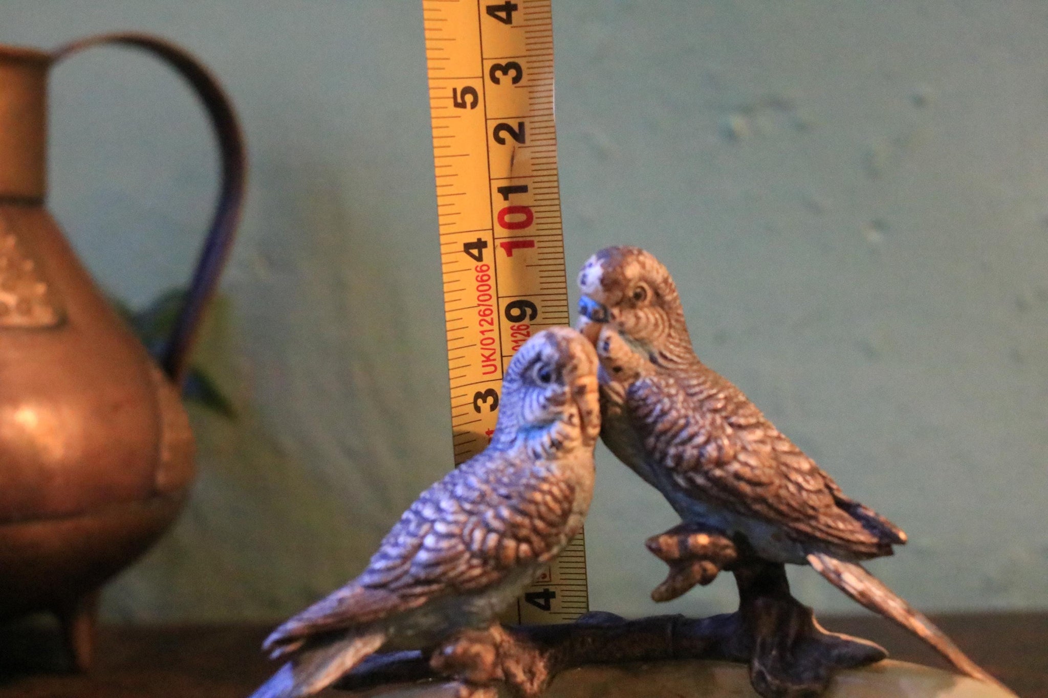 A charming vintage dish featuring two budgerigars perched on a branch above a circular green onyx bowl. The birds are finely cast bronze (or similar alloy) with crisp feather detail and traces of original cold-painted colour in soft blues and browns; the onyx has attractive amber and cream veining and a smoothly scooped well, making it ideal as a ring dish, trinket dish, or desk tidy.