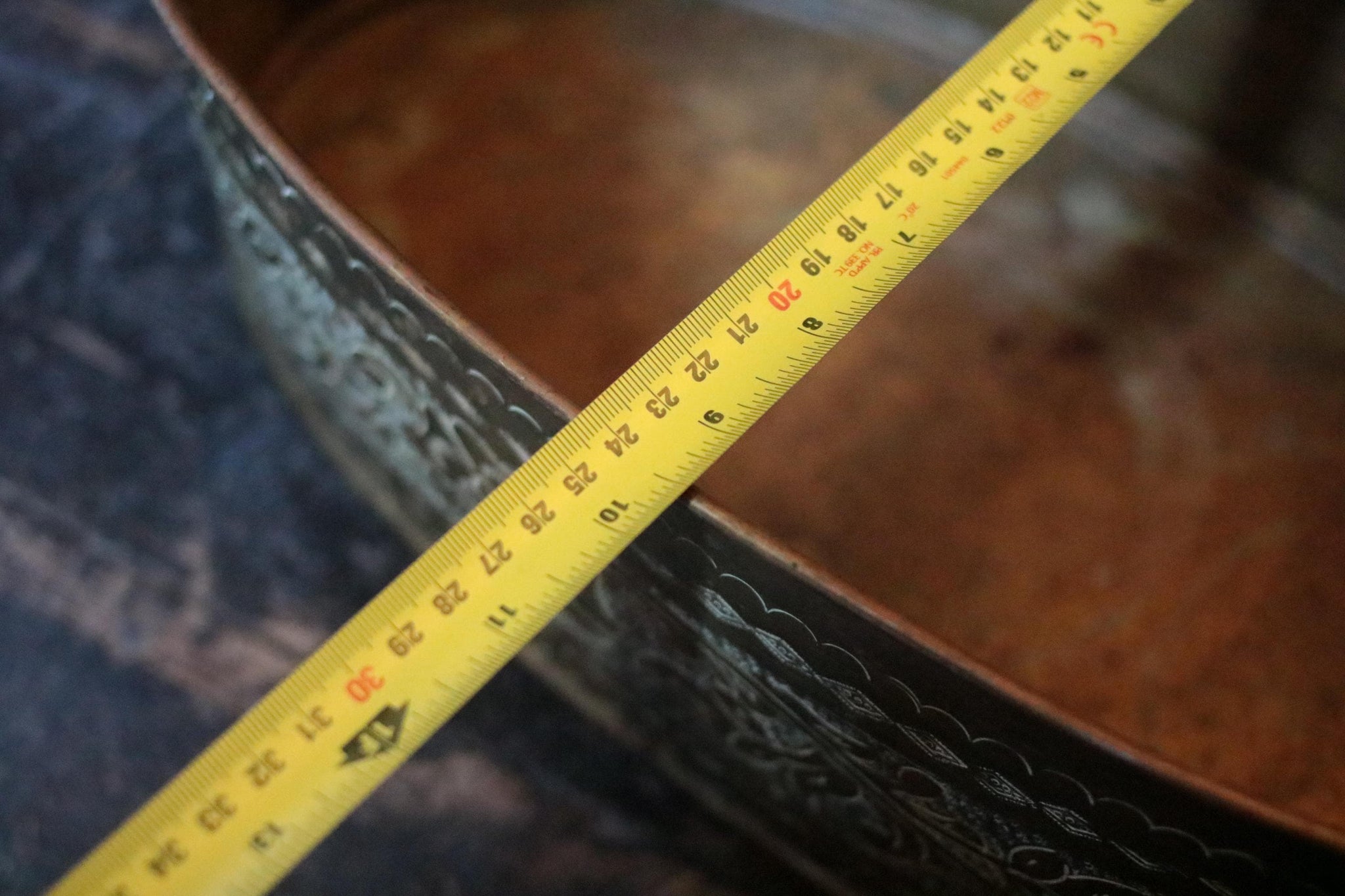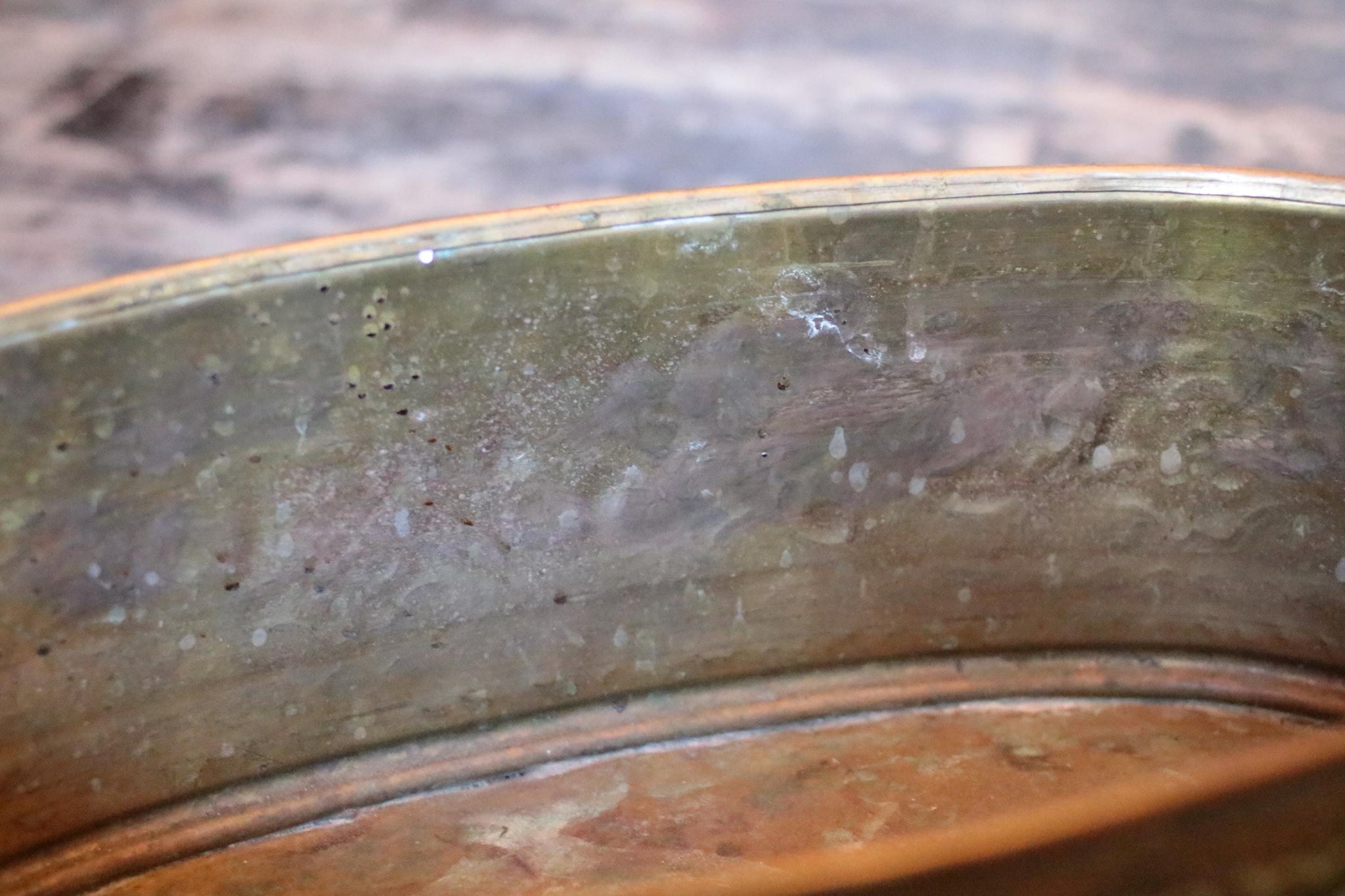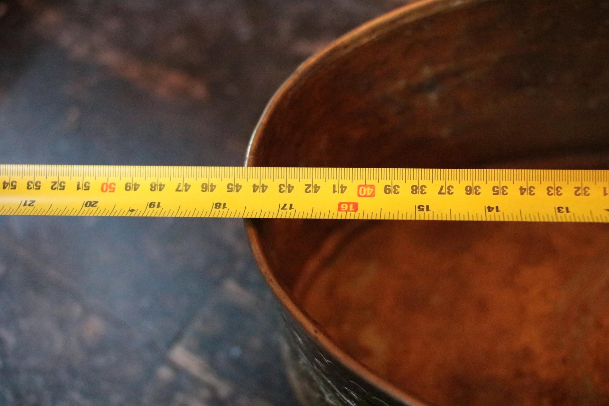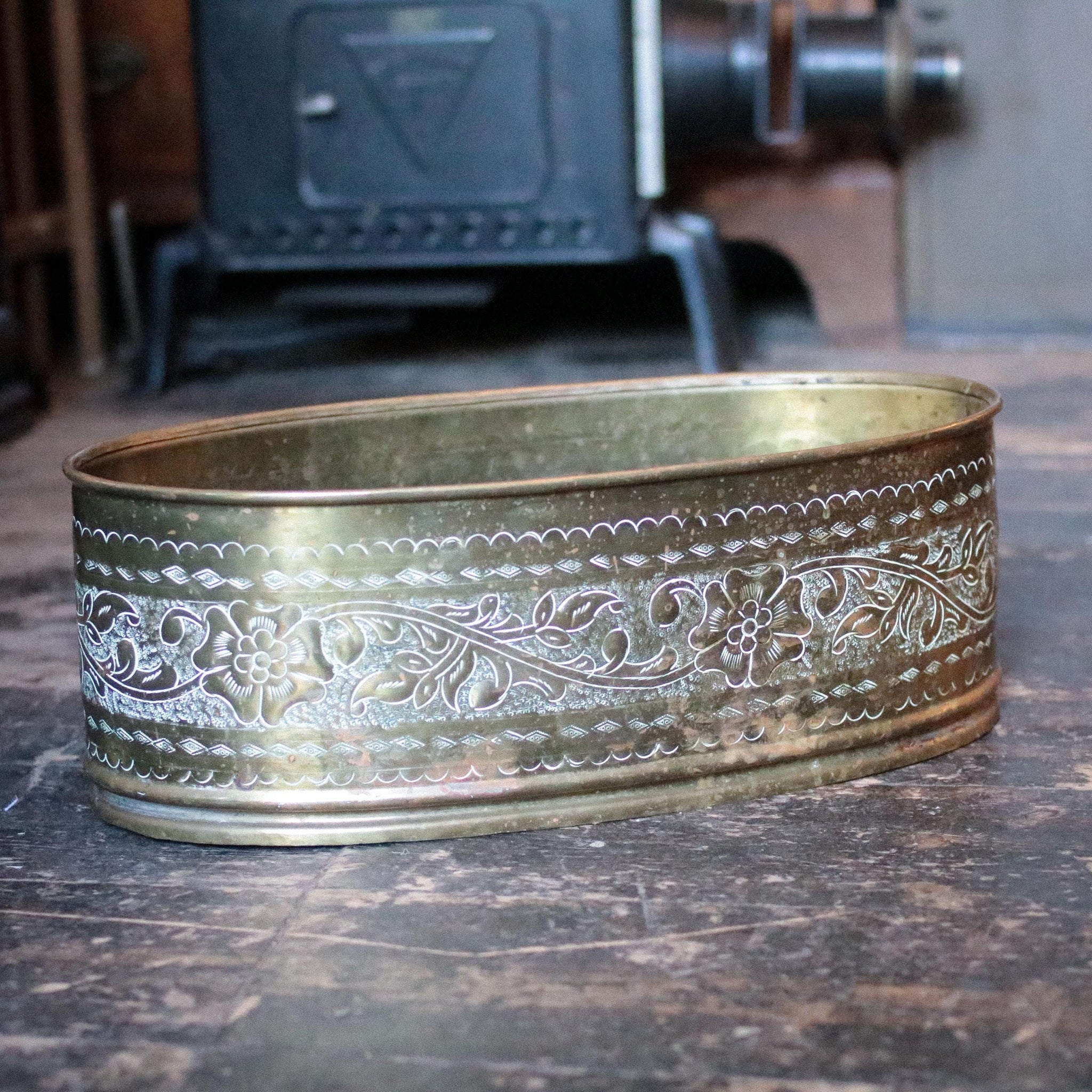 Condition is vintage with age-related tarnish, light pitting to the interior, and general surface wear from real use. No structural issues. Watertight enough for a liner or nursery pots dropped straight in (which is how these were usually used, so you don’t have to plant directly into the metal).
