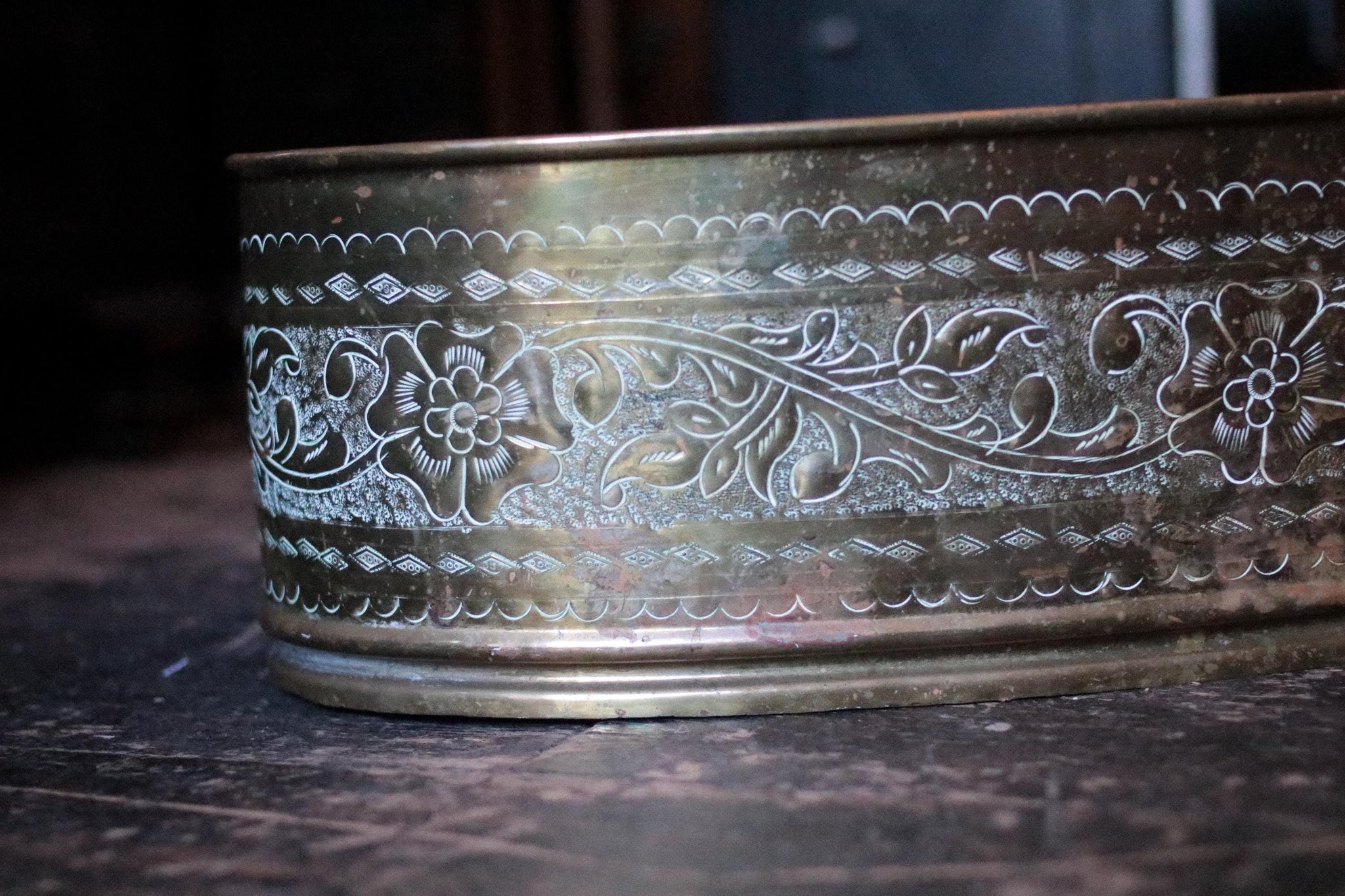 Beautiful oval brass planter with hand-chased floral and foliate scrollwork running all the way around the body, sitting on a rolled foot with a softly domed base. The metal shows a deep, honest patina with a mix of brass glow and darker oxidised tones, plus mineral spotting and water marks inside from years of use as a planter. No nonsense reproduction shine here – it has that proper old country house look you can’t fake.