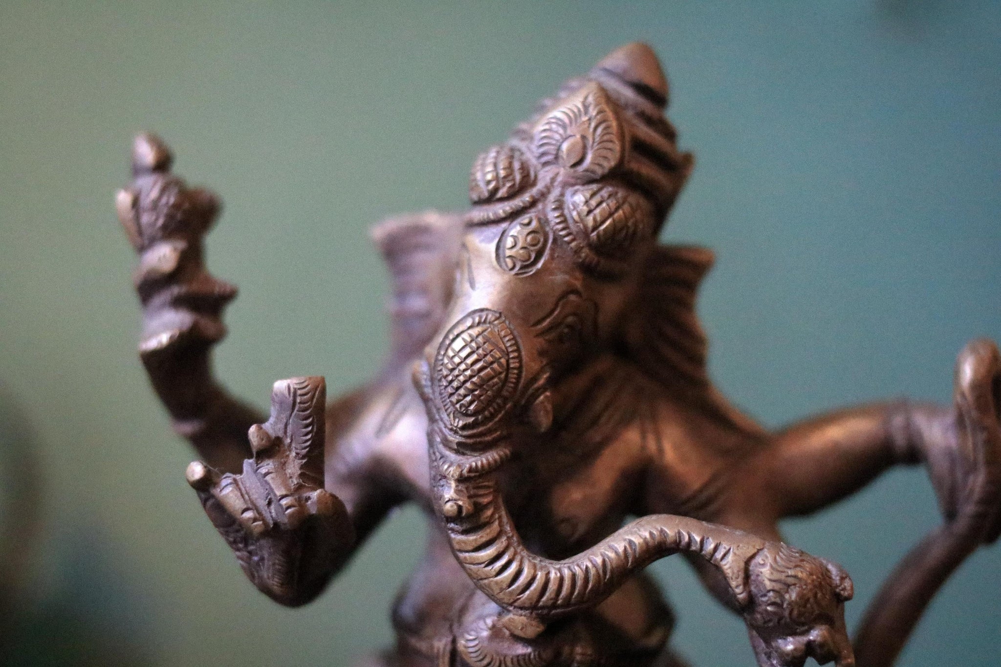 A beautifully cast Indian bronze of Naga Ganesha, depicting the beloved elephant-headed deity dancing upon a coiled Nāga (serpent deity) rising from a lotus base. This rare form, known as Nagendra Ganapati, symbolises the triumph of divine consciousness over fear and illusion — Ganesha’s dance representing joy, mastery, and awakening, while the serpent embodies kundalini energy and protection.