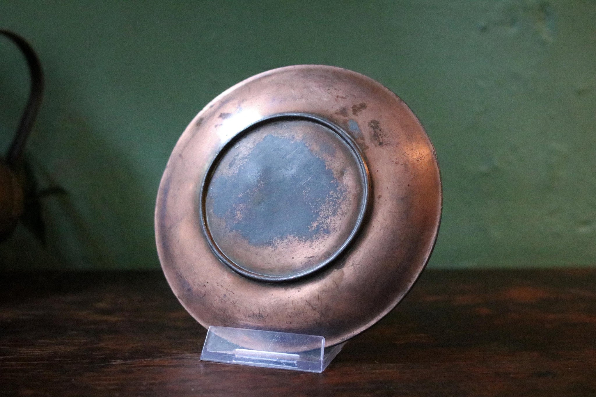 Honest age to the rim and surface with small scuffs and oxidation in recesses—decoratively superb. Size read from the tape: approximately 15 cm (about 5⅞") diameter. Lovely as a vide-poche, incense plate, or cabinet piece that layers beautifully with Japandi and wabi-sabi interiors.