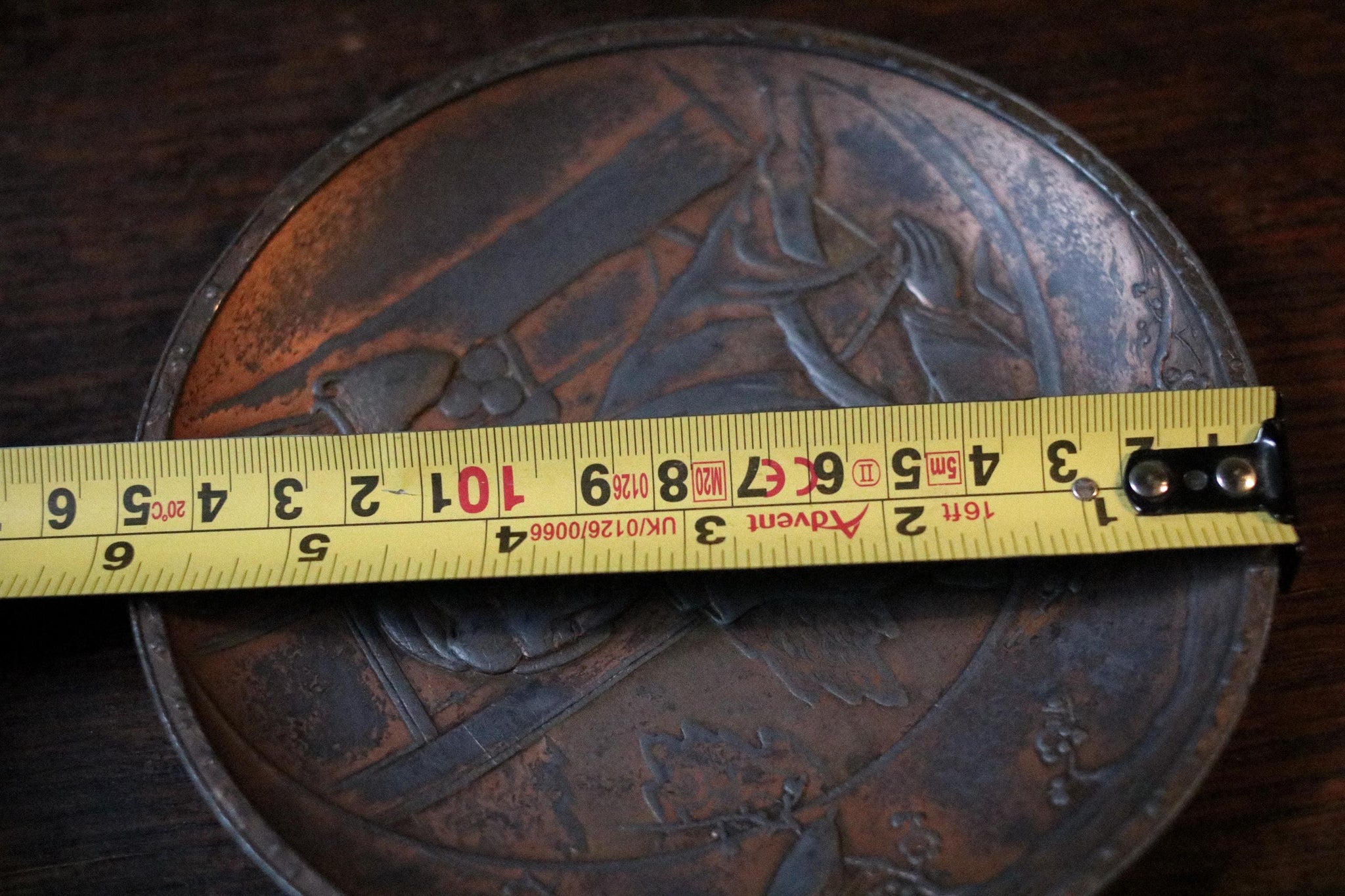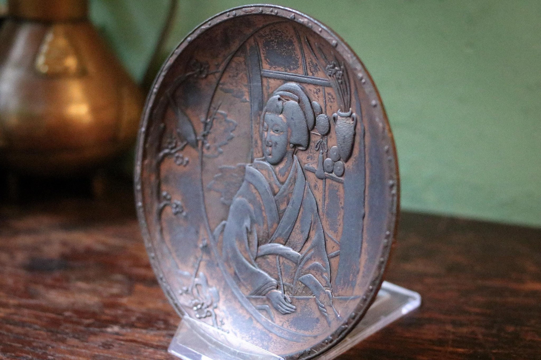 A finely cast and hand-finished Japanese copper dish featuring a graceful bijin (often called a geisha) before a shoji screen with flowering prunus and a small vase of blooms. The relief is crisp with a deep, chocolate-brown patina and warm copper highlights from decades of handling. Reverse with simple recessed foot; no maker’s marks observed.