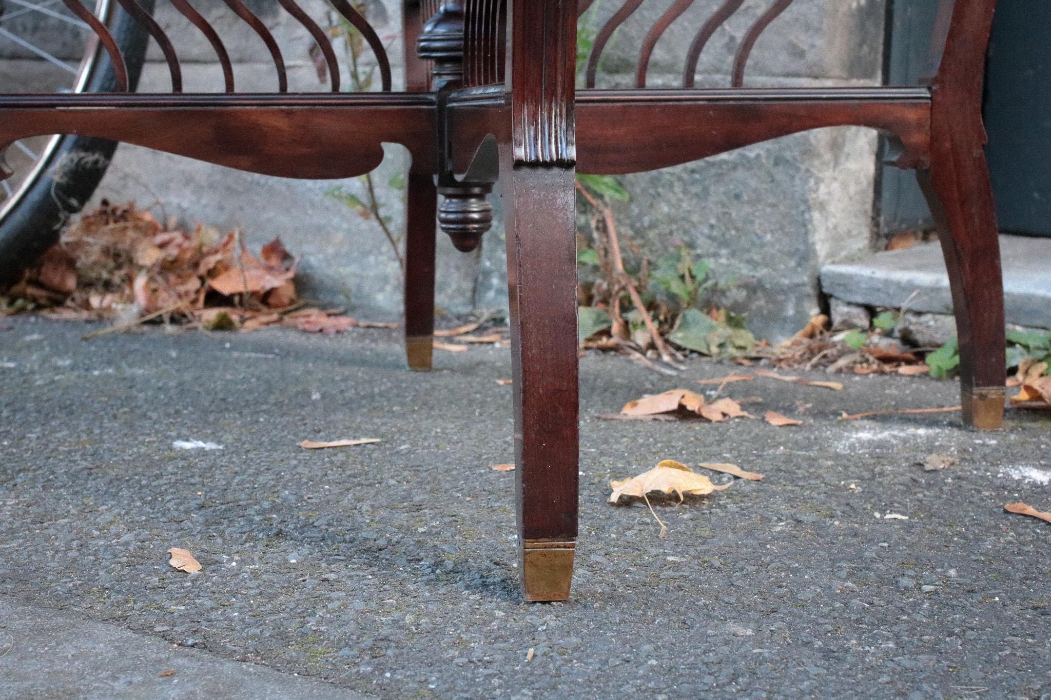 Presents well and stands solid; age-related marks, small veneer nicks and ring shadows to the closed top, small piece missing from a stretcher, and the baize is split and worn in places—ripe for a straightforward recover if desired. A decorative, compact card table that also works perfectly as a side or lamp table when closed.