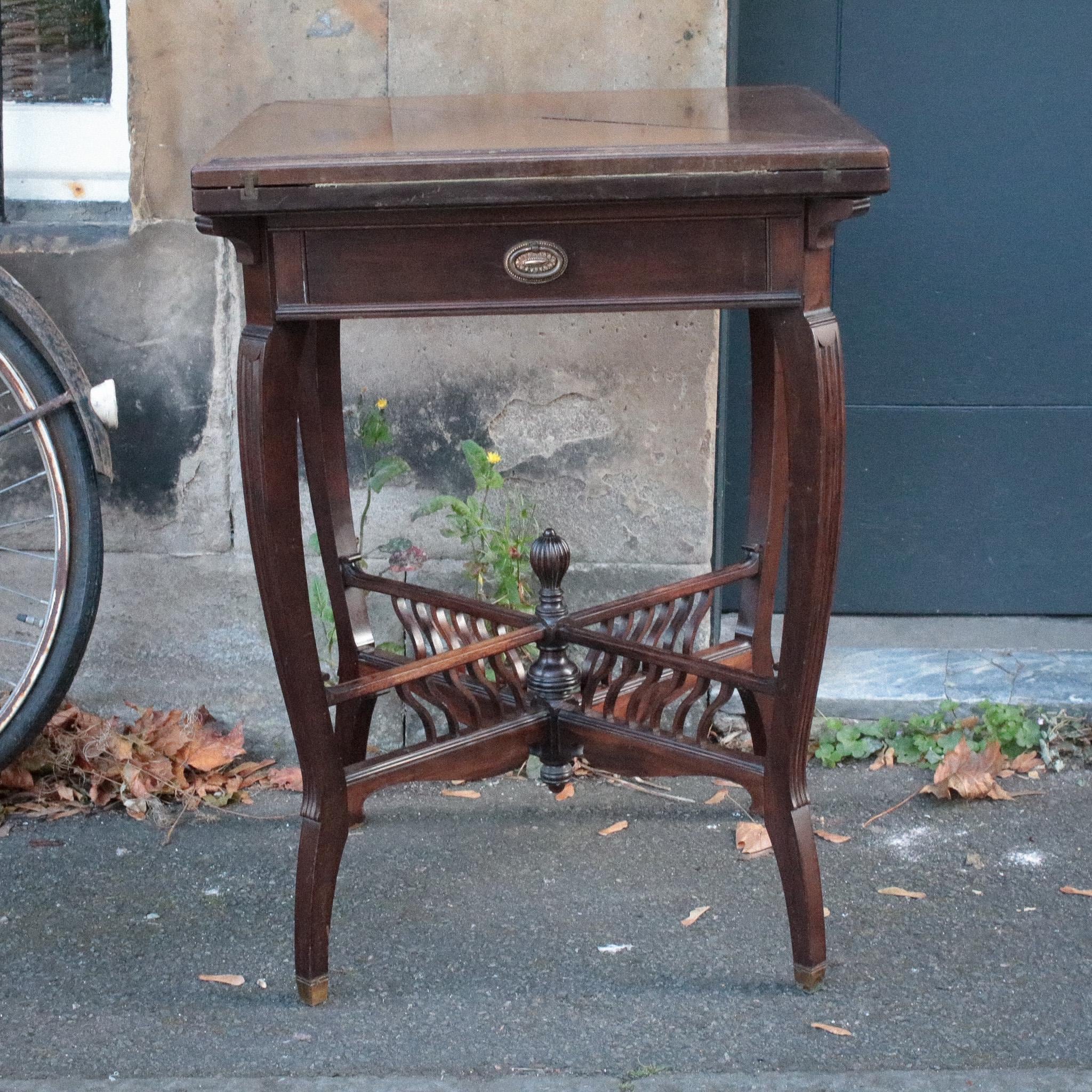 Elegant late Victorian–Edwardian mahogany games table with a neat square footprint and a single frieze drawer. The shaped legs are joined by an X-stretcher with wavy galleries meeting at a turned and fluted finial, giving the piece lovely movement and that smart library look.