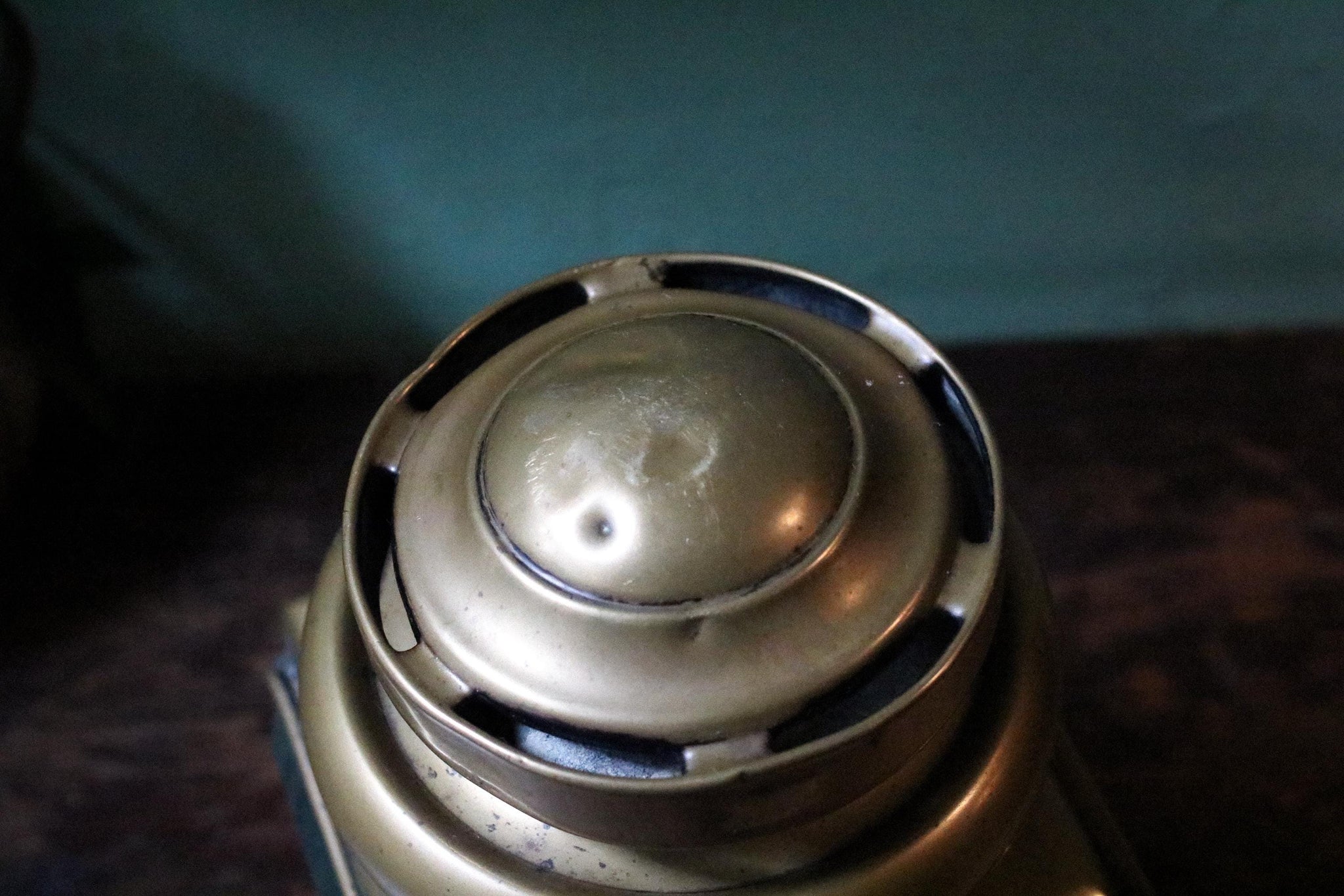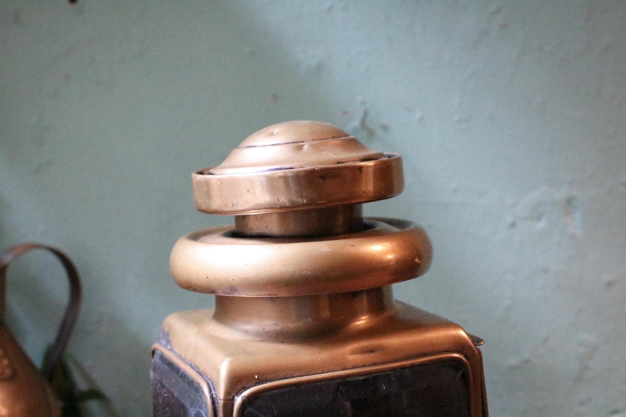 The lamp shows the right kind of road-worn character: shallow dings, solder traces at the door seam, speckling and scratches to the panes, age darkening inside the chimney, and general surface scuffs; the burner assembly and some fittings are incomplete, so it’s offered as a collector’s/display piece rather than for use. Superb automobilia for a shelf, bar, or industrial/steampunk interior, and a great styling prop with genuine Edwardian presence.