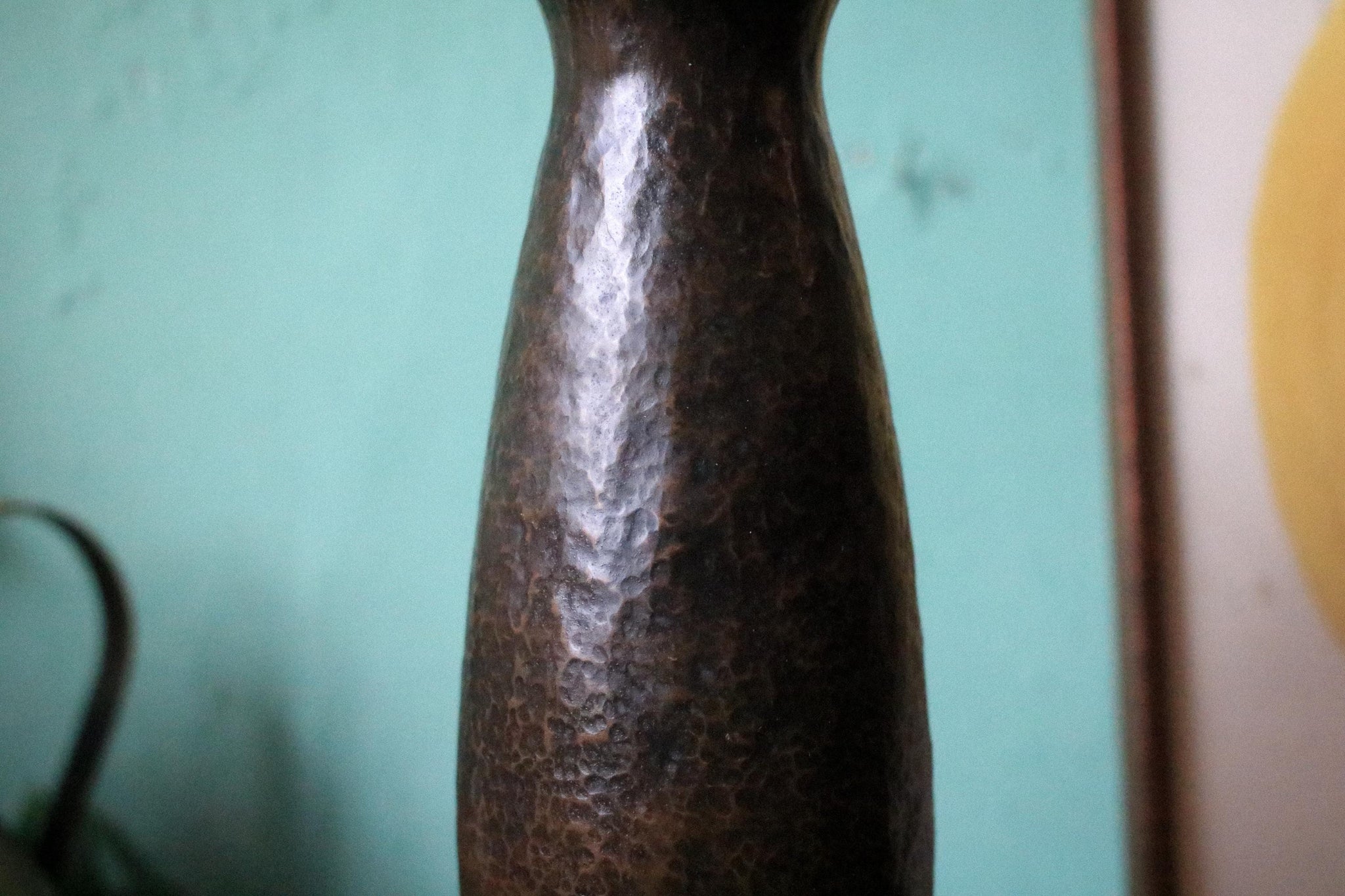 A tall, elegant piece of trench art with a flared lip and richly planished surface, fashioned from a spent brass shell casing (the drilled primer hole is visible to the base). The silhouette is refined and sculptural—equally good as a single-stem vase or as a small piece of military folk art on a shelf. Deep, untouched patina throughout.
