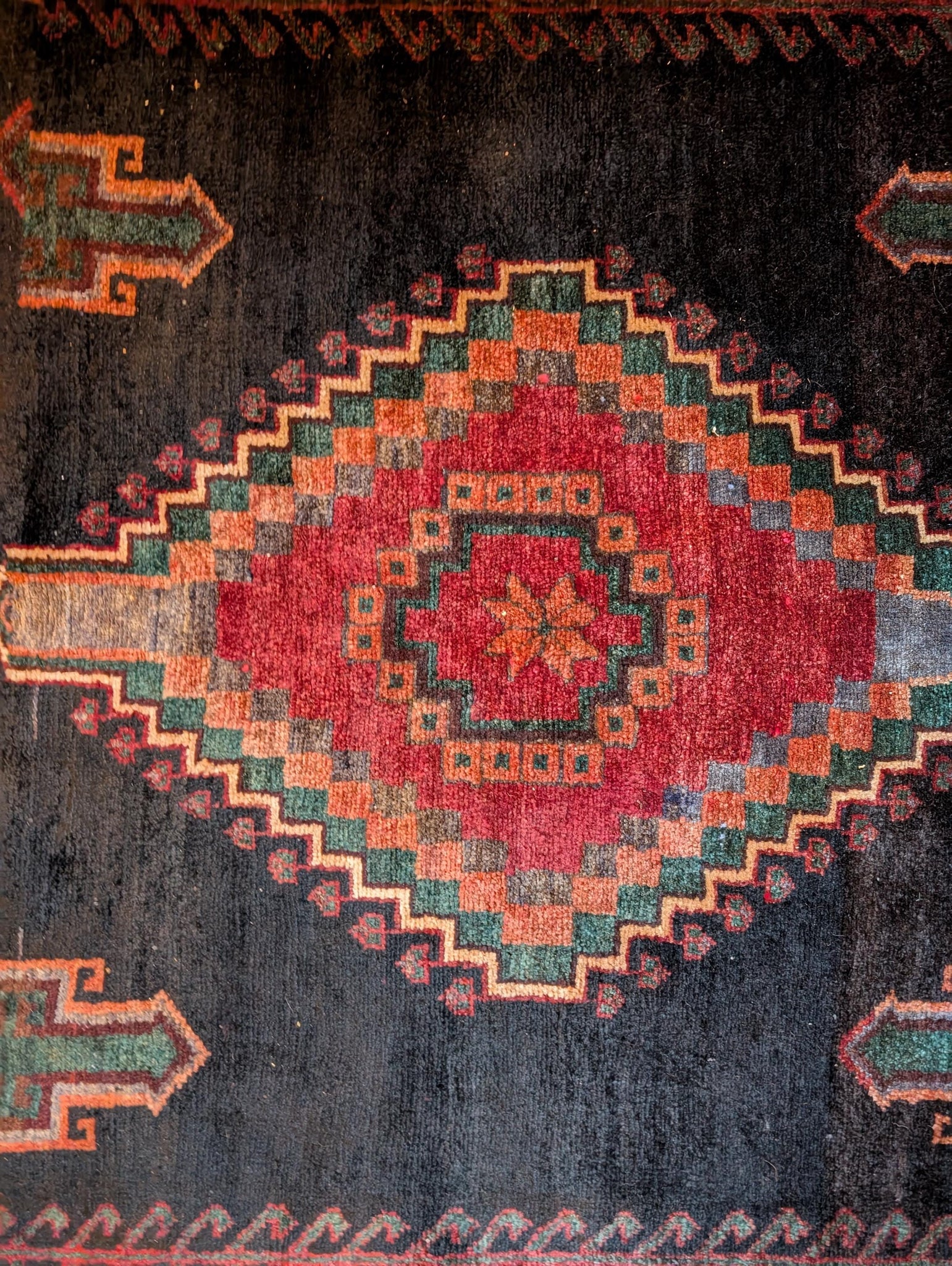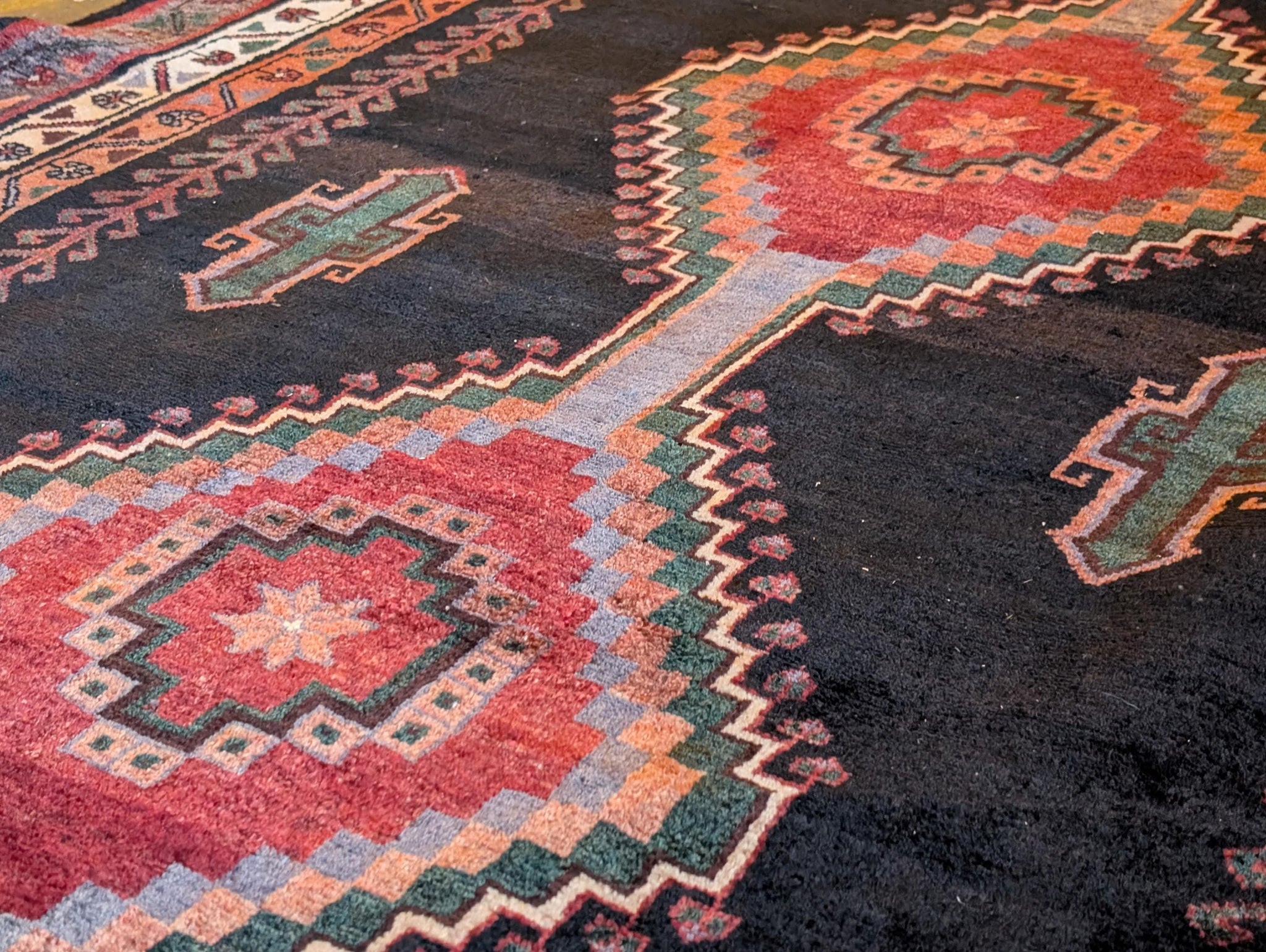 Rich, moody tribal rug with a near-black / inky indigo ground and two large linked diamond medallions in reds, soft teal, lilac and salmon. Hand-knotted wool pile, warm underfoot, with classic stepped medallions, arrow/amulet motifs in the field and multiple geometric guard borders. The palette is great: dark ground so it reads dramatic and “library”, but with enough colour in the centres to keep it from feeling heavy.