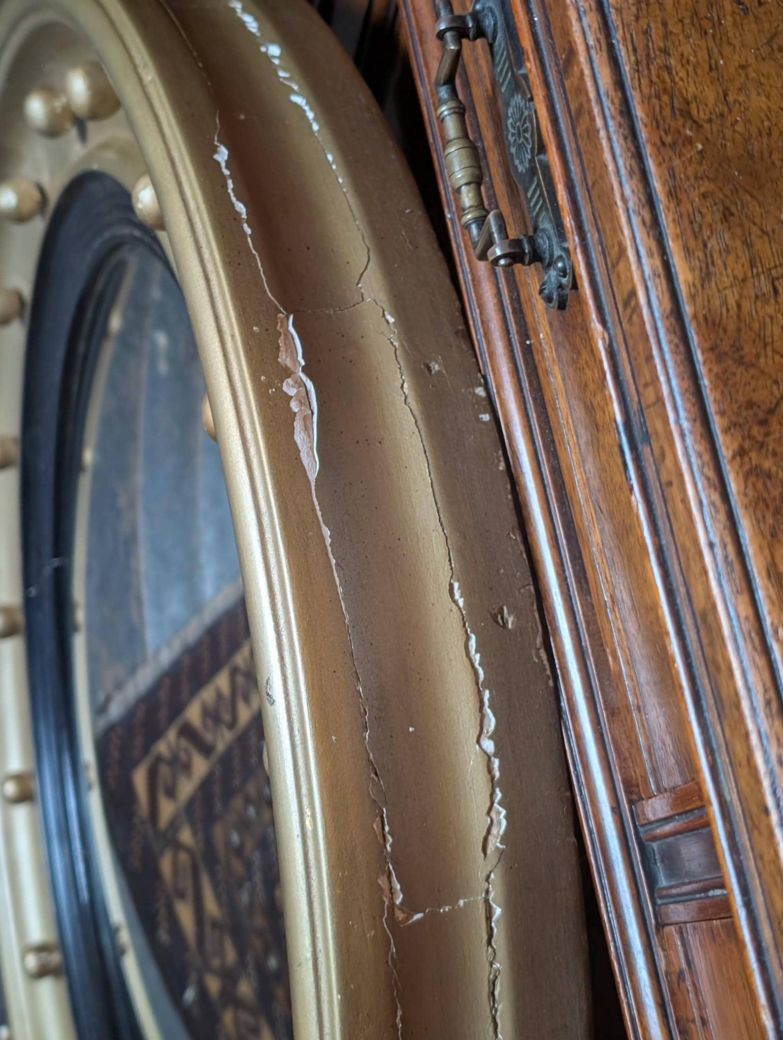 The frame shows age-related wear consistent with an antique piece, including surface marks, small scuffs and rubbing to the gilt-painted finish. The rear retains its wooden backing and hanging chain, and the convex mirror plate shows light character and wear from age visible in the photographs. Overall it presents very well and remains a striking decorative wall mirror.