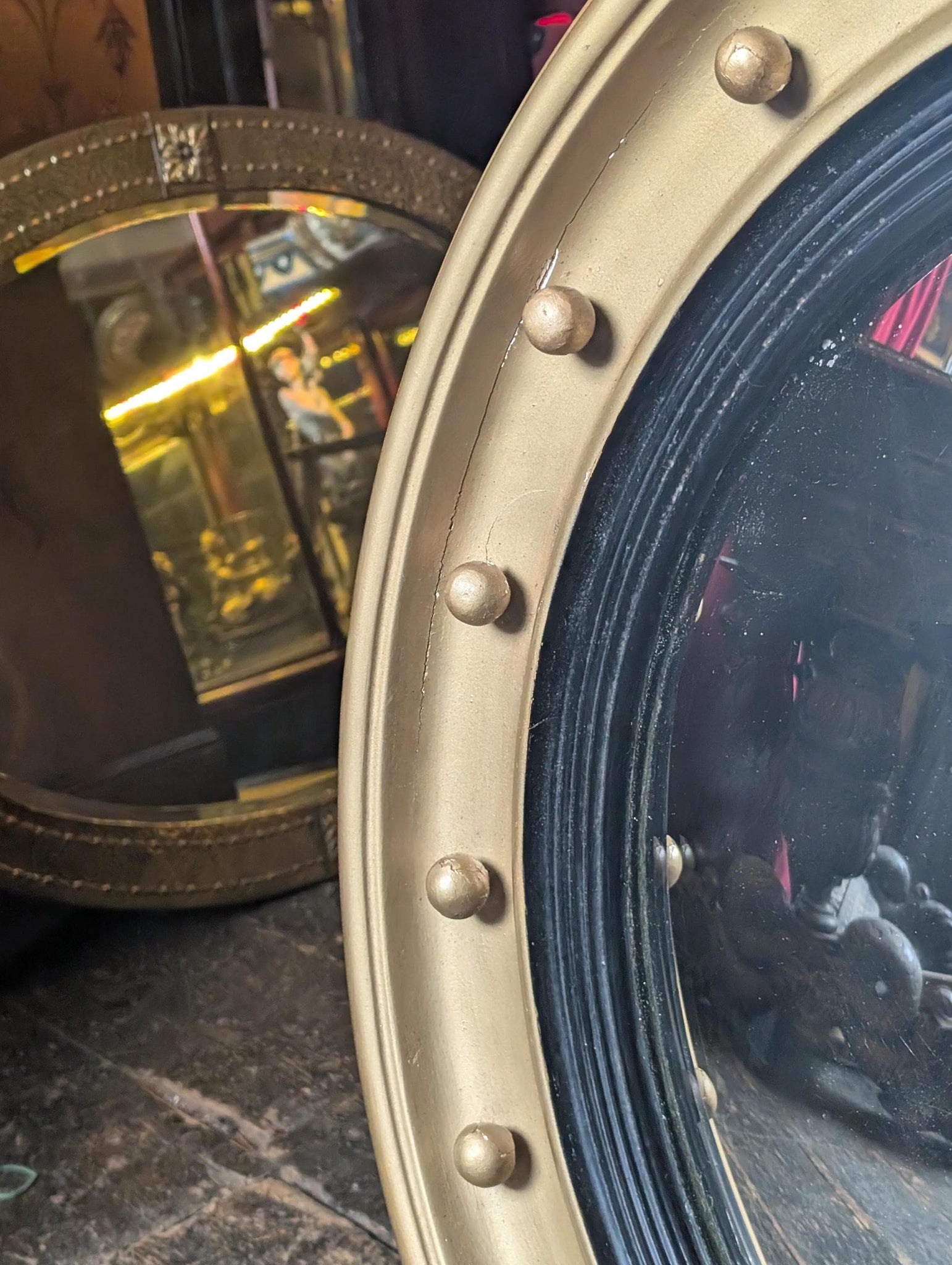 Convex mirrors like this became an iconic feature of Regency interiors, valued both for their decorative impact and their distinctive reflective quality. The domed glass produces the characteristic wide-angle “bullseye” reflection, adding depth and atmosphere when hung above a fireplace, console or within a layered gallery wall. Today these mirrors remain highly sought after for heritage interiors, old money styling, dark academia spaces and classic English country house decor.