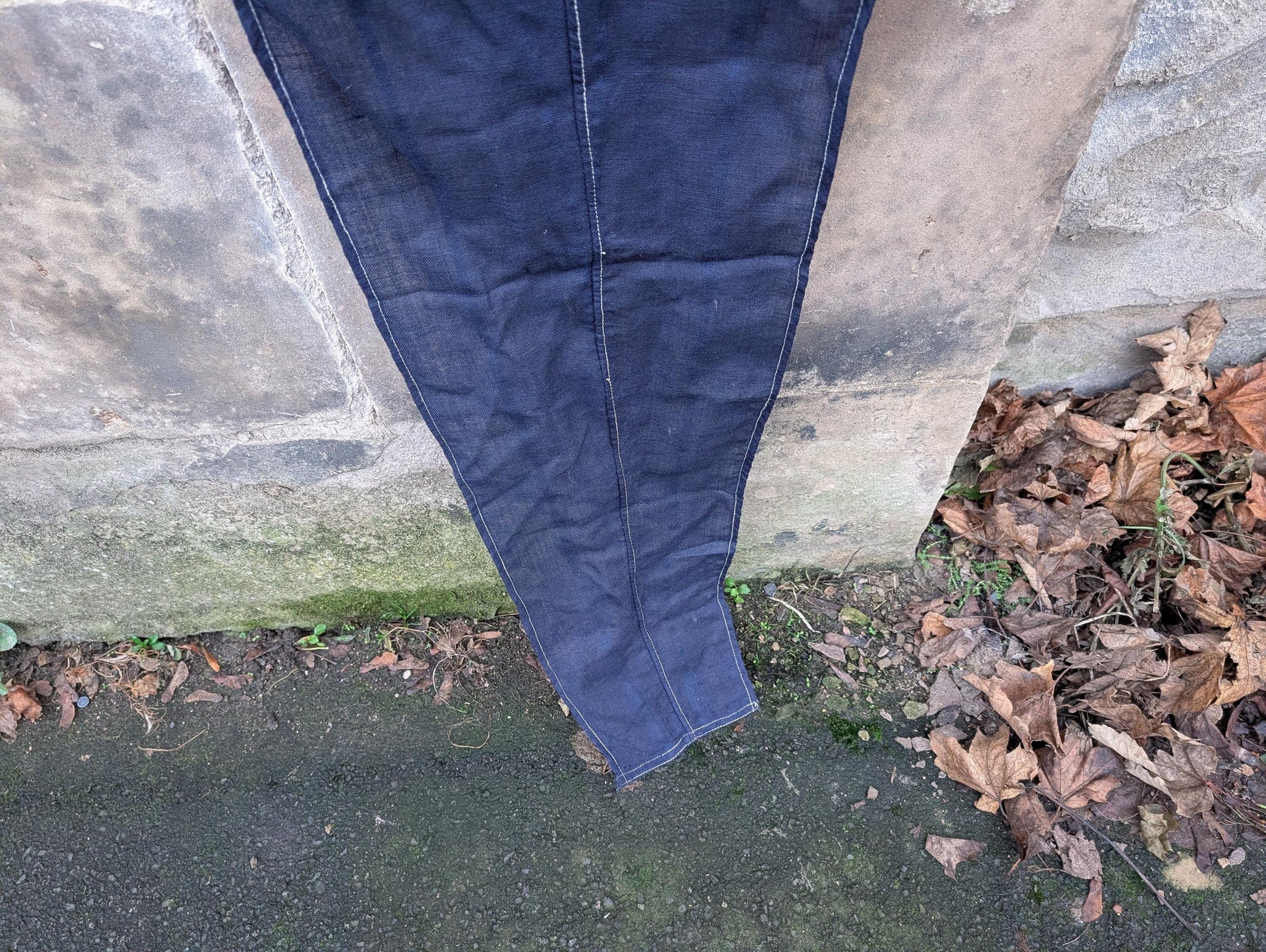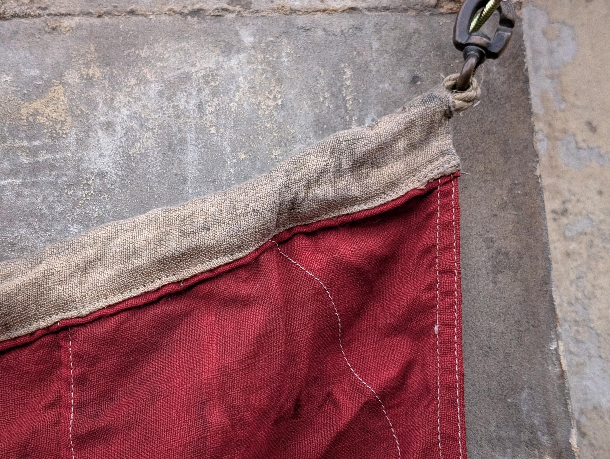 A striking long maritime pennant / signal-flag style textile in bold red, white and navy, with that perfectly weathered, salt-air look that modern interiors try (and fail) to fake. Hung vertically it reads like a piece of graphic colour-block art, and it sits right in the Sailorcore / Coastal Grandpa / Old Money trend—ideal for a hallway, stairwell, beach house, boat cabin, or layered into a maximalist gallery wall. The fabric has a lovely aged softness and visible character from use, with creasing, marks and wear consistent with age (please see photos), plus original hanging points/line at the top. Measurements: 58 x 234 cm (22.8 x 92.1 in).