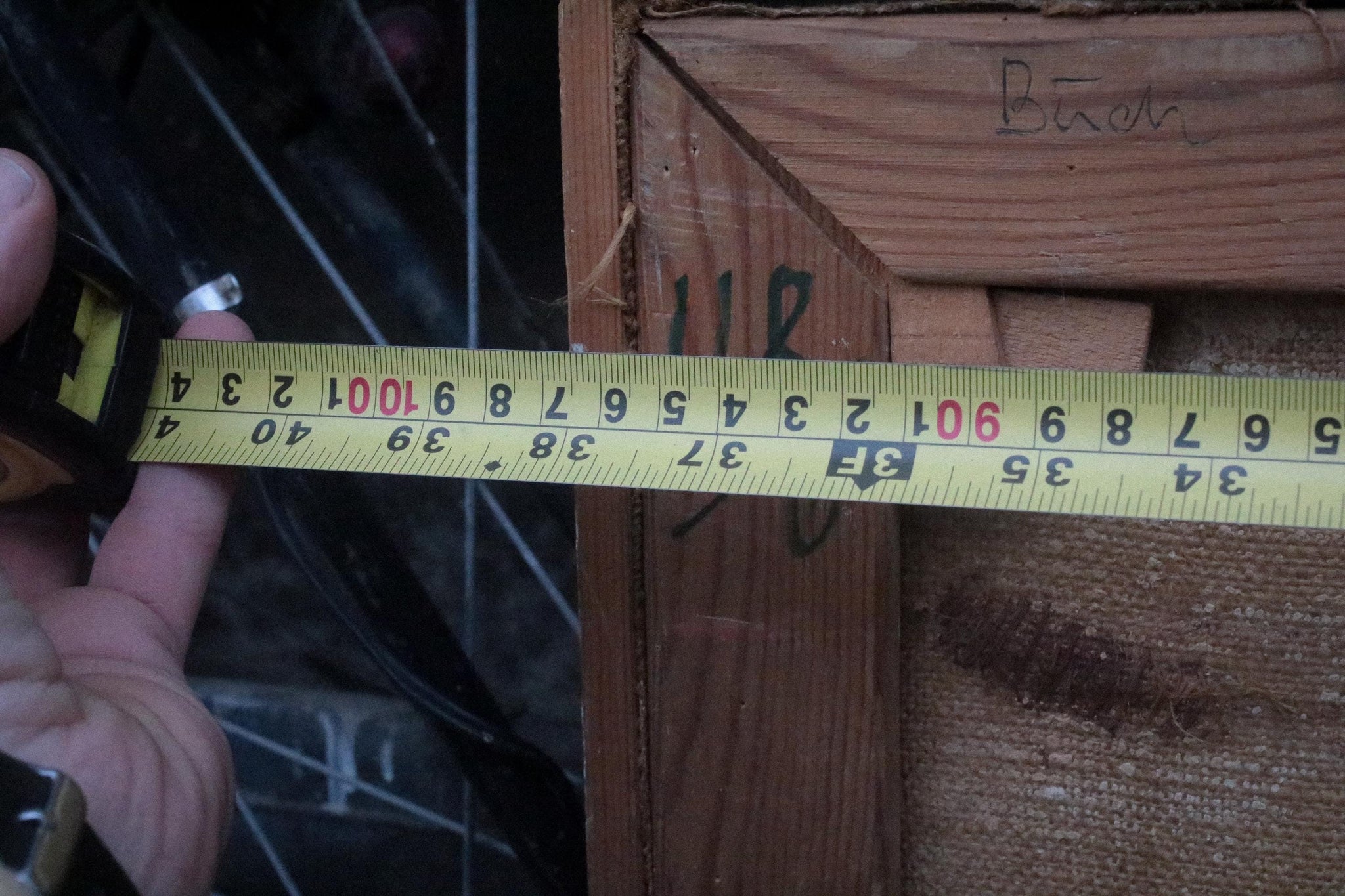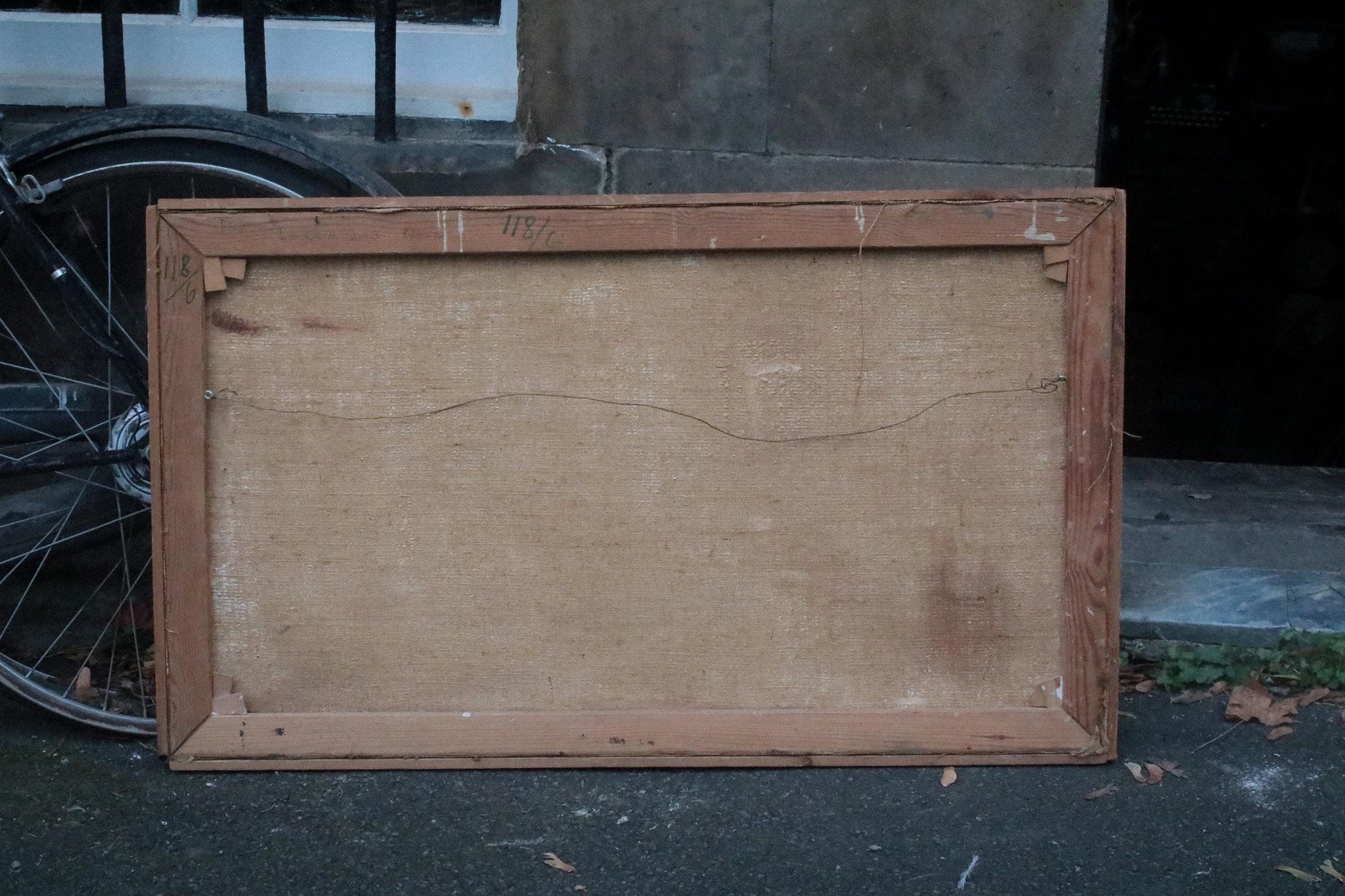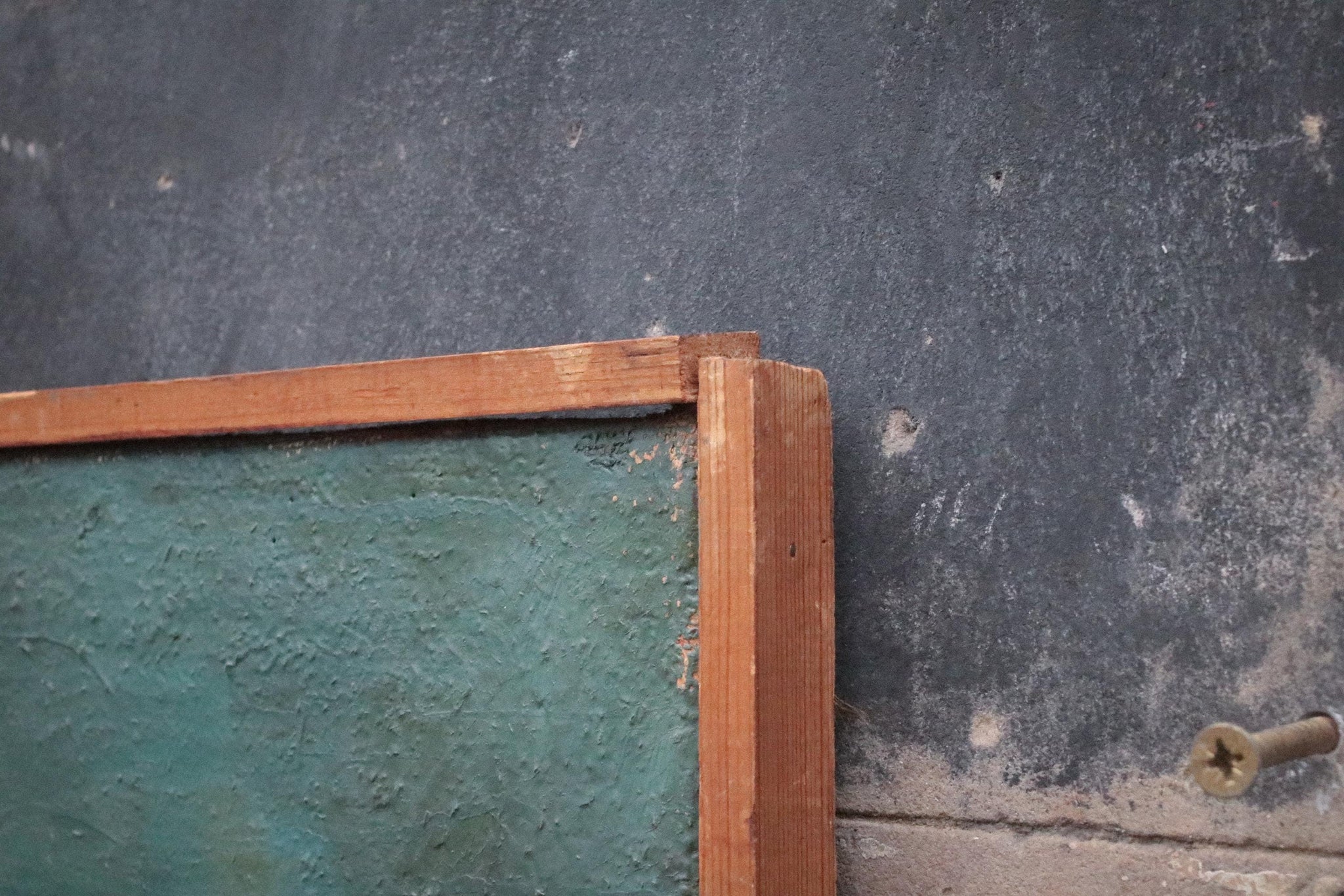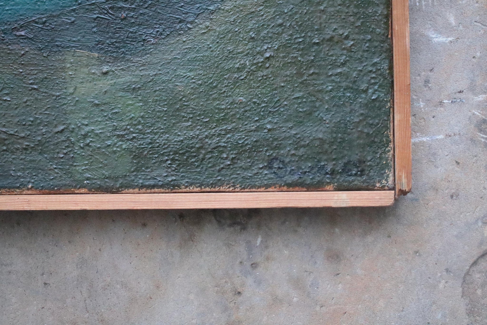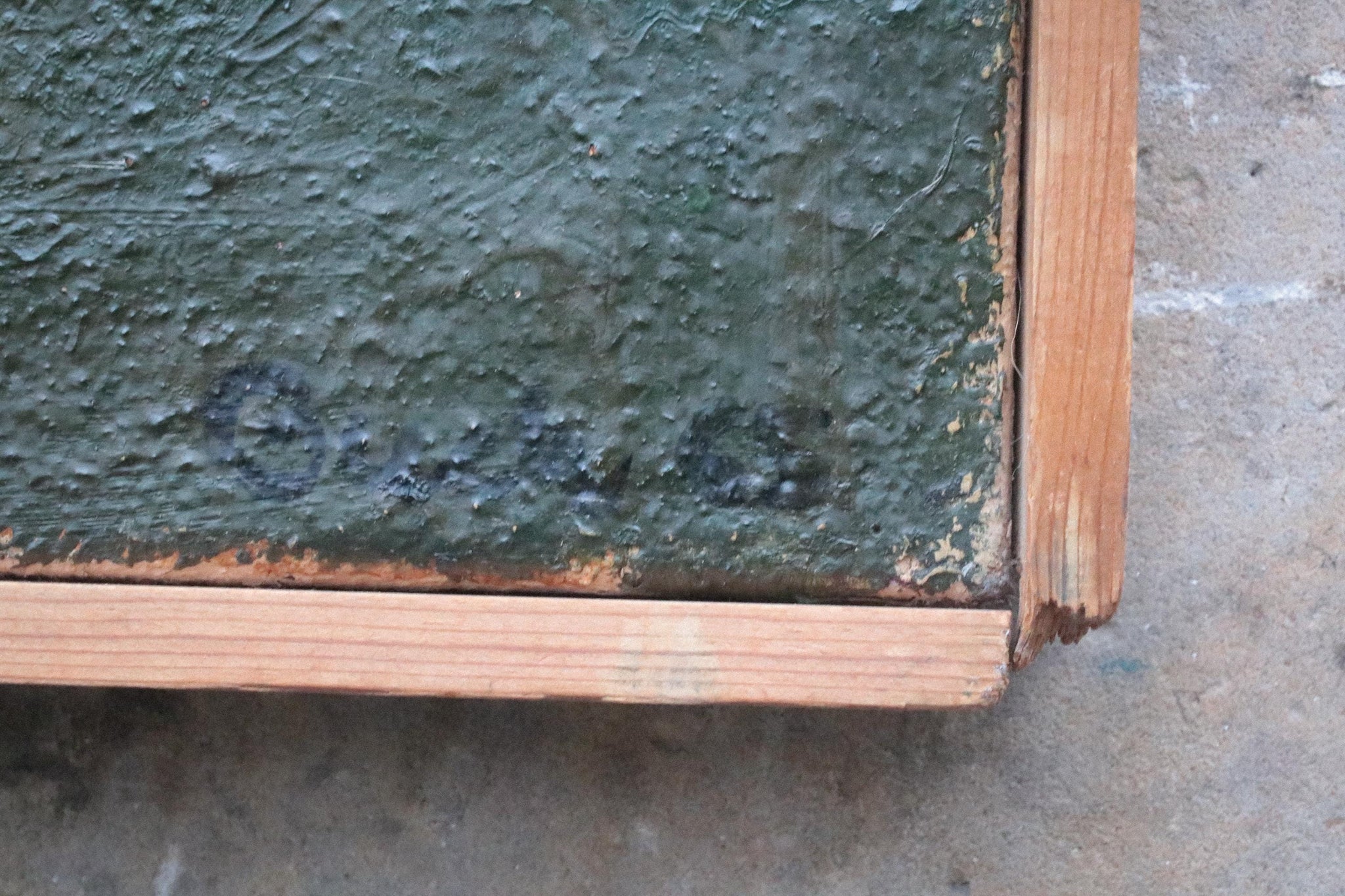 Condition is decorative and honest: scattered wear and age to the frame including a chipped corner, minor marks and light scuffs to the paint consistent with age; stable overall and ready to hang.