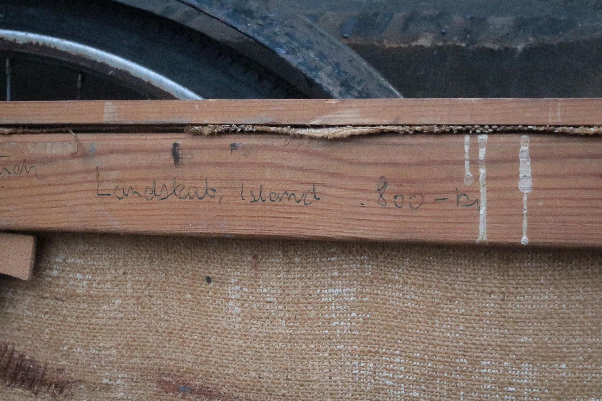 Atmospheric mid-century oil on canvas capturing a glacial-blue lake beneath brooding Icelandic hills. The surface is richly worked with expressive, almost volcanic impasto, giving the sky and water real movement and depth. Signed Bruhn at lower right, with the stretcher inscribed in Danish “Landskab, Island,” pointing to a Danish hand painting an Icelandic scene.