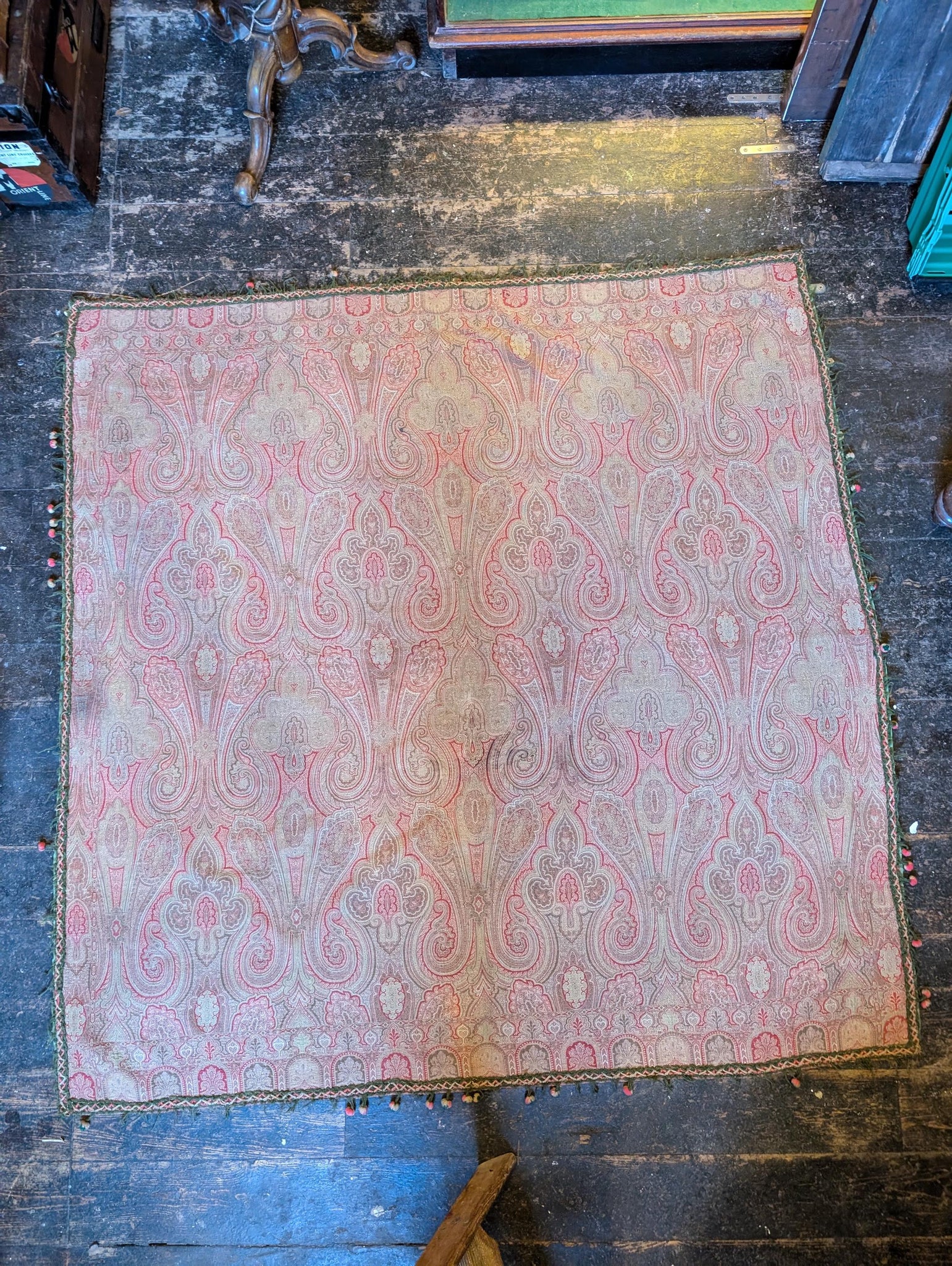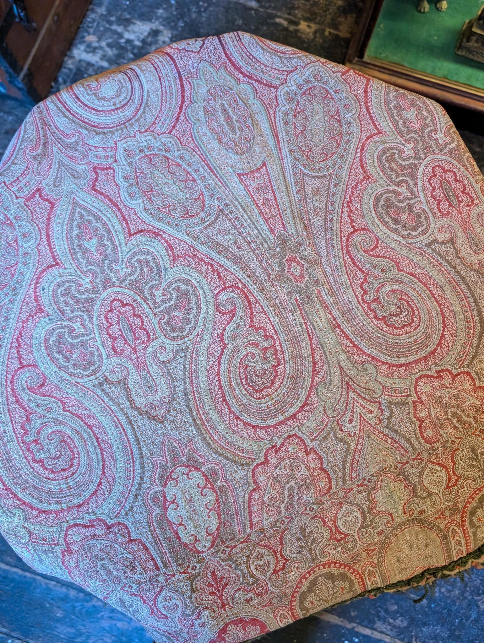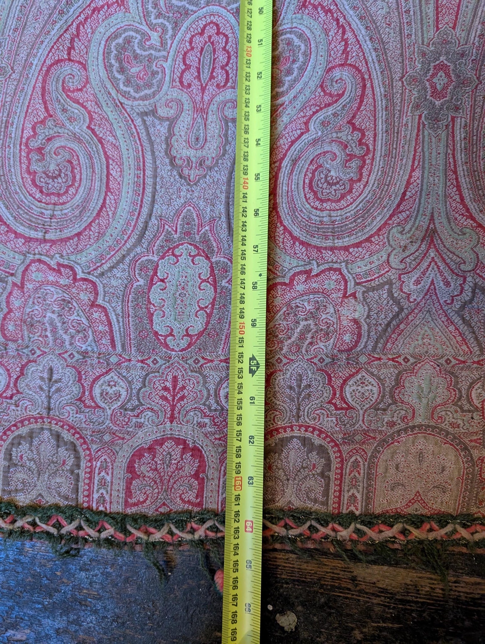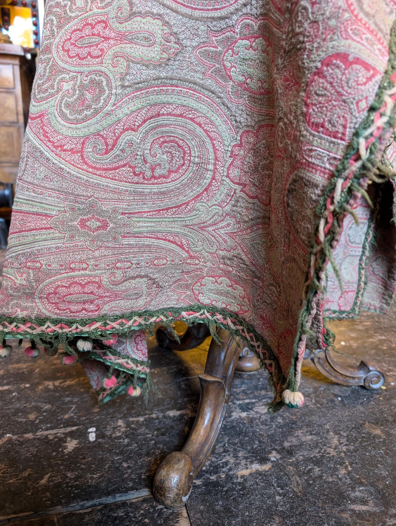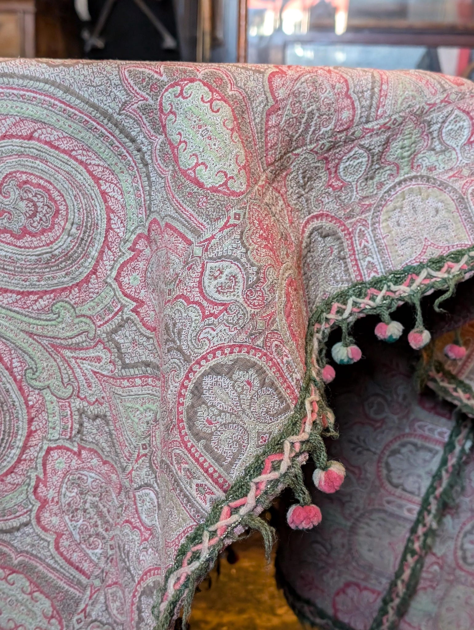 A beautiful late 19th-century Kashmir-style square paisley shawl woven in fine wool with scrolling boteh and palmette motifs in soft pink, sage and fawn. The handle is supple and drapey, finished all round with hand-worked green braid and playful pink-and-green pom-pom tassels, making it perfect as a dramatic table cover, sofa throw or layered “old money” accent over a canopy bed. Romantic, light-toned palettes like this read wonderfully in grandmillennial and cottage interiors.