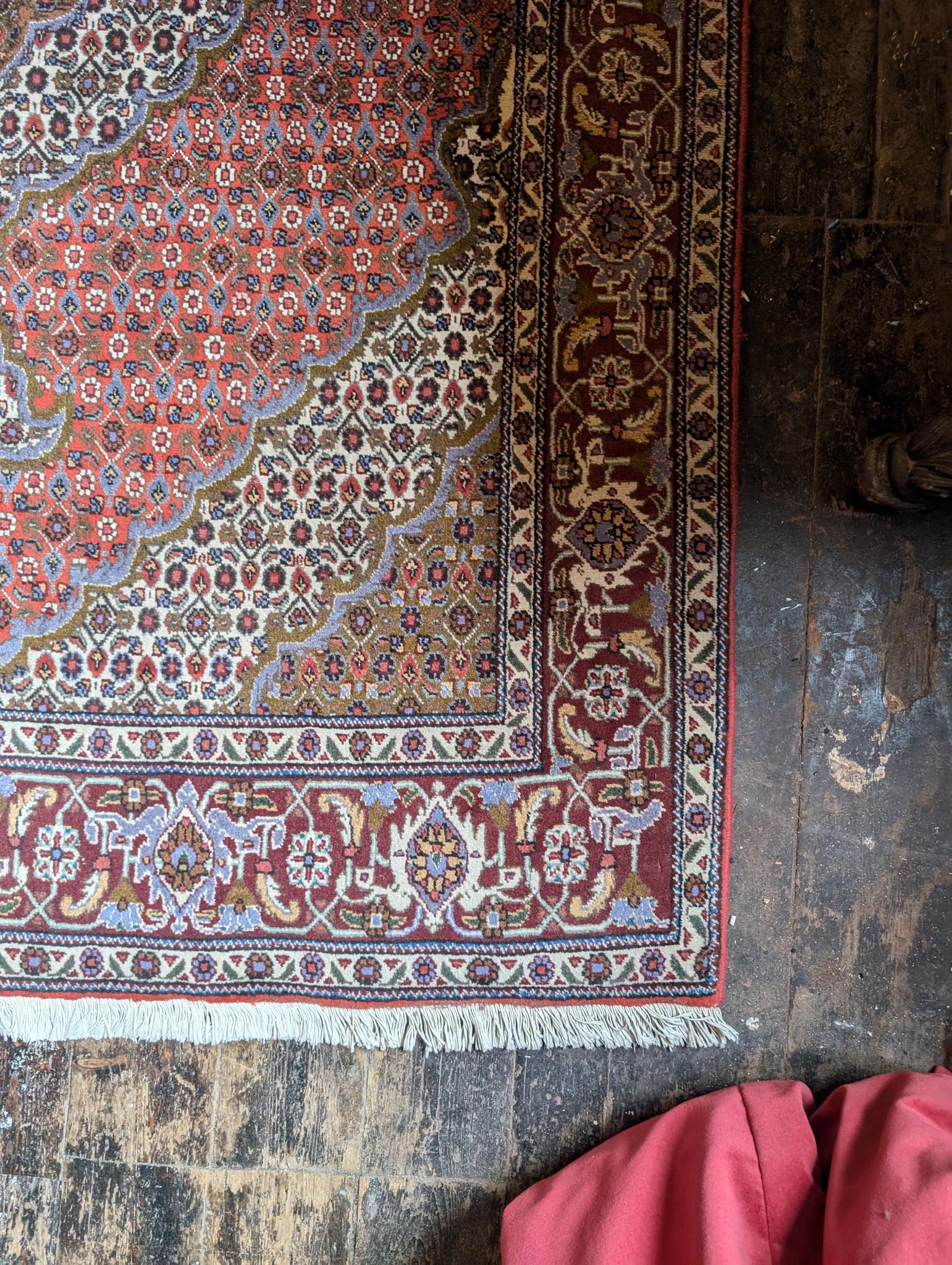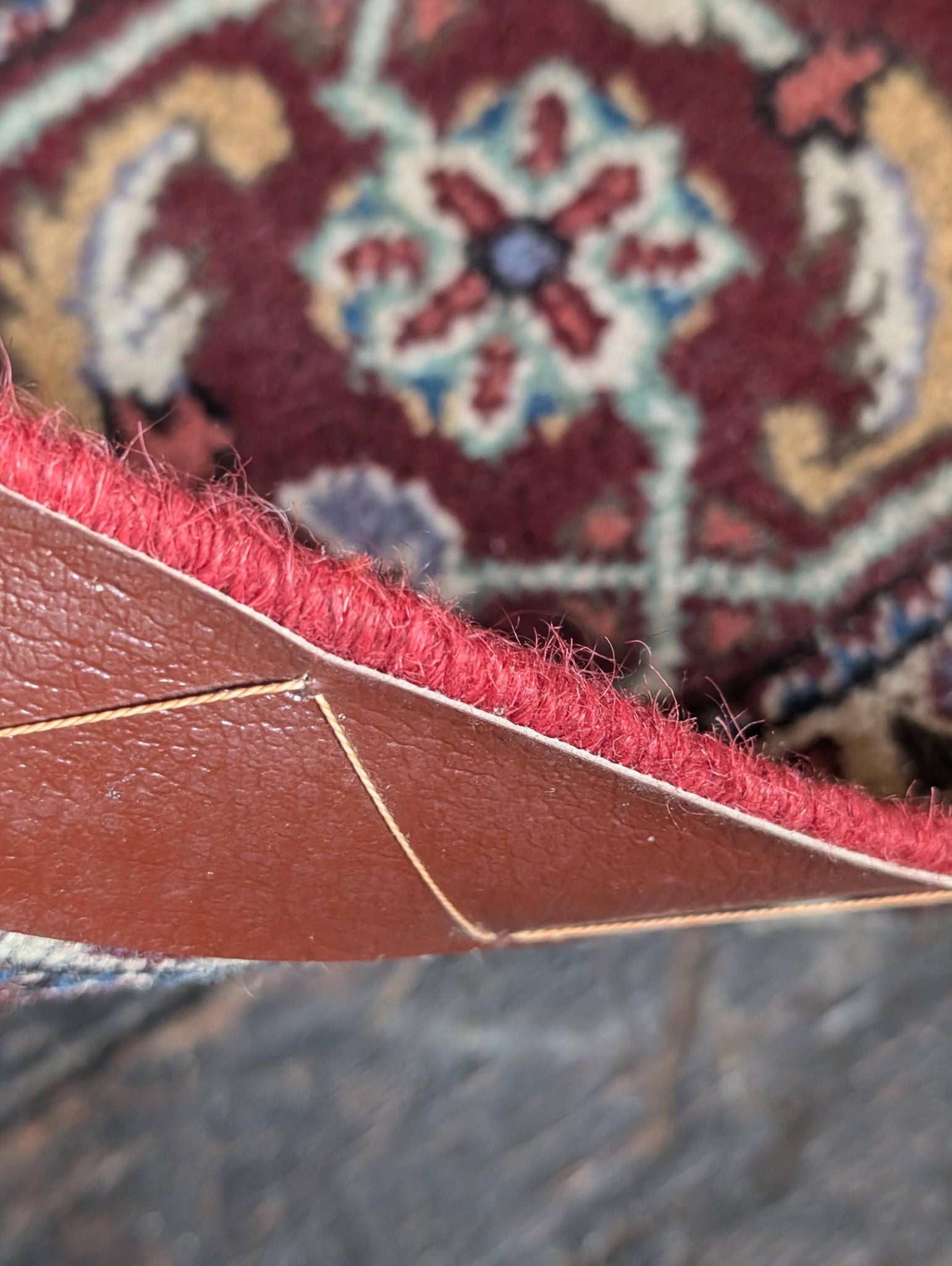 Finished with decorative fringes and backed in one corner with leather for added structure, this is a beautiful example of traditional craftsmanship with enduring style. It works beautifully in maximalist, cottagecore, old money, and eclectic interiors—whether underfoot or hung as textile art.