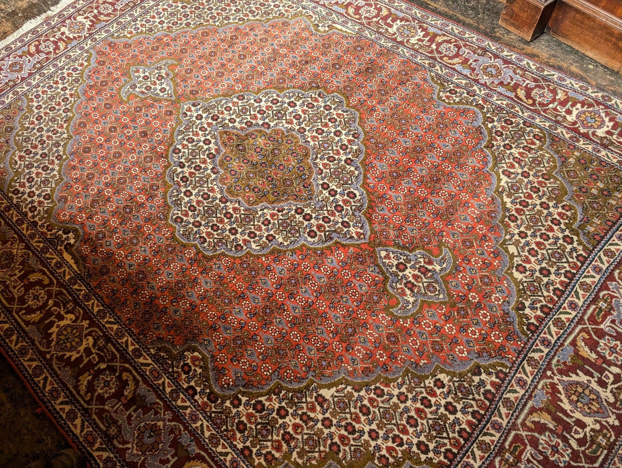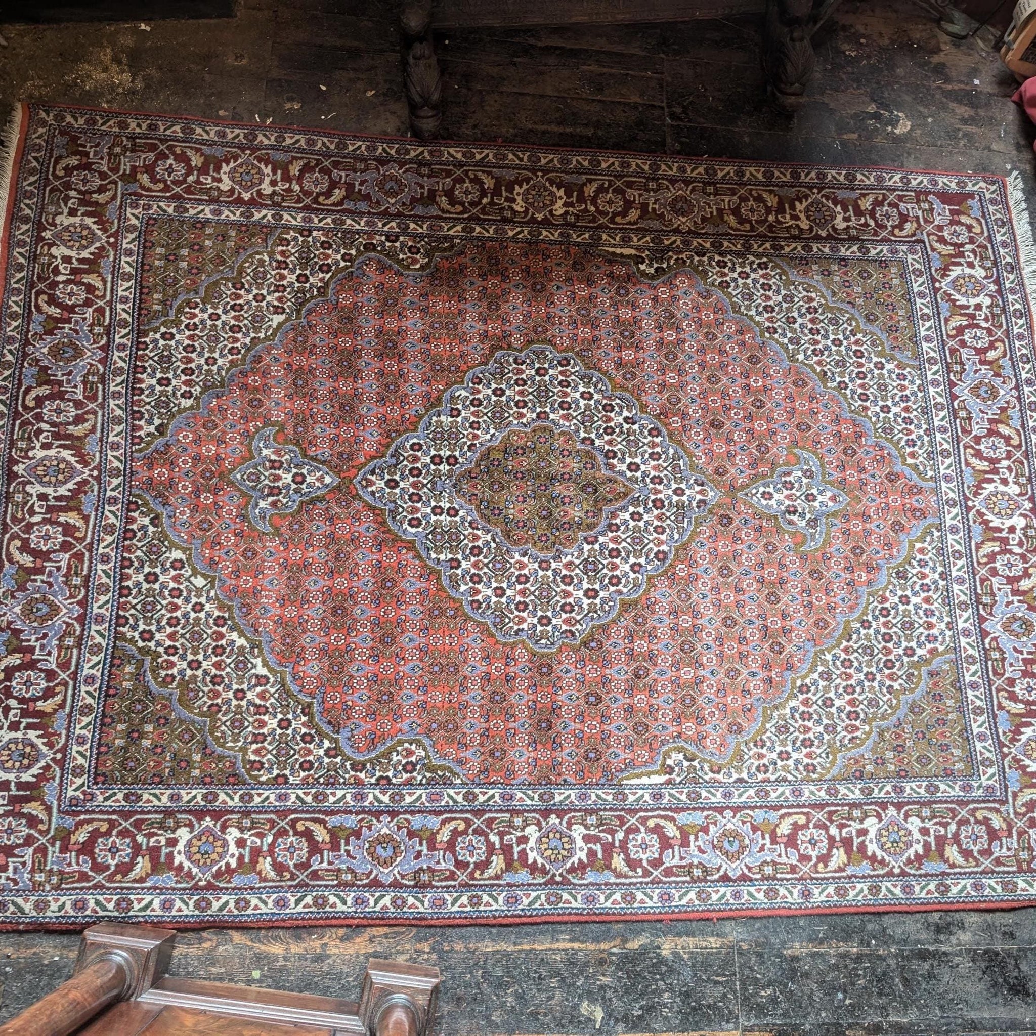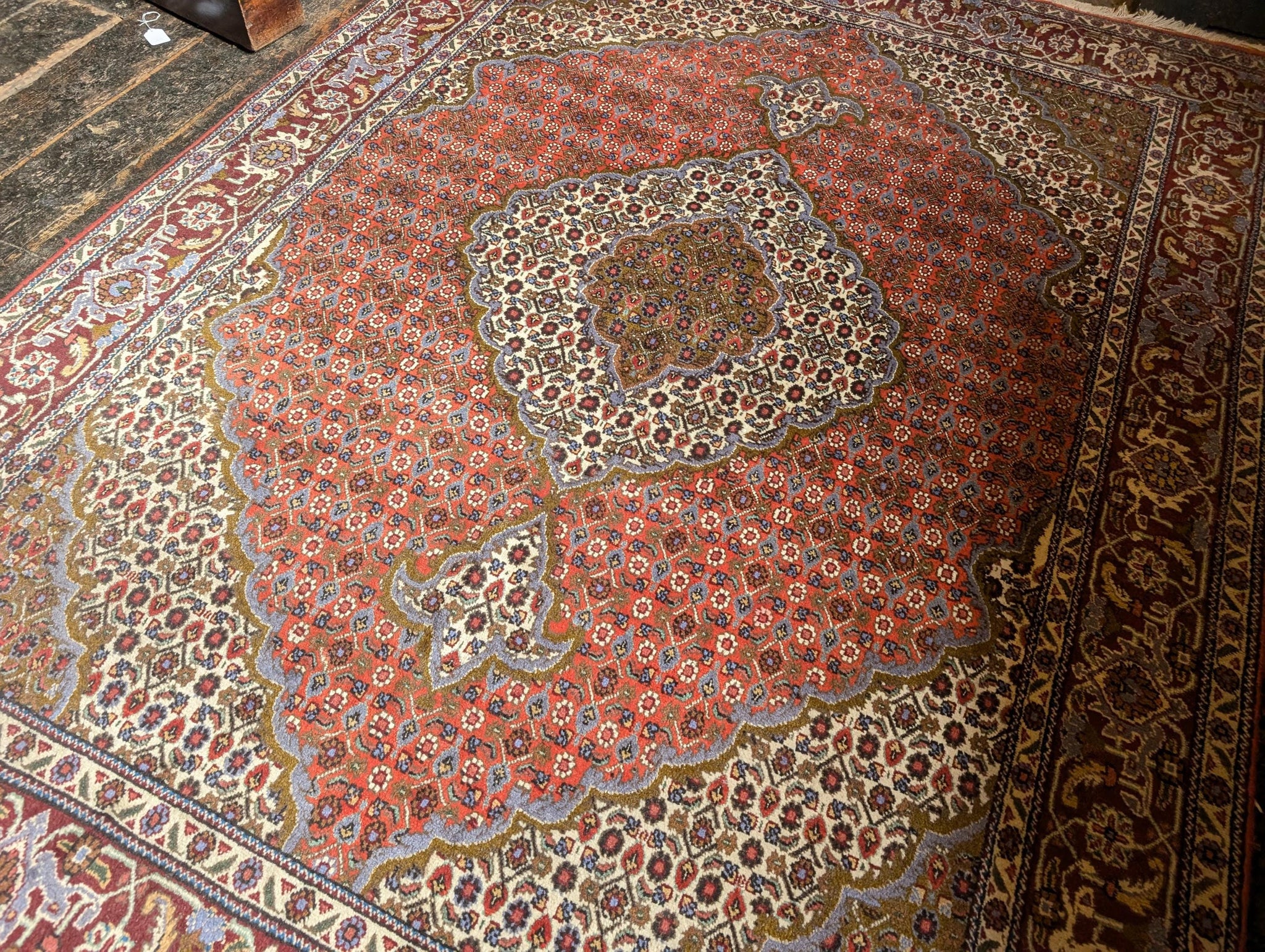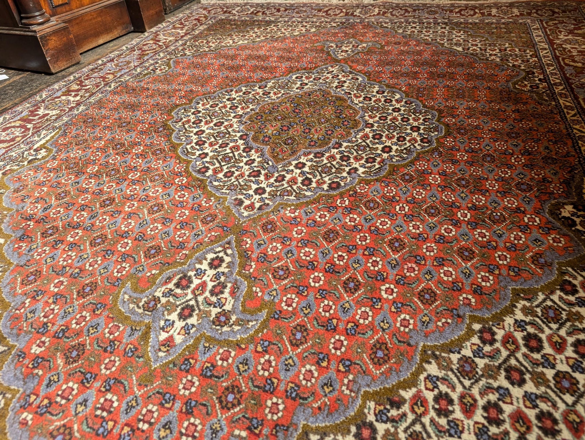 A striking vintage hand-knotted wool rug featuring a dense geometric medallion design framed by intricate floral borders. This piece showcases a vivid palette of brick red, ivory, blue, olive, and charcoal, all balanced in a symmetrical layout that's both classic and bold. The central medallion is surrounded by an almost lace-like pattern that gives this rug a refined yet richly textured presence.