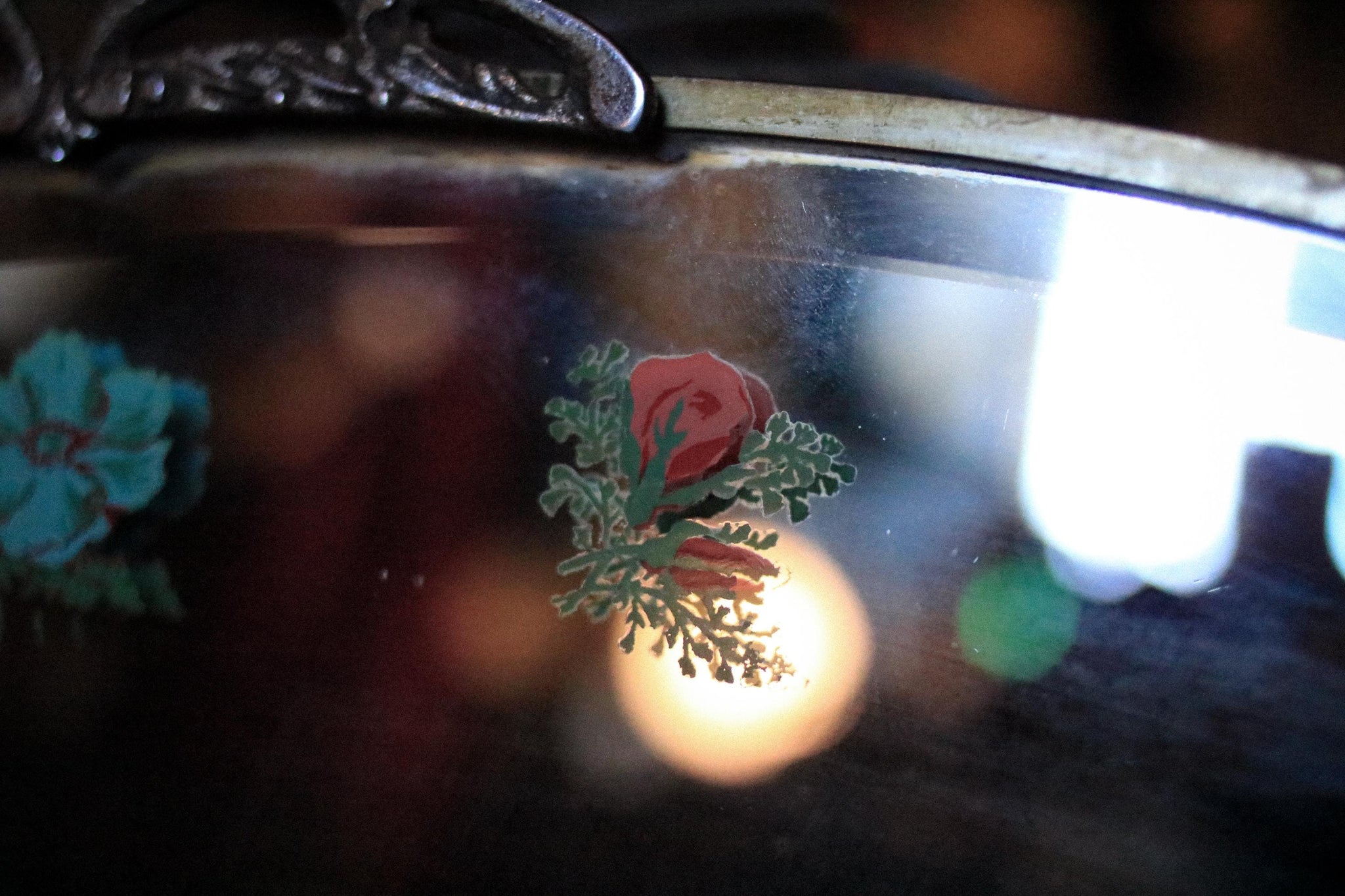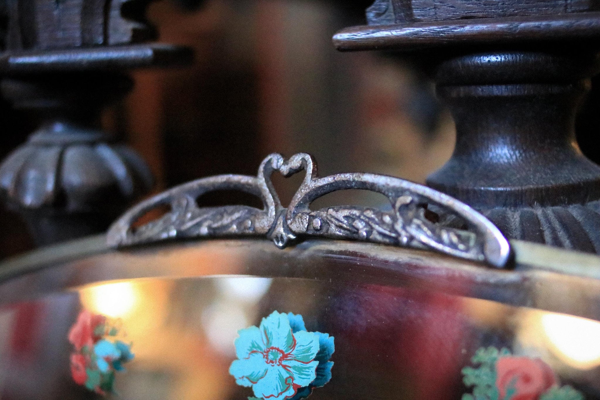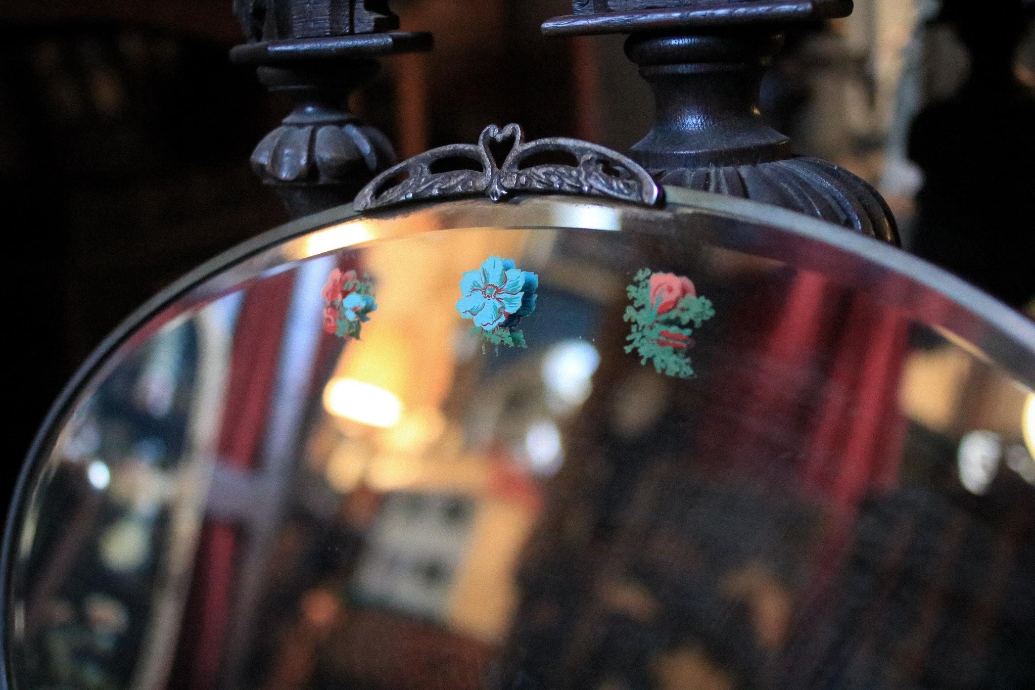 A beautifully romantic oval wall mirror with a bevelled edge, delicate floral transfers, and a silver-tone pierced crest detail at the top finished with a little heart motif. It’s the kind of piece that instantly lifts a hallway or bedroom and looks especially good above a dressing table—perfect for the current grandmillennial / coquette revival (all soft florals, heirloom charm, and a touch of old-world sweetness).