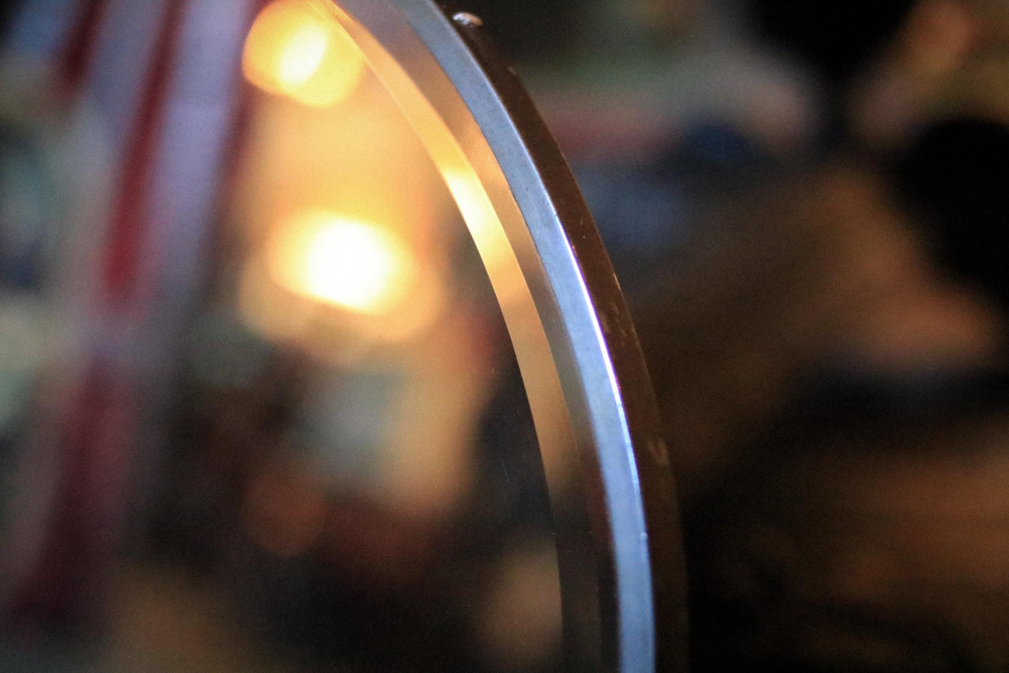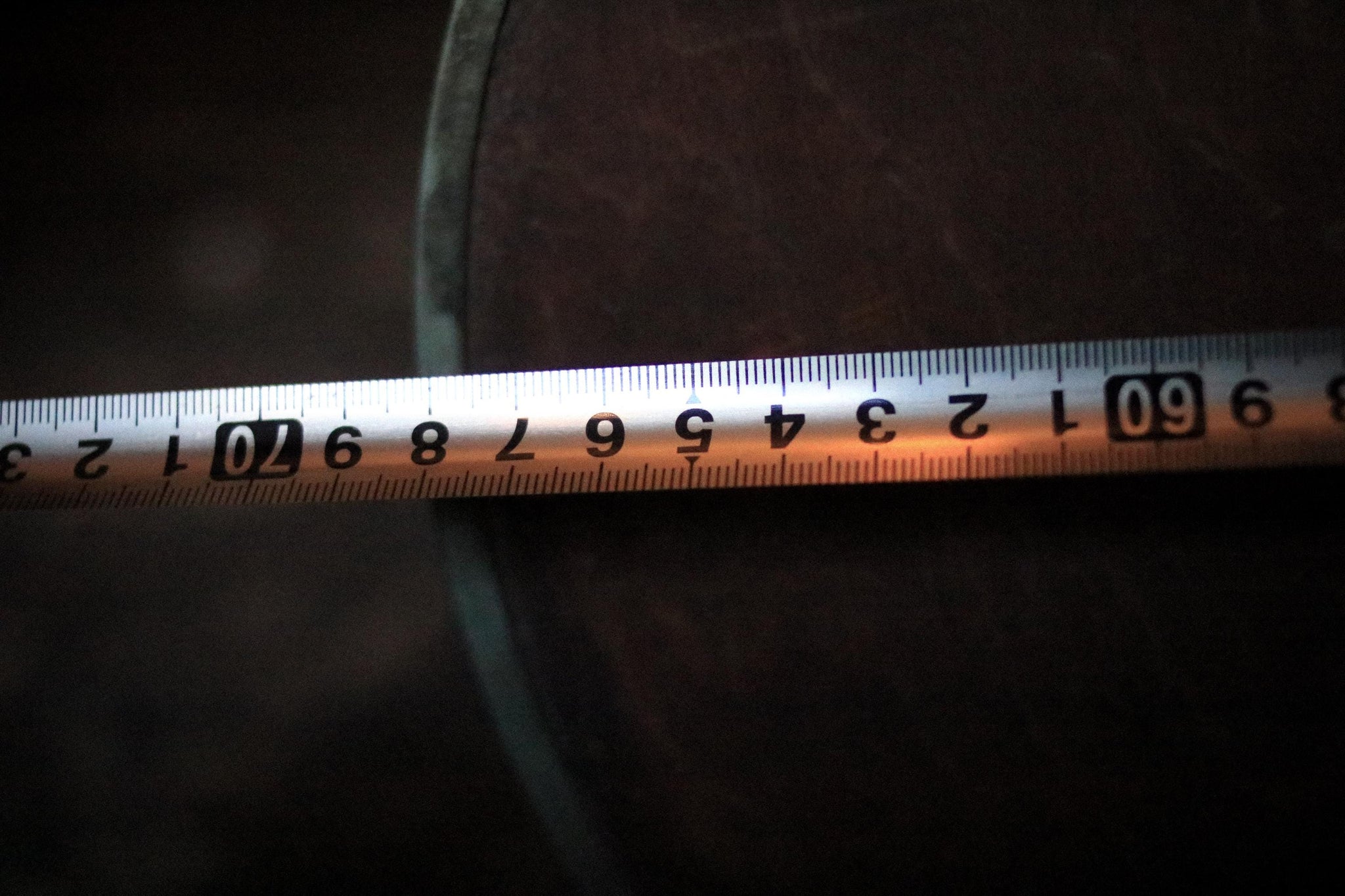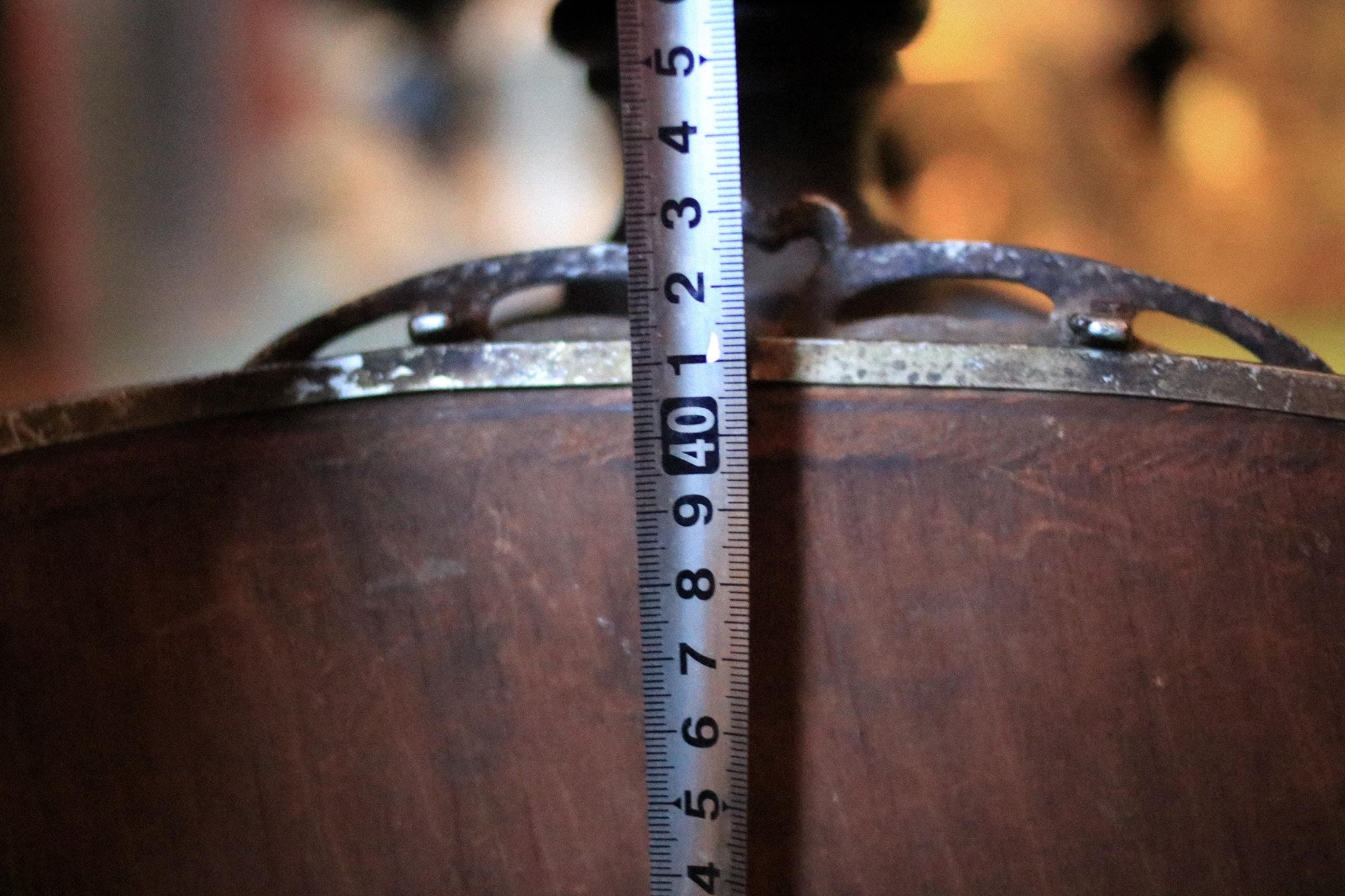 Measurements: 43 x 68 cm (approx. 16.9 x 26.8 in). Hanging chain is attached and the mirror is ready to display. Condition shows gentle age-related wear and light surface marks commensurate with use, along with scuffs/marks to the backing—nothing that stops it looking stunning on the wall.