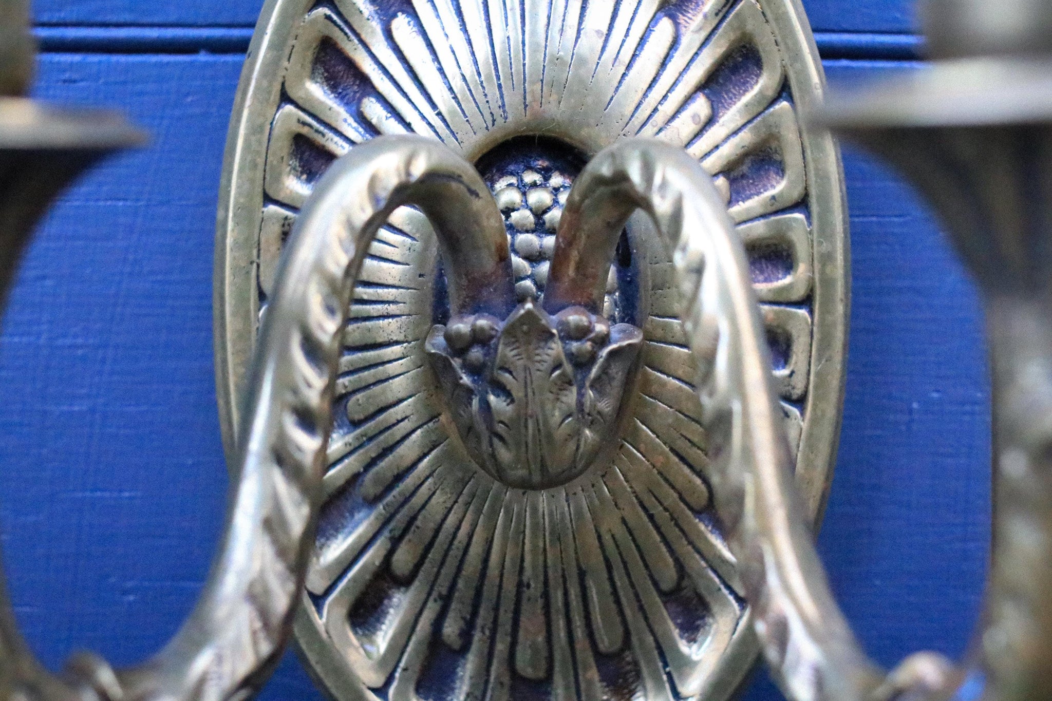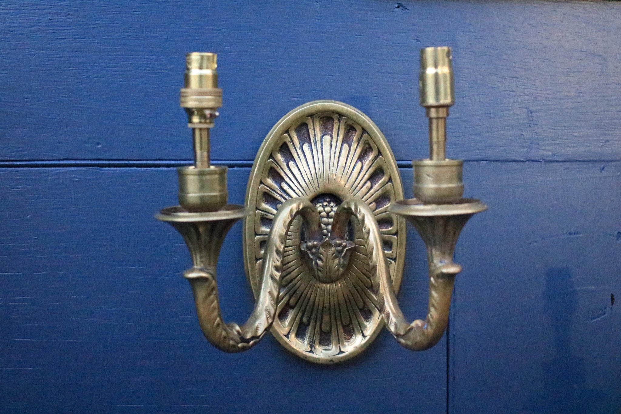 A striking matched pair of vintage two-light wall sconces in a warm brass finish, with bold Egyptian Revival / Neoclassical styling. Each sconce has an oval backplate with a fluted sunburst/fan detail and a sculptural ram’s head centrepiece, with two curved arms and candle-style drip cups. They look incredible styled as statement bedside lights, flanking a mirror, or bringing a bit of “old world” drama to a hallway — very much on-trend with the current Hollywood Regency / maximalist comeback.