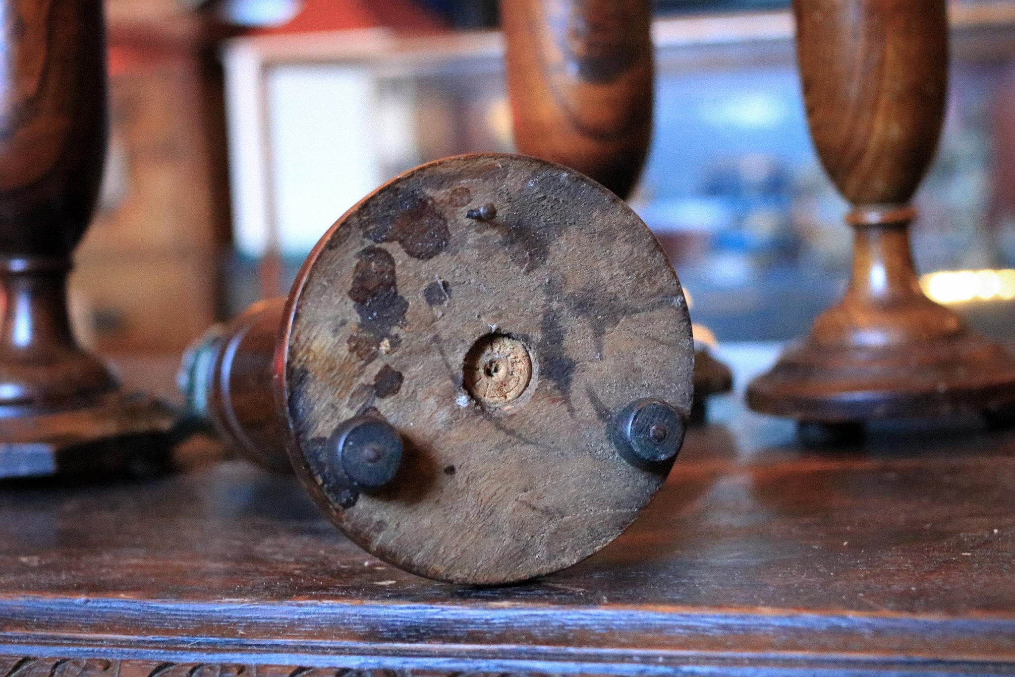 Condition notes: one candlestick has had a foot replaced with a nail (visible on the underside), and two of the bases are a different shape to the other two, as shown in the photos. Expect typical age wear and patina to the wood and metal, including small marks and surface character consistent with vintage/antique pieces.