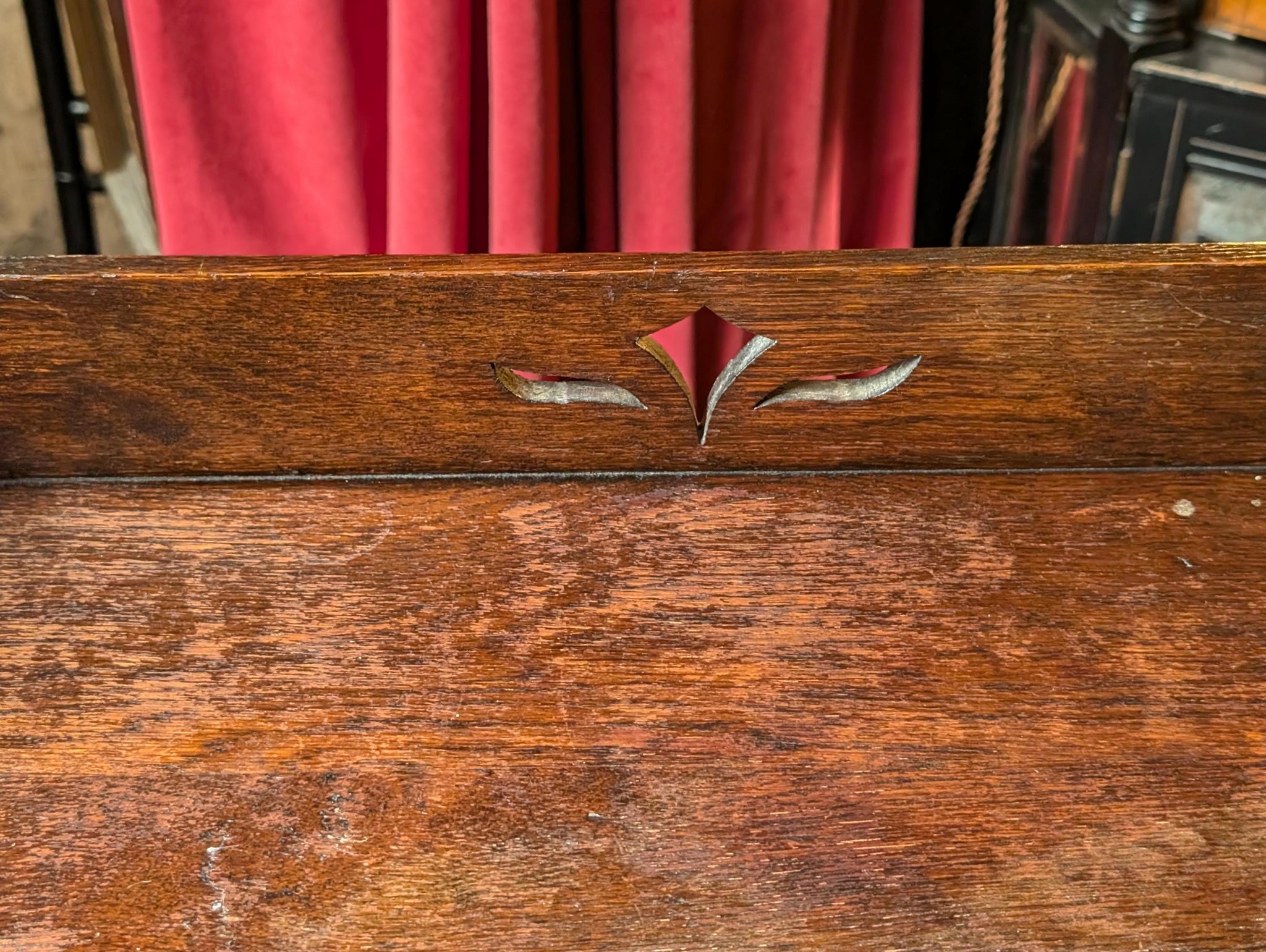 A beautifully simple and honest oak bookstand in the Arts & Crafts tradition, dating to the early 20th century. Made with clean, angular lines and a subtle decorative flourish to the backrest, this piece carries the unpretentious charm of utility elevated by craftsmanship.