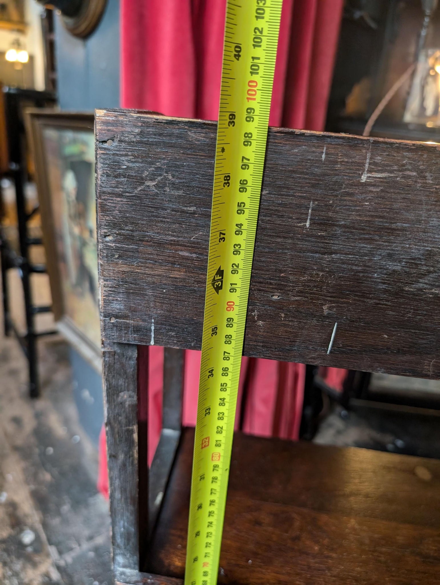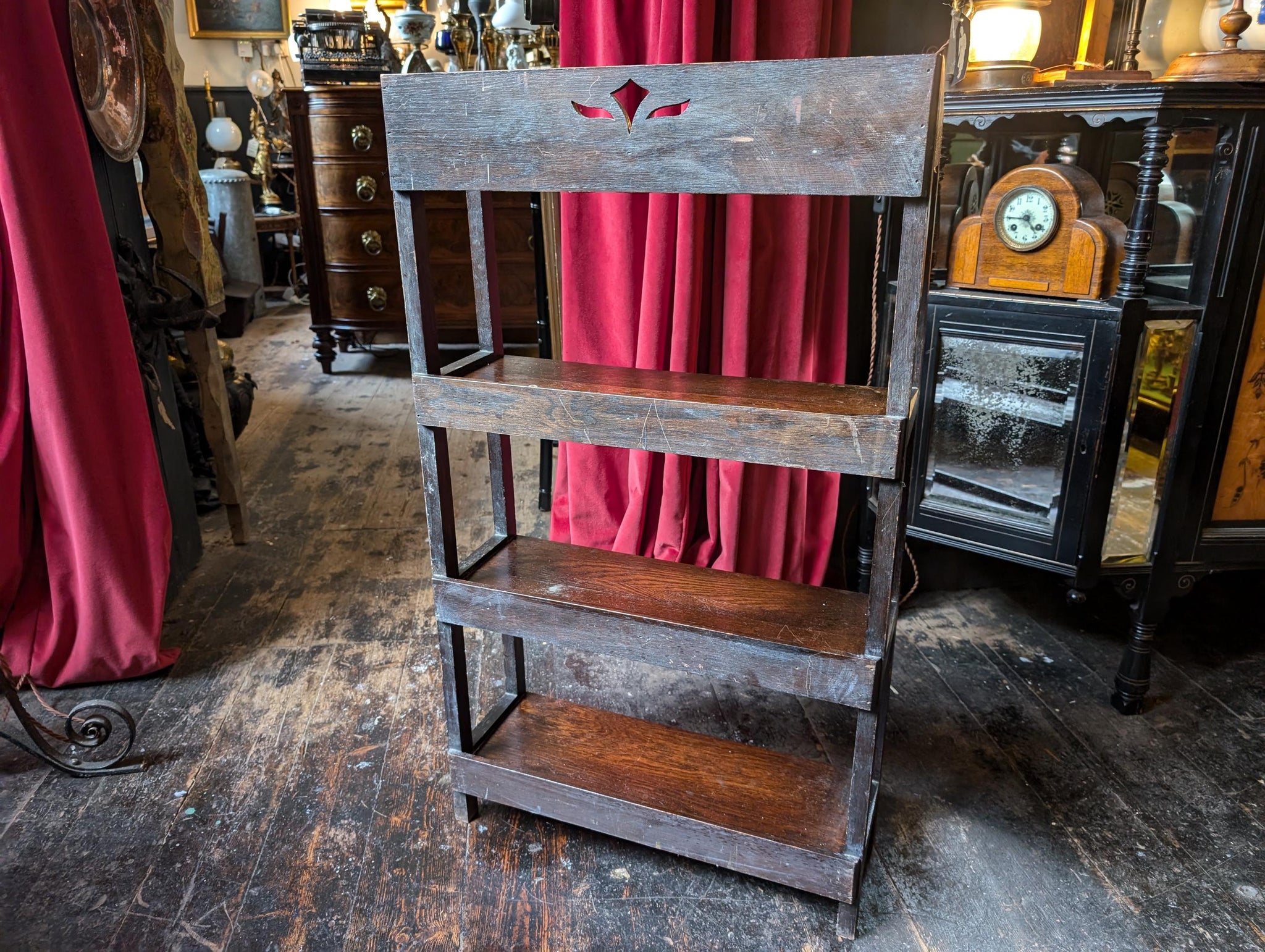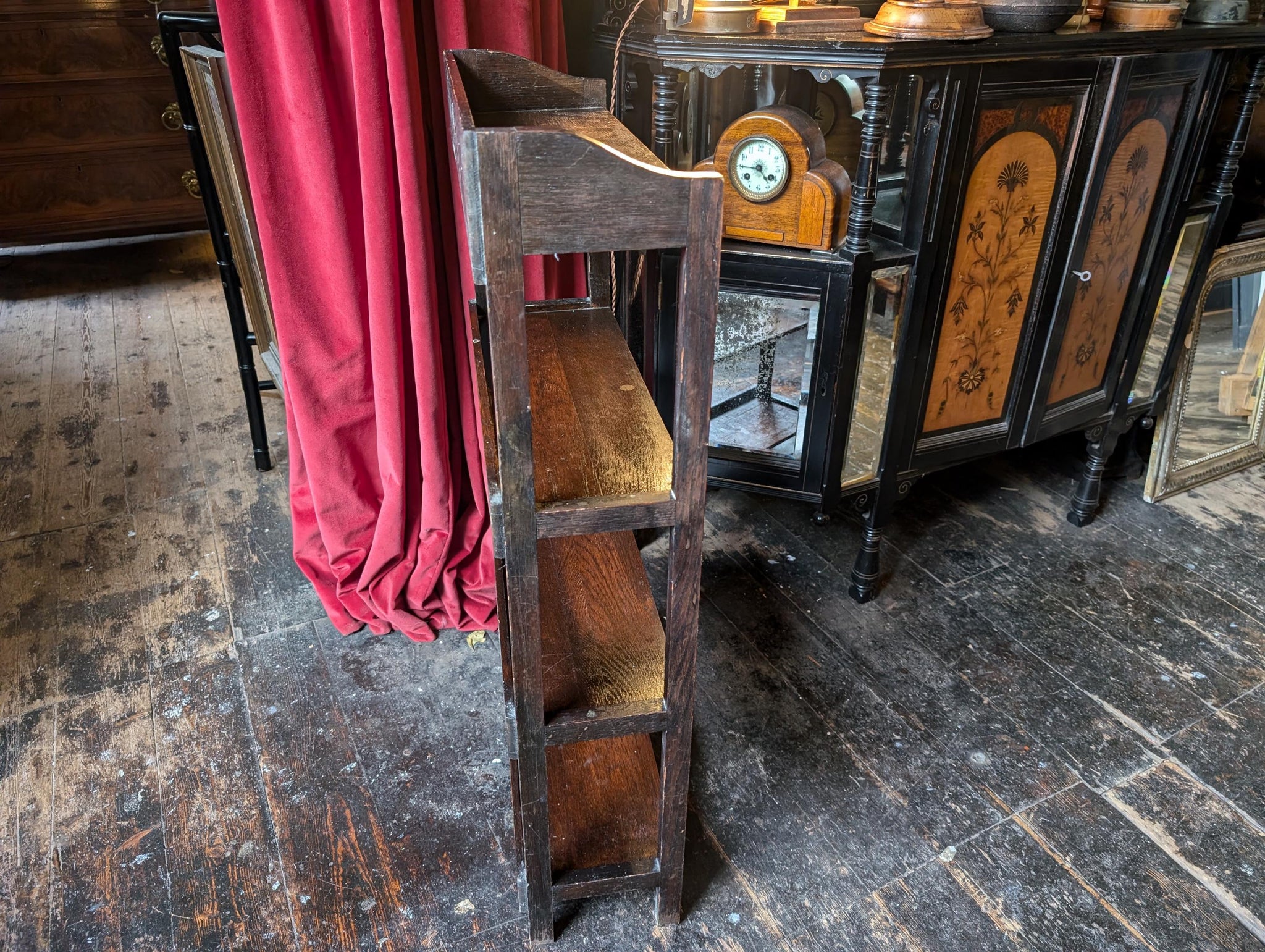 The four shelves are practical and well-proportioned, offering plenty of room for books, plants or curios. Constructed in solid dark oak with visible hand-tooling marks and aged patina, it stands confidently on square tapering legs with no nonsense and no frills—just beautiful wood and good proportions.