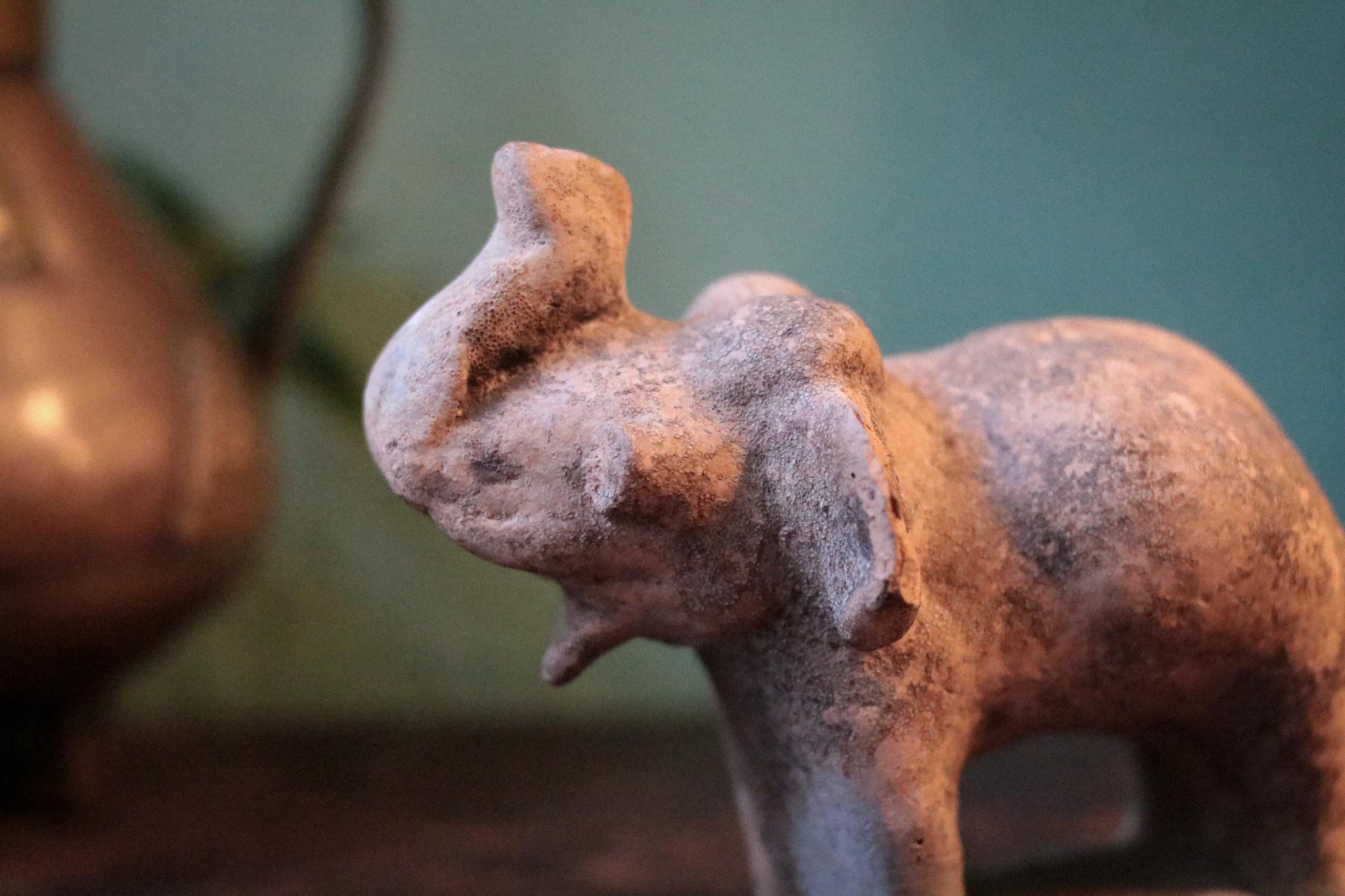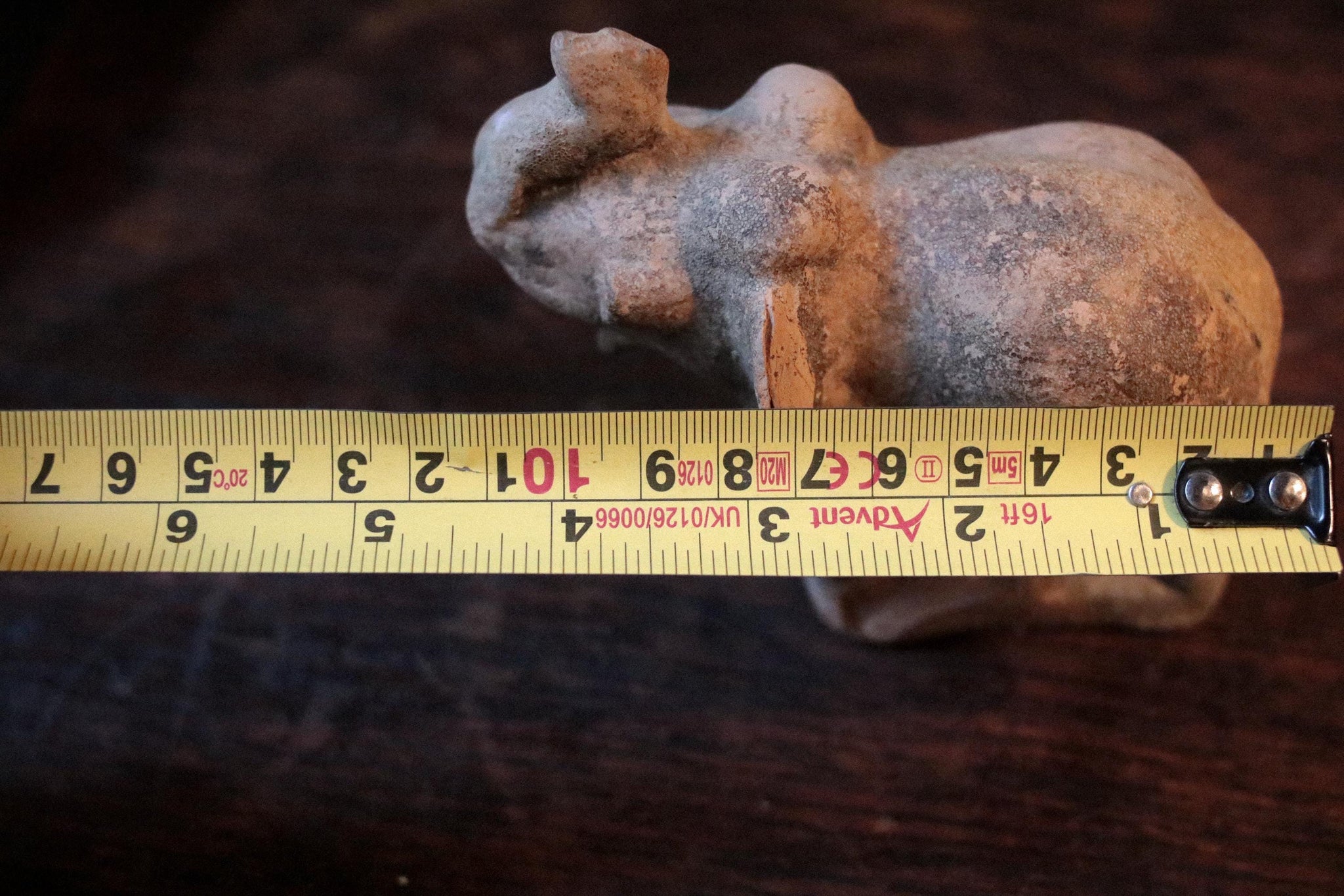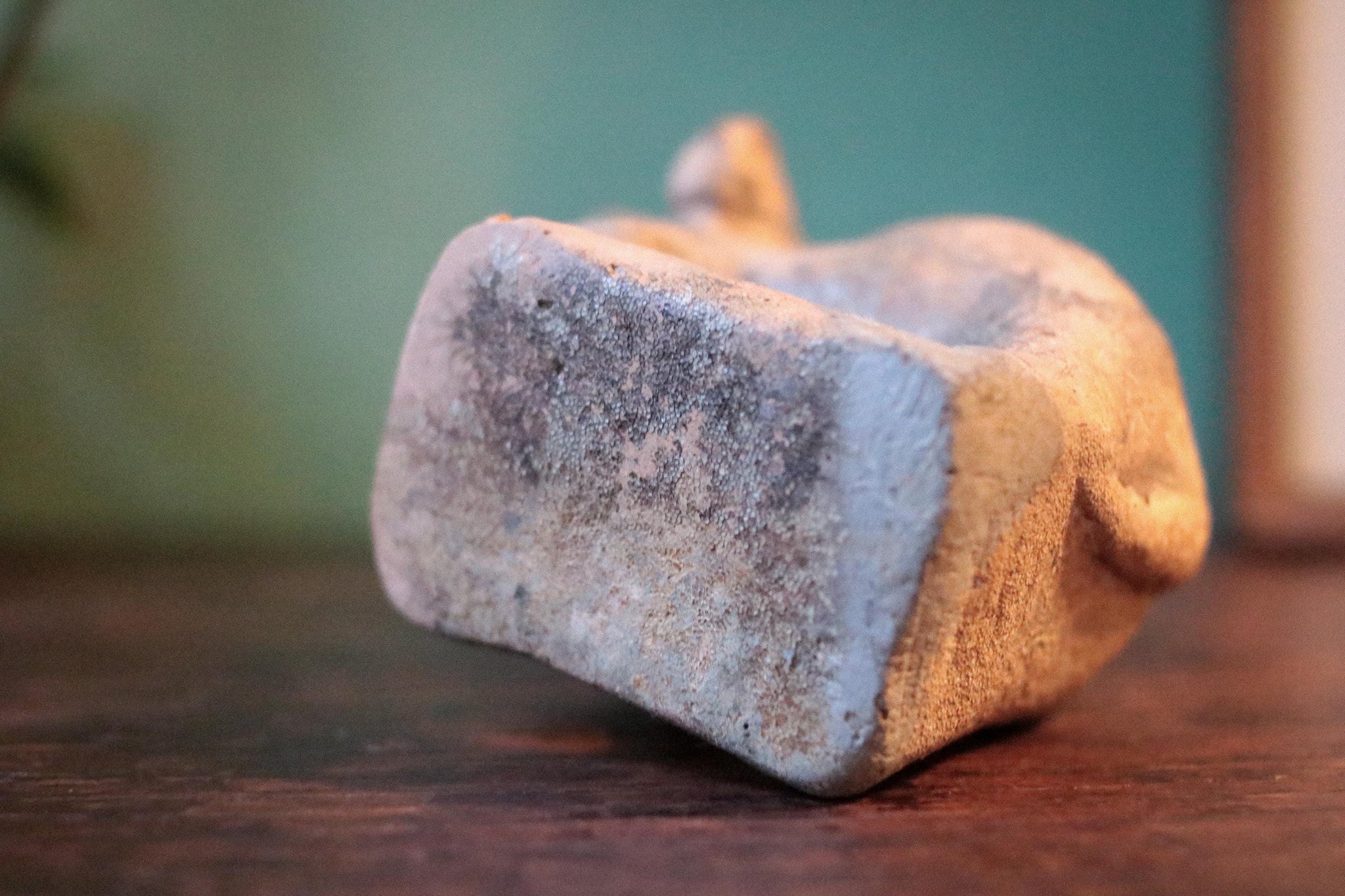 Warm mineral veining and age marks across the surface give it a gentle, timeworn feel. Expected small knocks and nibbles around the ears and base; stable and ready to place.