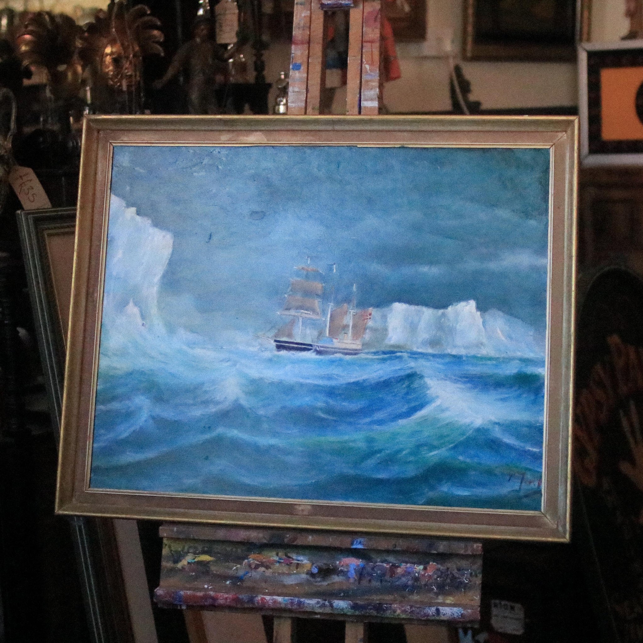 A dramatic marine oil showing a square-rigged clipper battling heavy seas with looming icebergs under a leaden sky. Painted with energetic, impasto brushwork in deep Atlantic blues and sea-spray whites, the picture has real movement and decor impact.