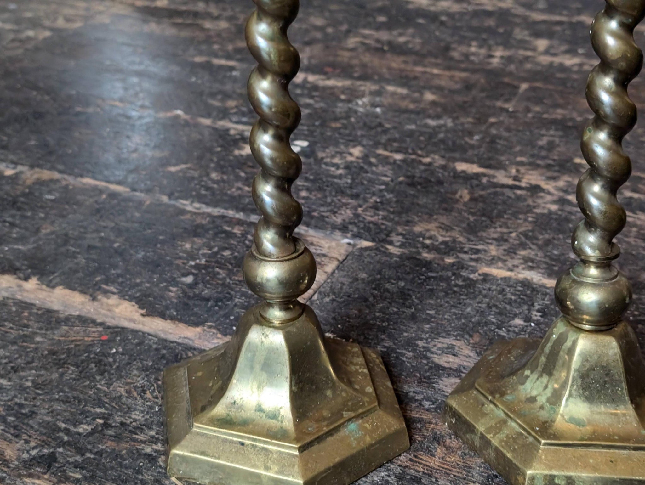 A handsome matched pair of tall brass candlesticks with barley-twist columns, wide drip pans and crisp hexagonal bases. English late Victorian to early 20th-century revival in feel, sand-cast with good weight and presence.