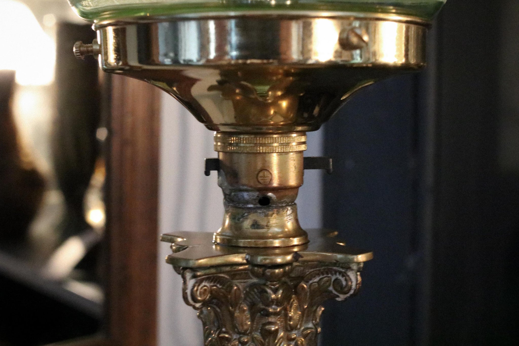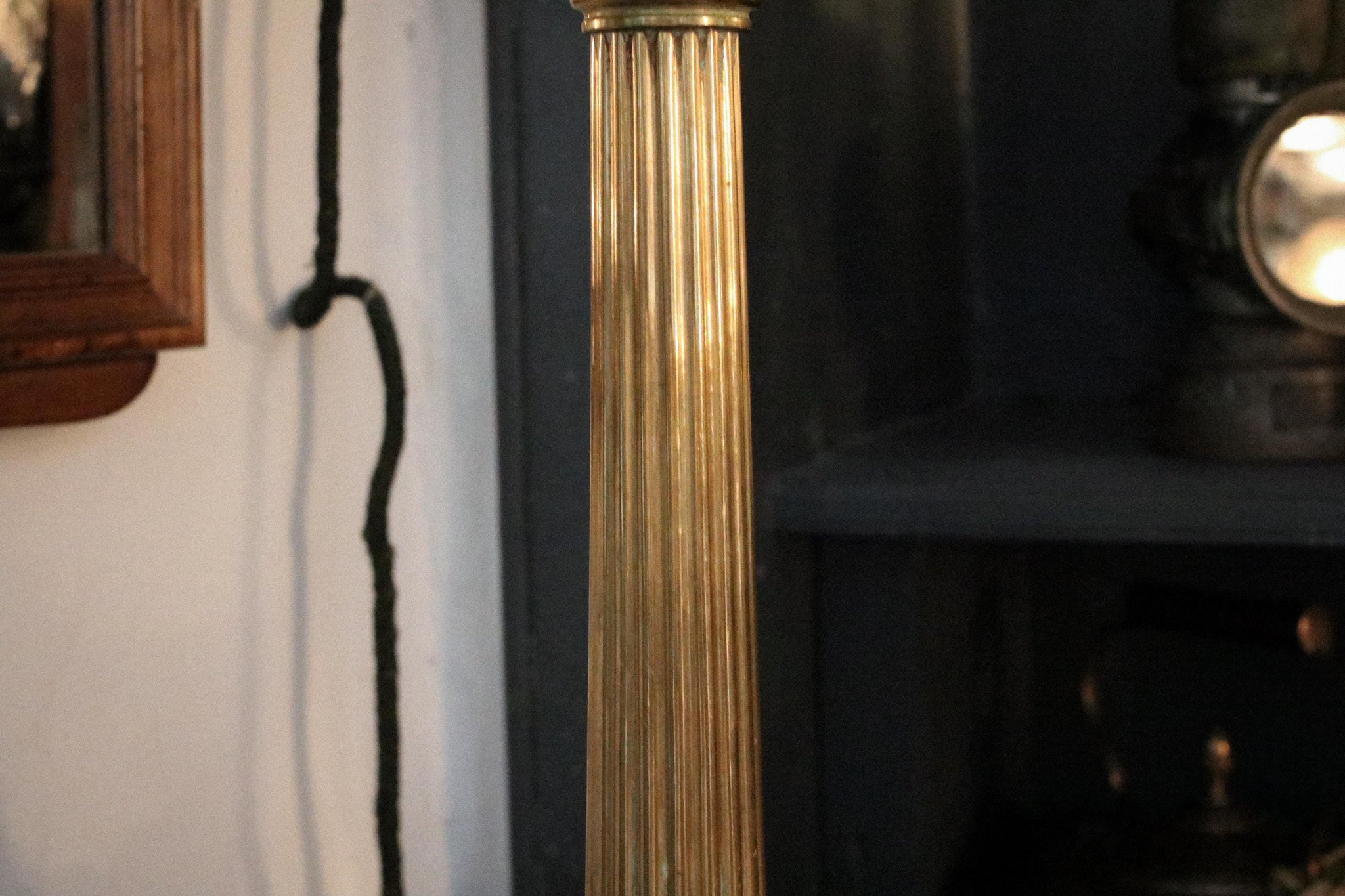 A striking tall brass column lamp dating to the 1930s, featuring a beautifully fluted Corinthian-style stem and an elegant stepped base. The piece is topped with a geometric pale green glass shade, subtly etched with a grid pattern and finished with gold banding—bringing a touch of Art Deco refinement.