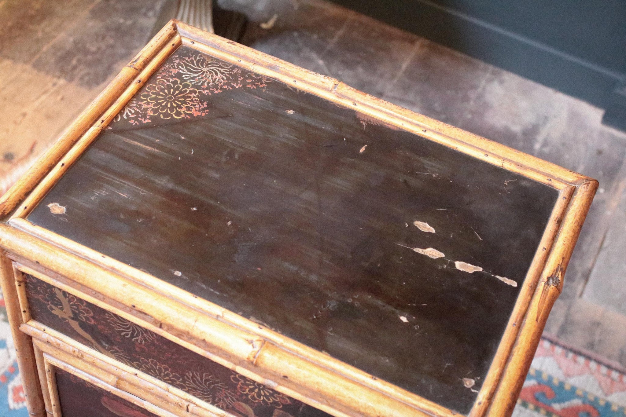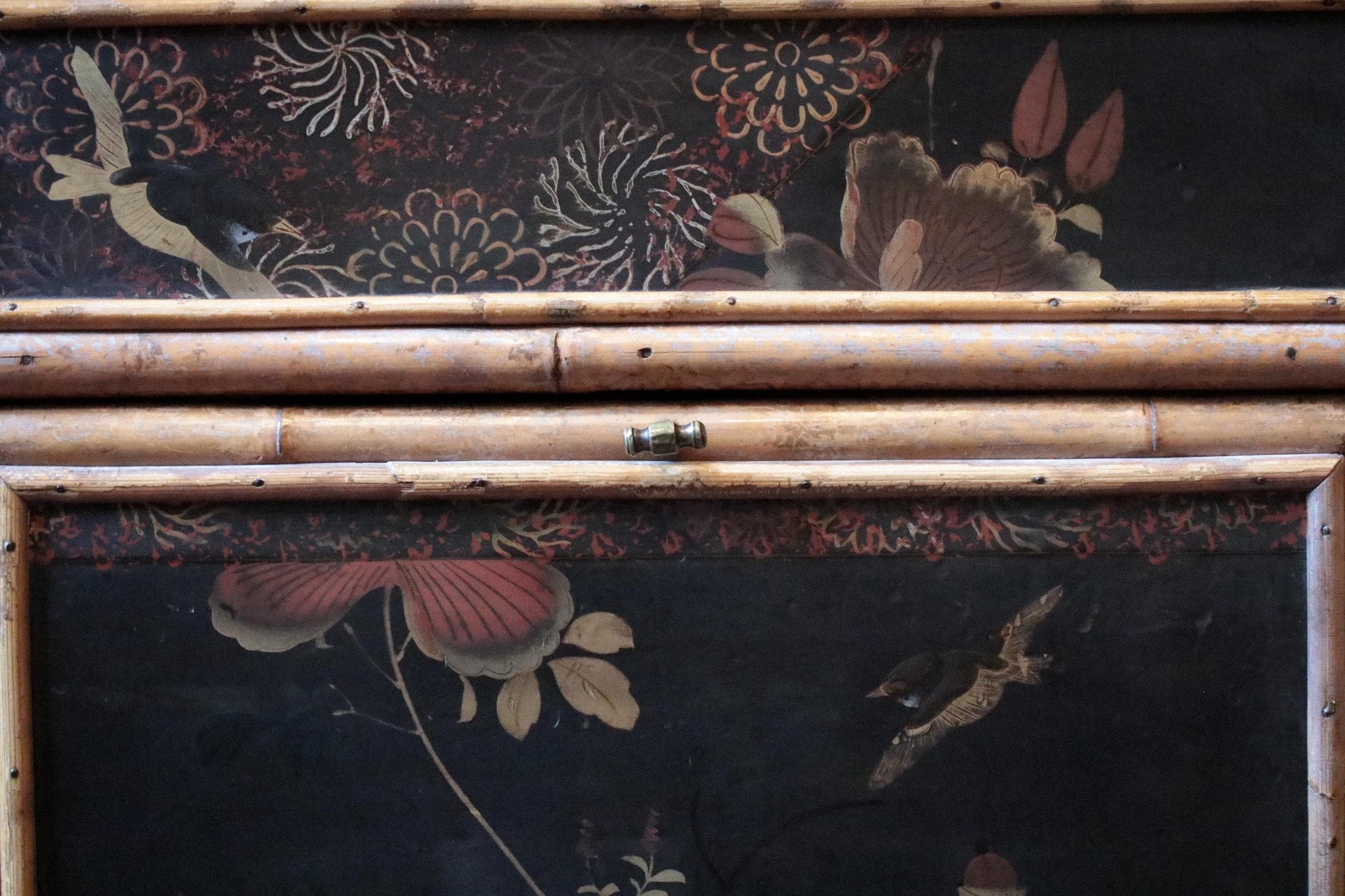 Honest age throughout: small knocks, scuffs and lacquer wear to the bamboo; rubbing and marks to the Japanned panels; the drop-front glass shows a visible diagonal crack as photographed; lining with expected wear. Presentable, sturdy and ready to place.