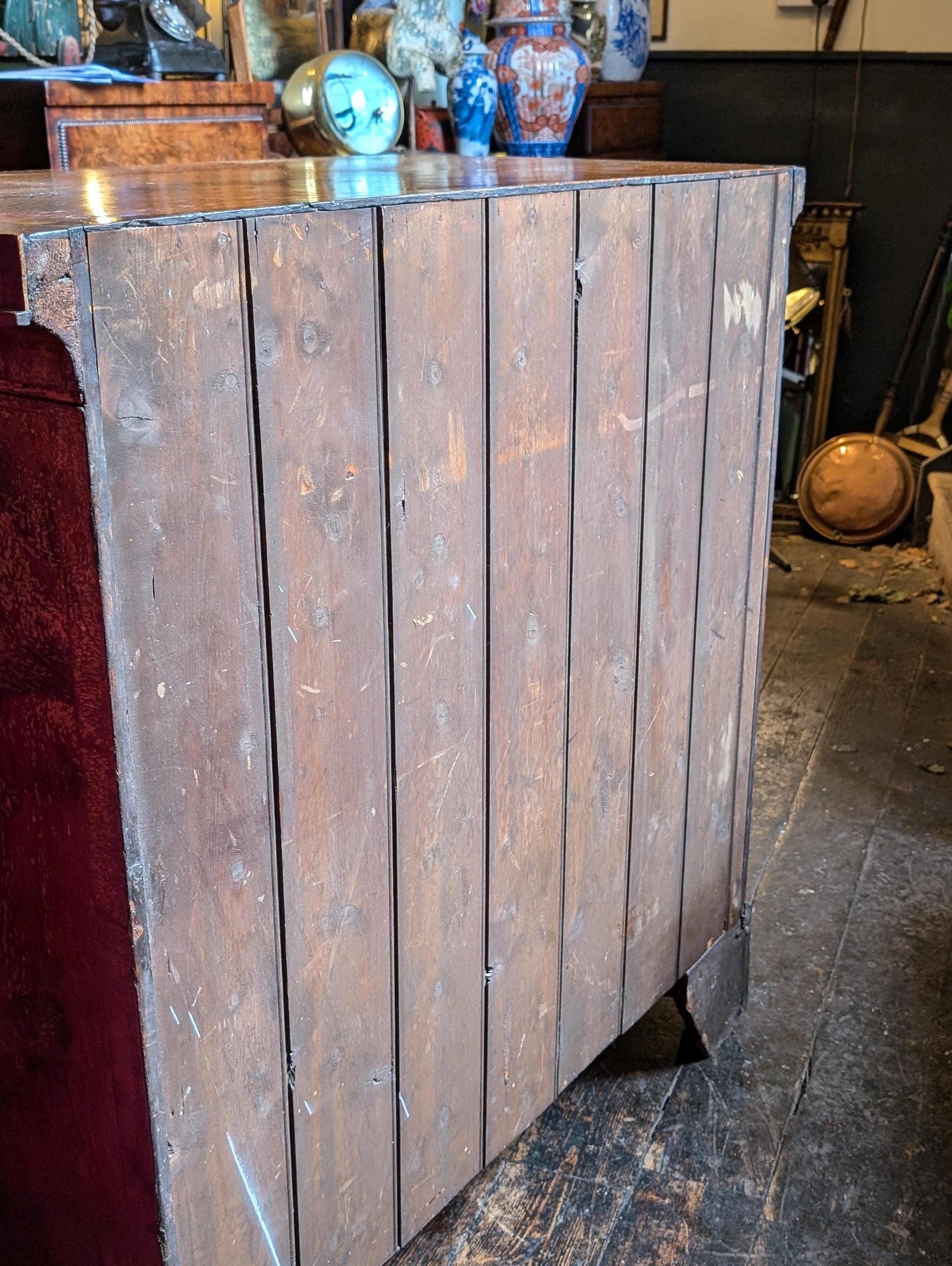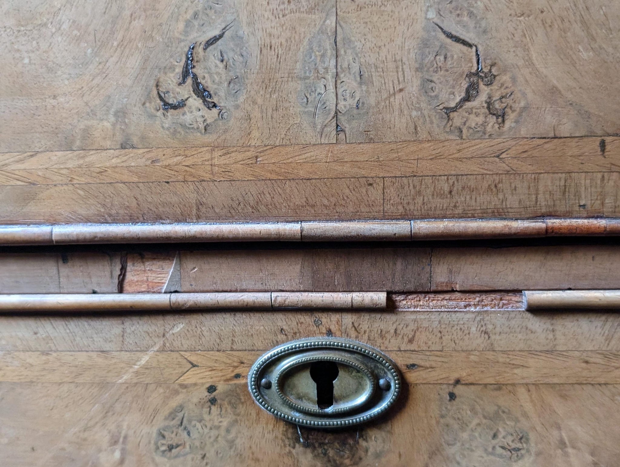Structurally sound and all drawers run smoothly. Veneer losses and chips in some areas, particularly to the turned mouldings and around the lower plinth (see photos). Surface marks and signs of age throughout. Offered as-found for lovers of authentic antique character. A piece is missing off one of the back feet.