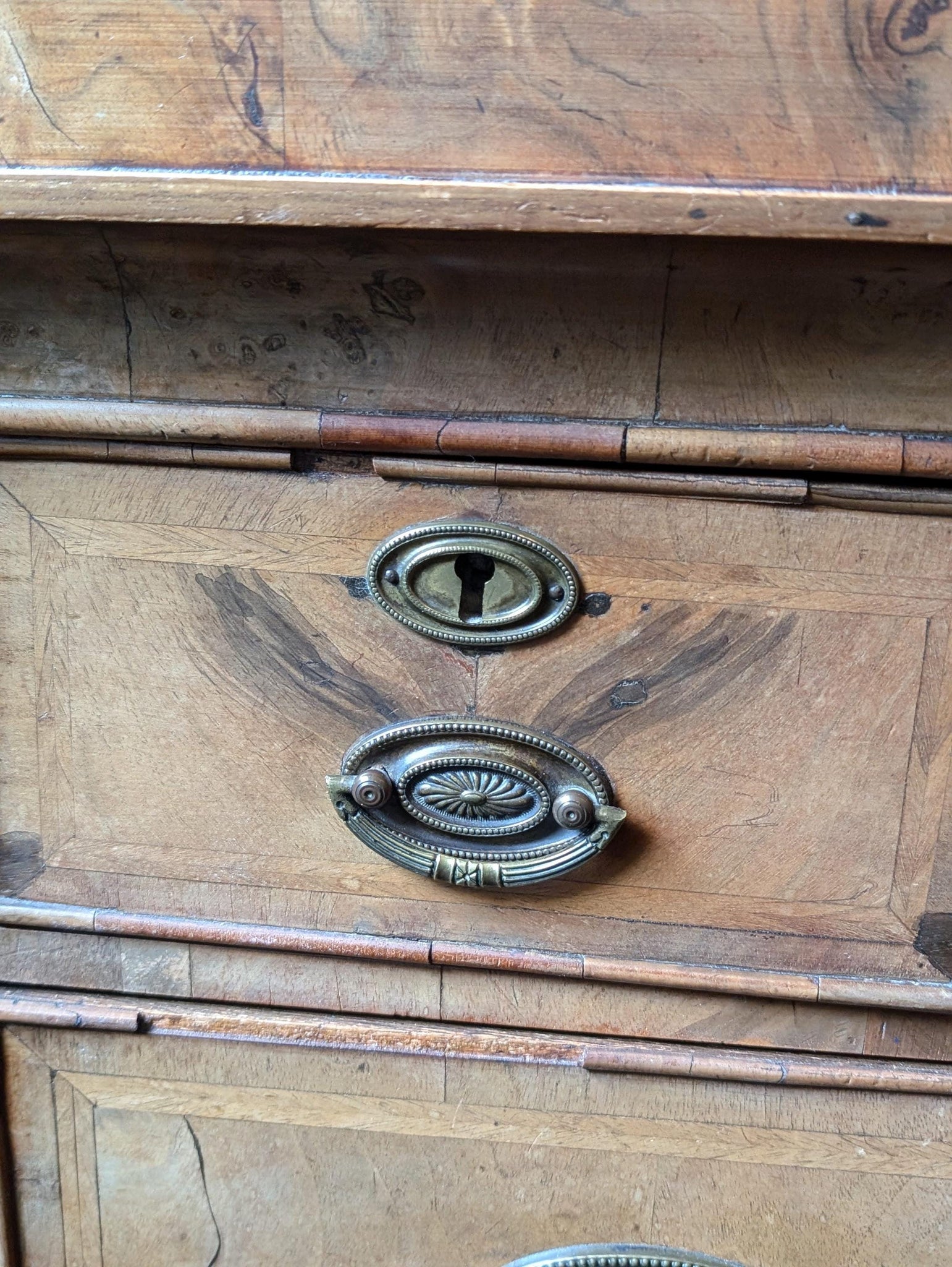 A striking 19th century burr walnut chest of drawers, richly figured and full of antique character. This Victorian-era piece features a classic configuration with three short drawers over three long drawers, all dressed with oval brass backplates and drop handles. The drawer fronts are adorned with bookmatched burr walnut veneers, showcasing gorgeous swirling grain patterns and natural symmetry.