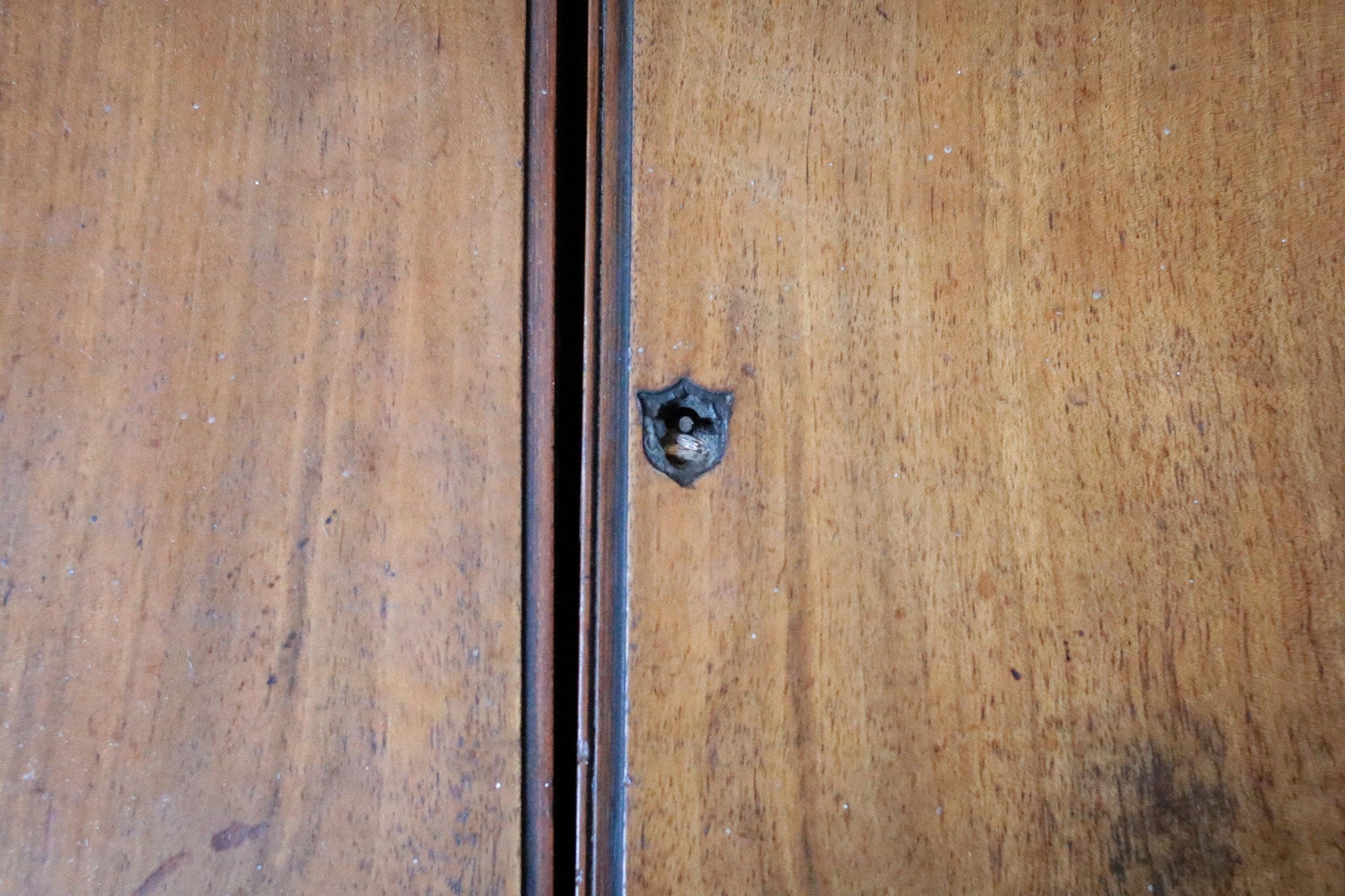 A handsome late-Victorian stationery cabinet in warm mahogany, the sloped twin fall-fronts opening to reveal tiered wavy-edged letter racks, a long pen tray and the original square glass inkwell with “London” cap. Both doors have the classic criss-cross ribbon retainers for notes and visiting cards. Compact and useful on a desk or console, it’s the perfect “old money” library accent that still works hard for modern post, bills and tech clutter.