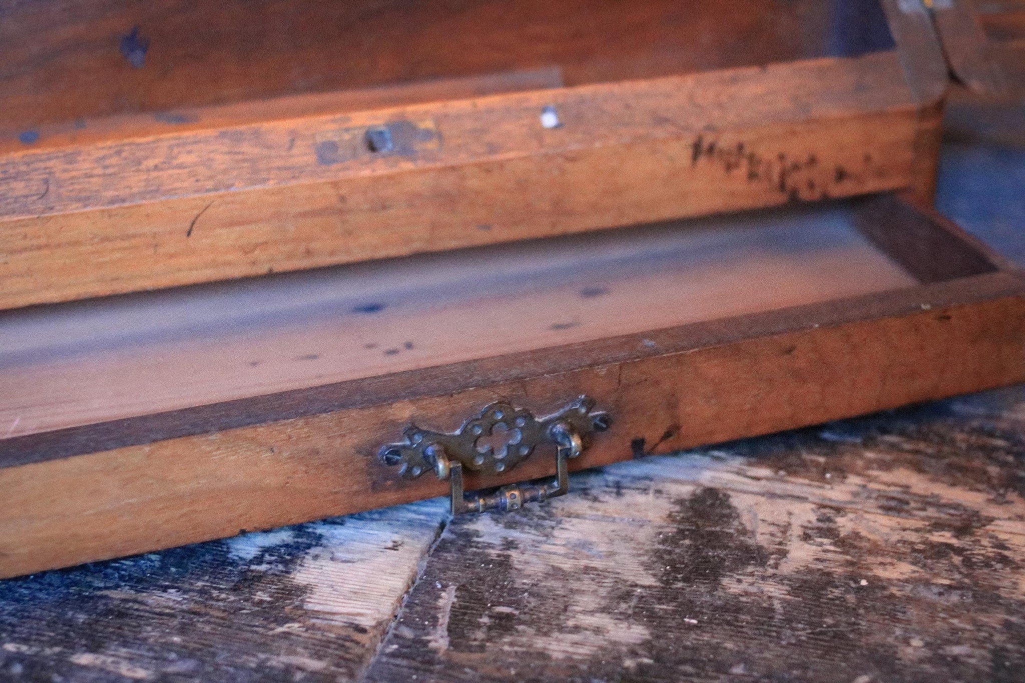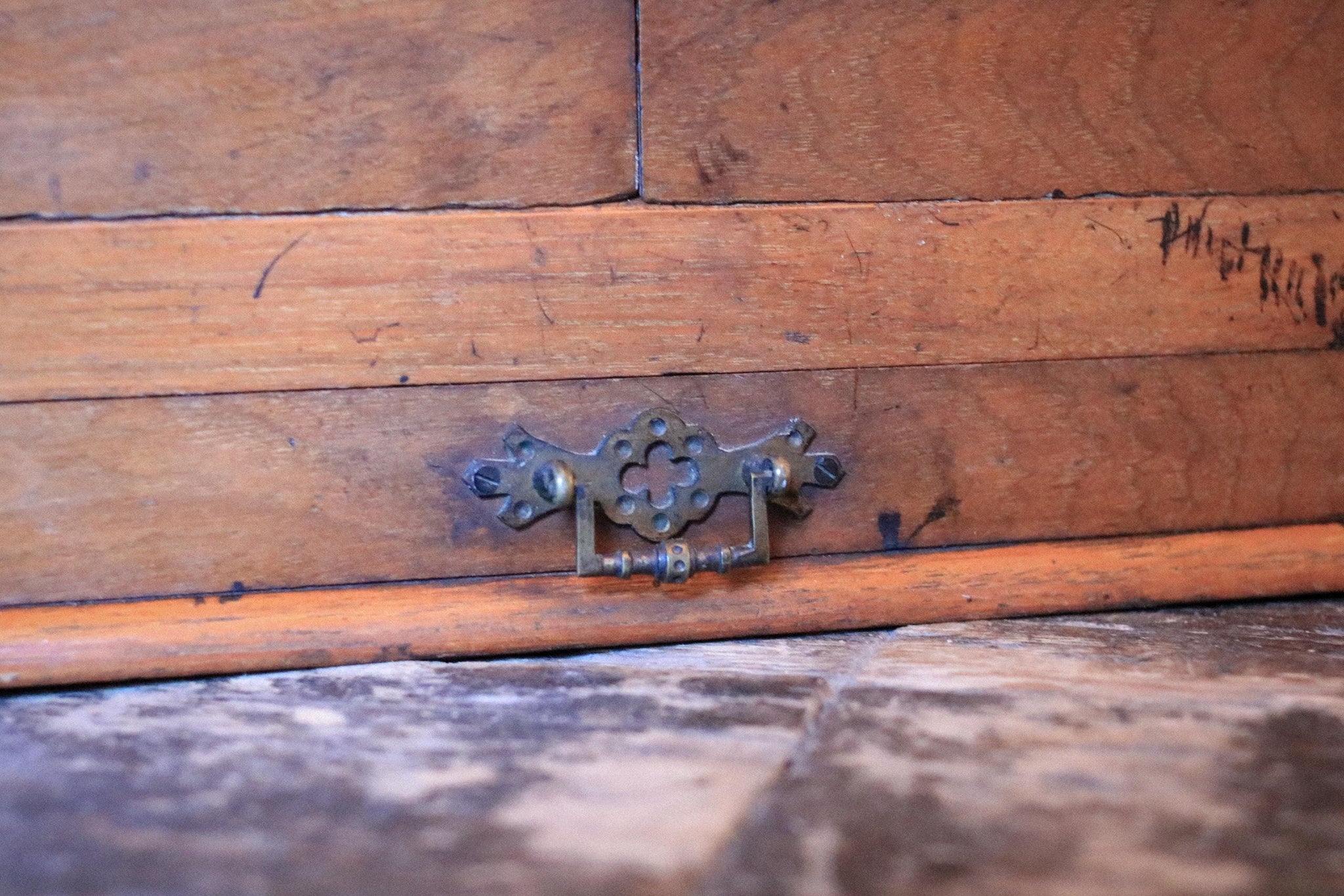 Condition is honest and decorative: surface marks, old ink specks and age toning throughout, wear to the leading edges, no key for the lock, the left door shows the original pin-and-ribbon memo board with the ribboning perished, and the right door retains its little picture/motto frame with age to the paper. Solid, clean and ready to use.
