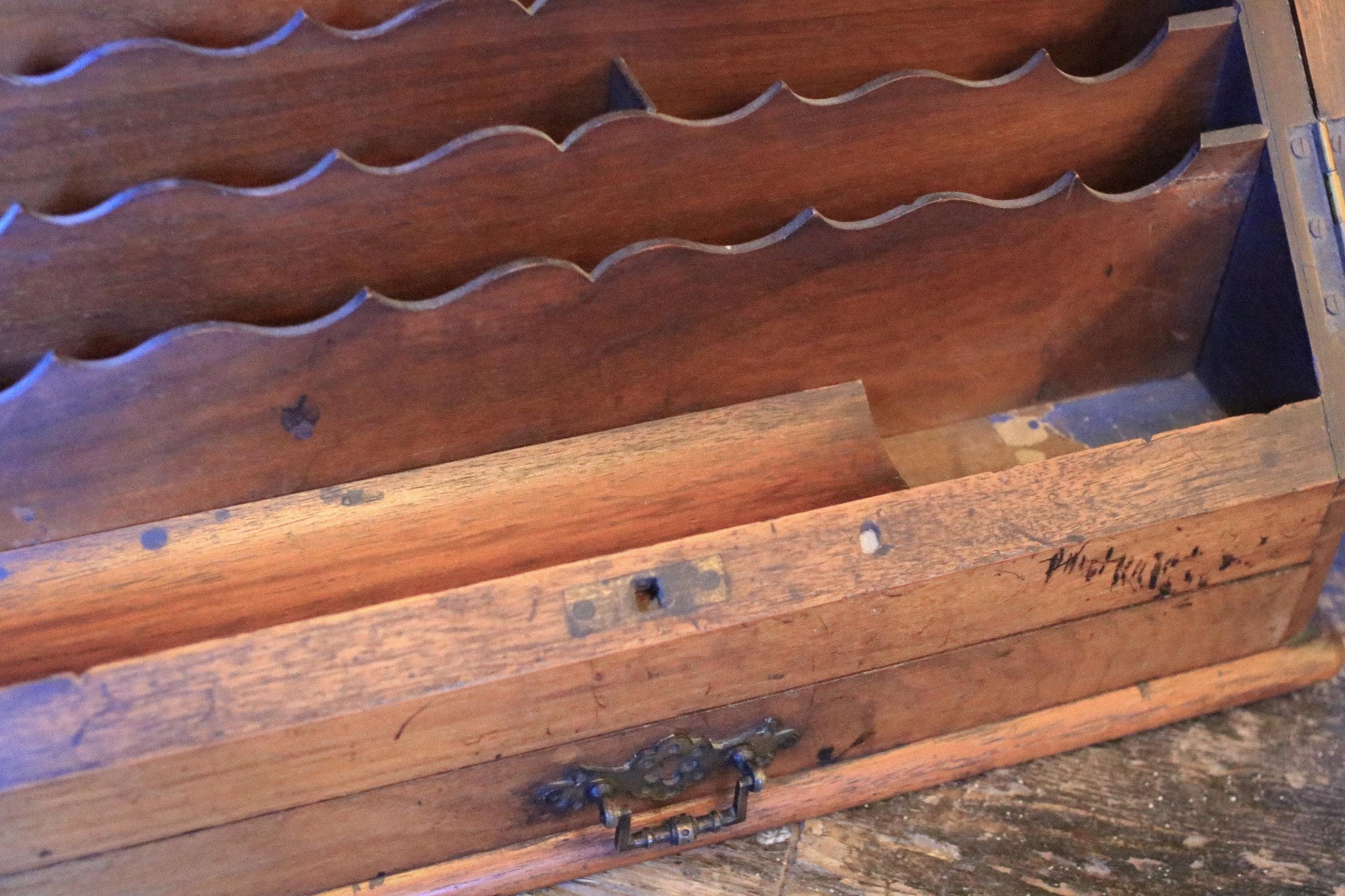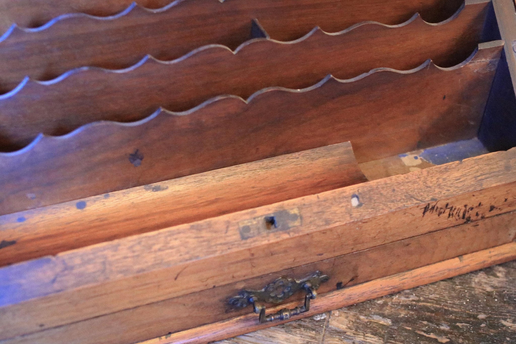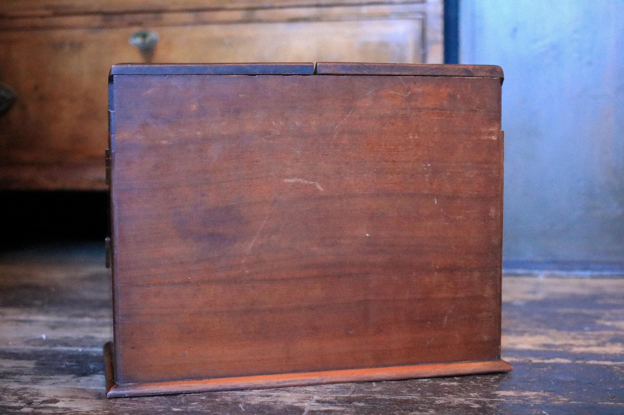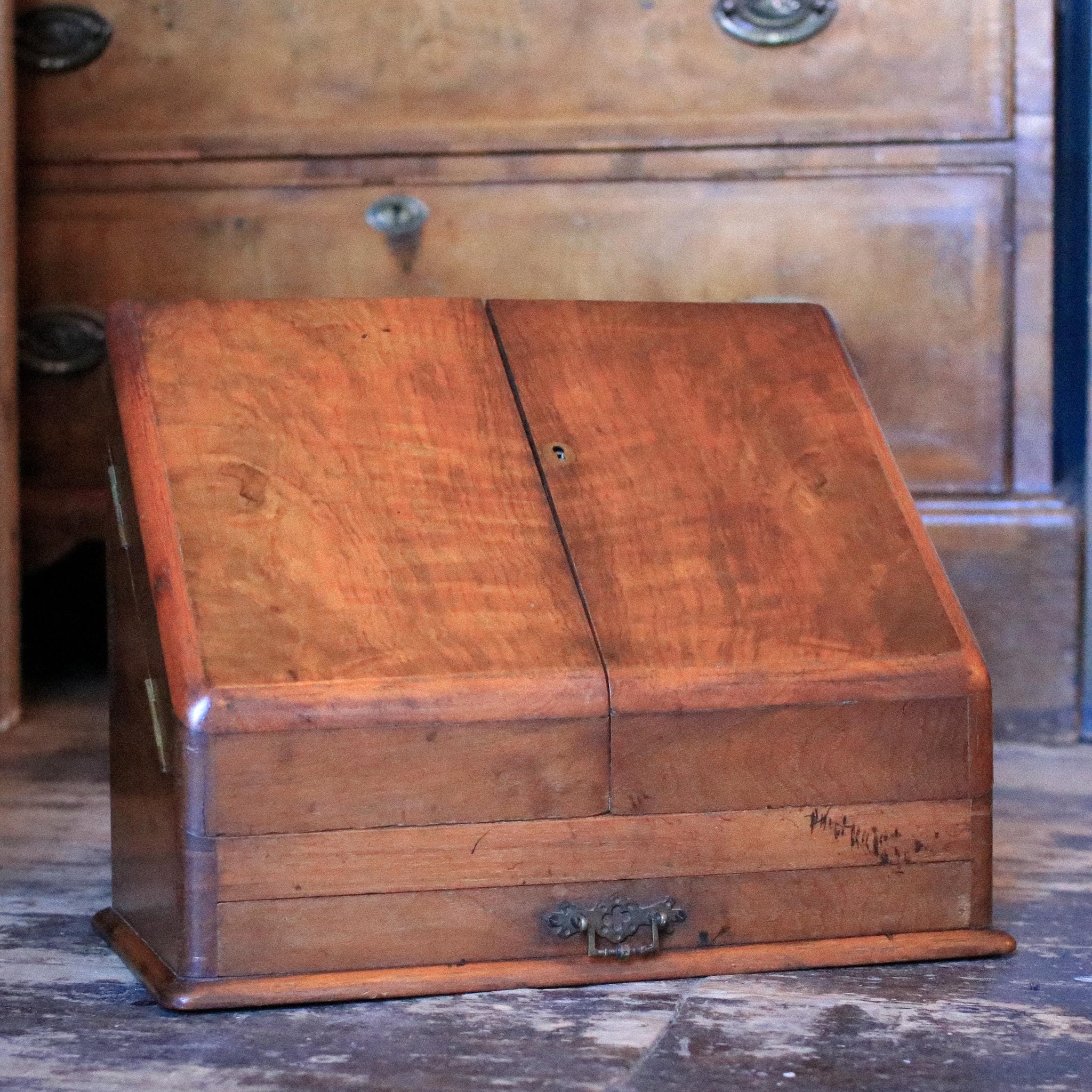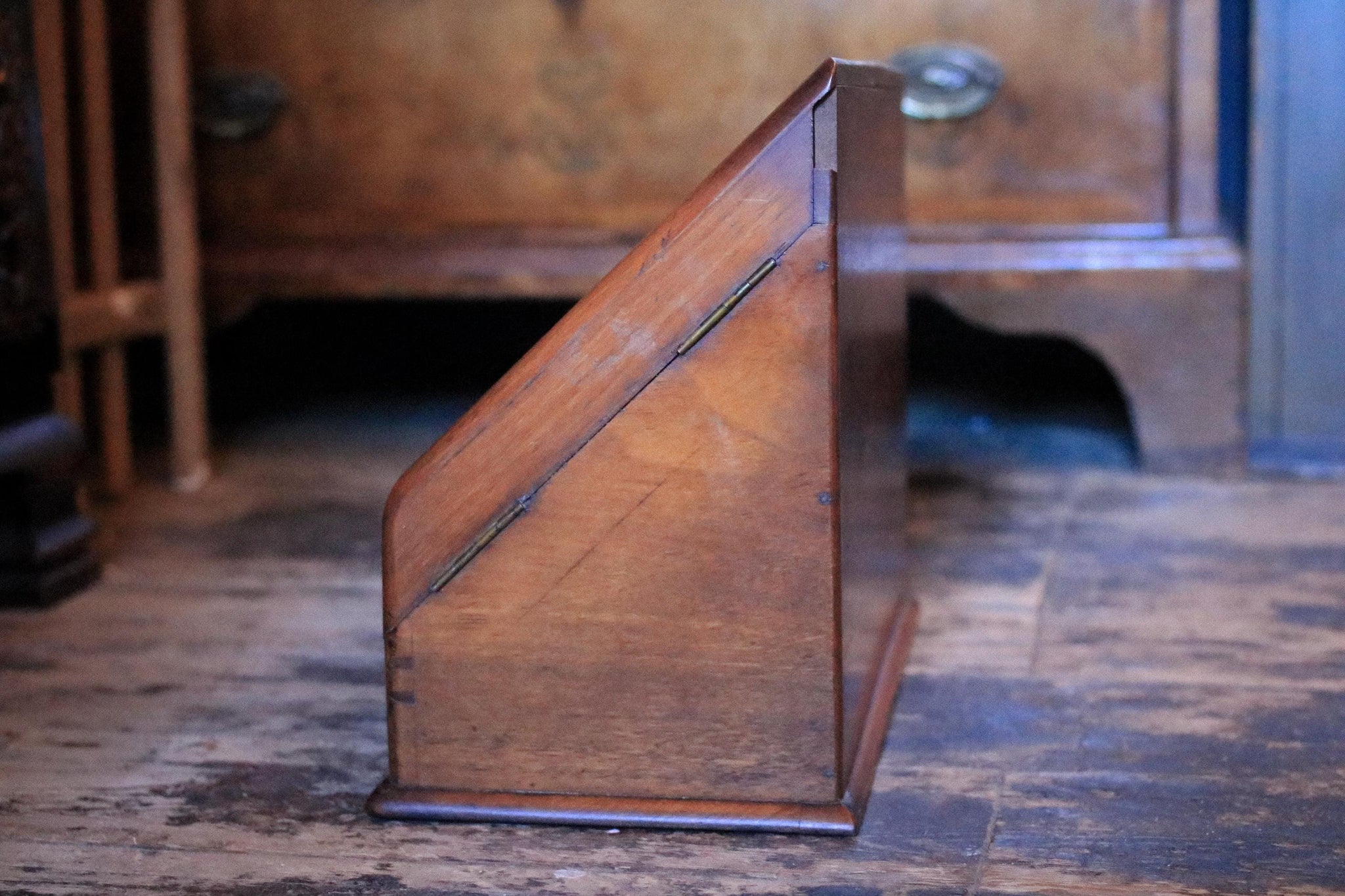 Handsome late-19th century stationery cabinet in figured mahogany, the sloped front opening in two halves to reveal five graduated, scalloped letter racks with a long pen tray to the front and pocketed panel doors. Classic brass carry handle and catch to the lower frieze, with the original fitted interior surviving nicely. A superb desk companion for mail, bills and notebooks, equally good as a charging station or hallway organiser for keys and post.