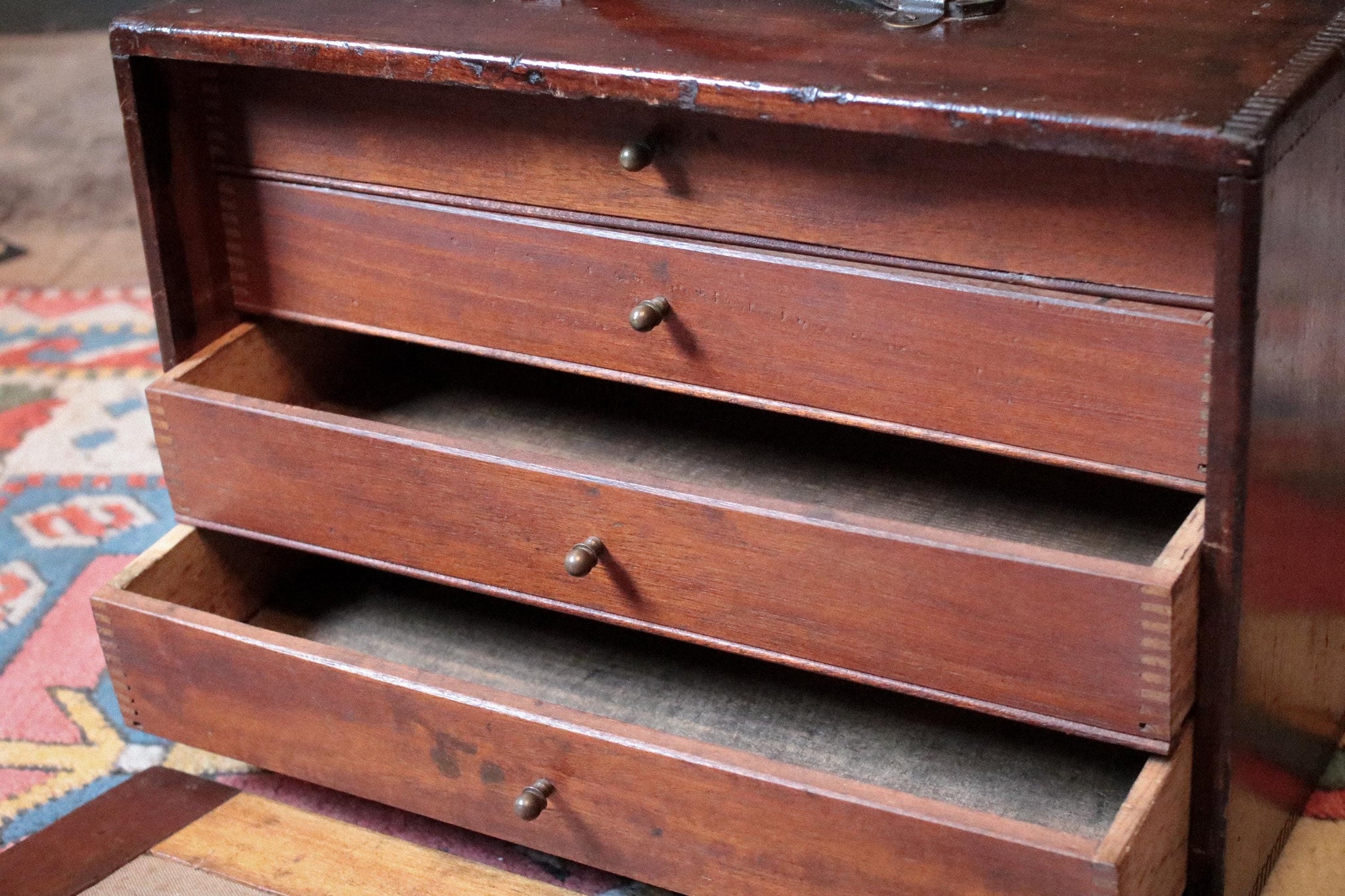 Lovely late 19th / early 20th century portable tool or instrument chest in solid timber with a warm old finish, fitted with a leather carry handle to the top and a fall-front locking door that reveals three long internal drawers. The carcass is dovetailed at the corners, the drawers are finely made and still run smoothly, and it has its original little turned knobs in a mellow brass/wood tone. The scale and layout suggest it would have travelled with a working professional – machinist, watch repair, draughtsman, possibly even medical or scientific instruments – rather than being a domestic jewellery box. It has that proper gentleman’s kit / campaign energy.
