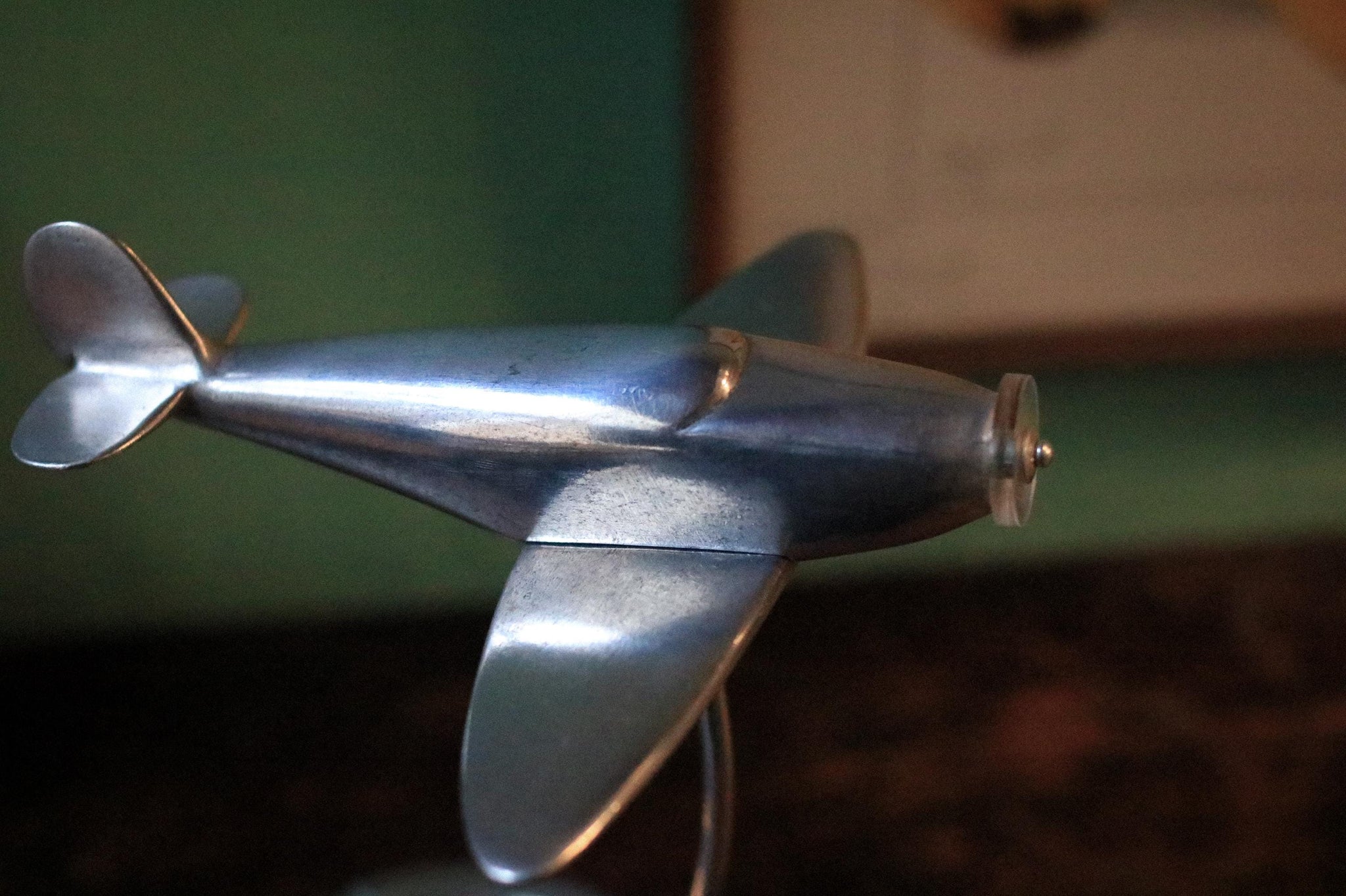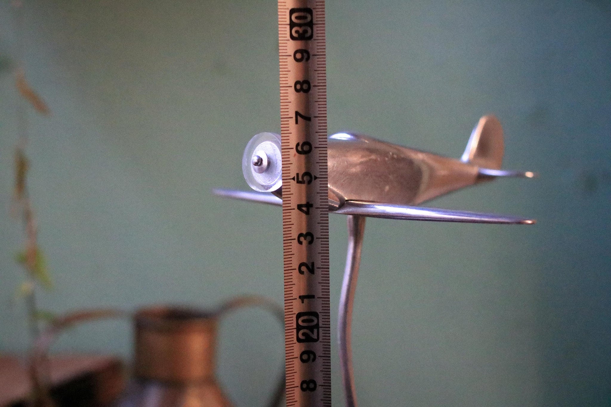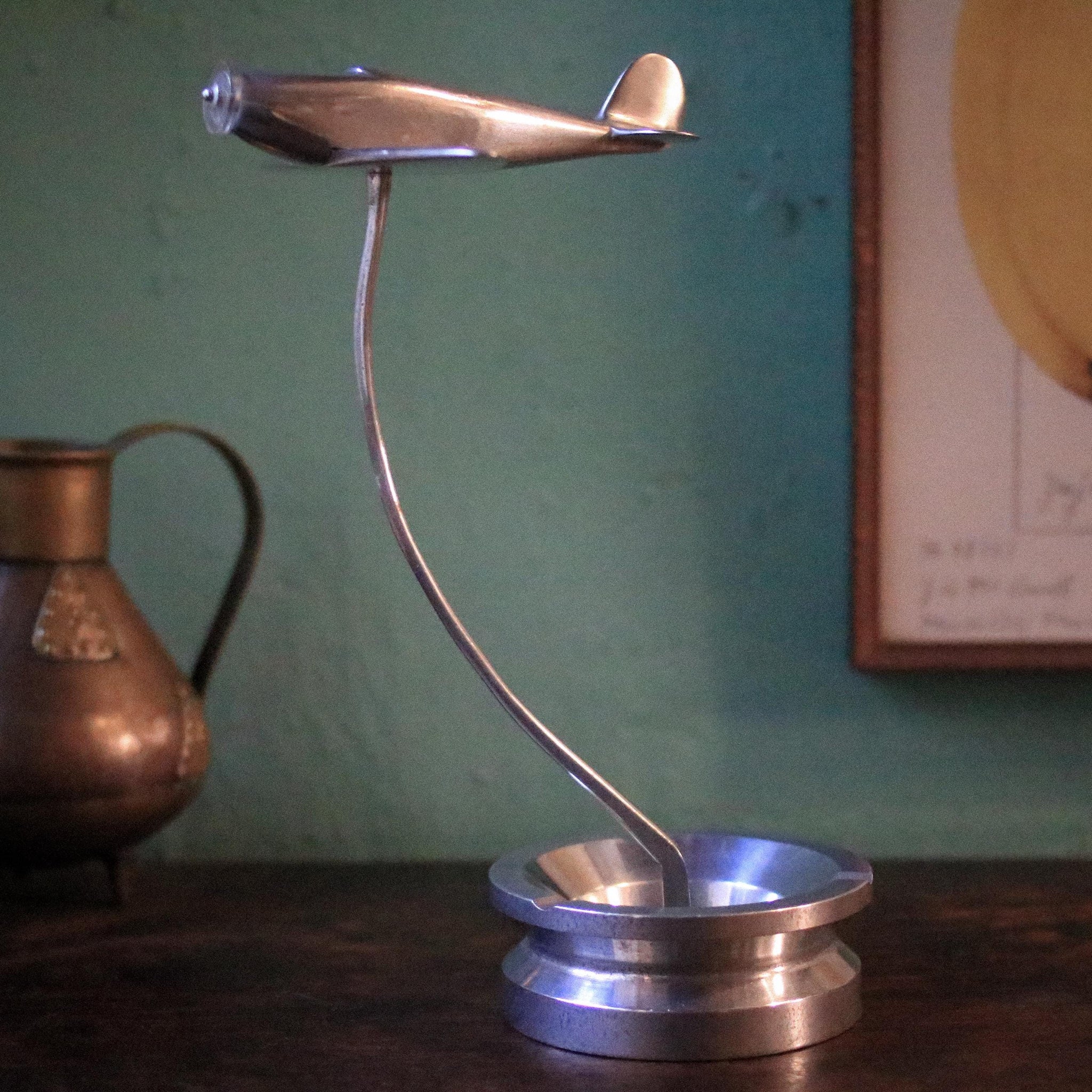 A striking, sculptural metal ashtray with a sleek airplane form perched on an elegant curved stem, rising from a solid, machined bowl base with three rests. It has that clean “Jet Age / Space Age revival” look that’s trending hard right now for offices, studios, and cocktail corners—works brilliantly as a desk object even if it never sees ash.